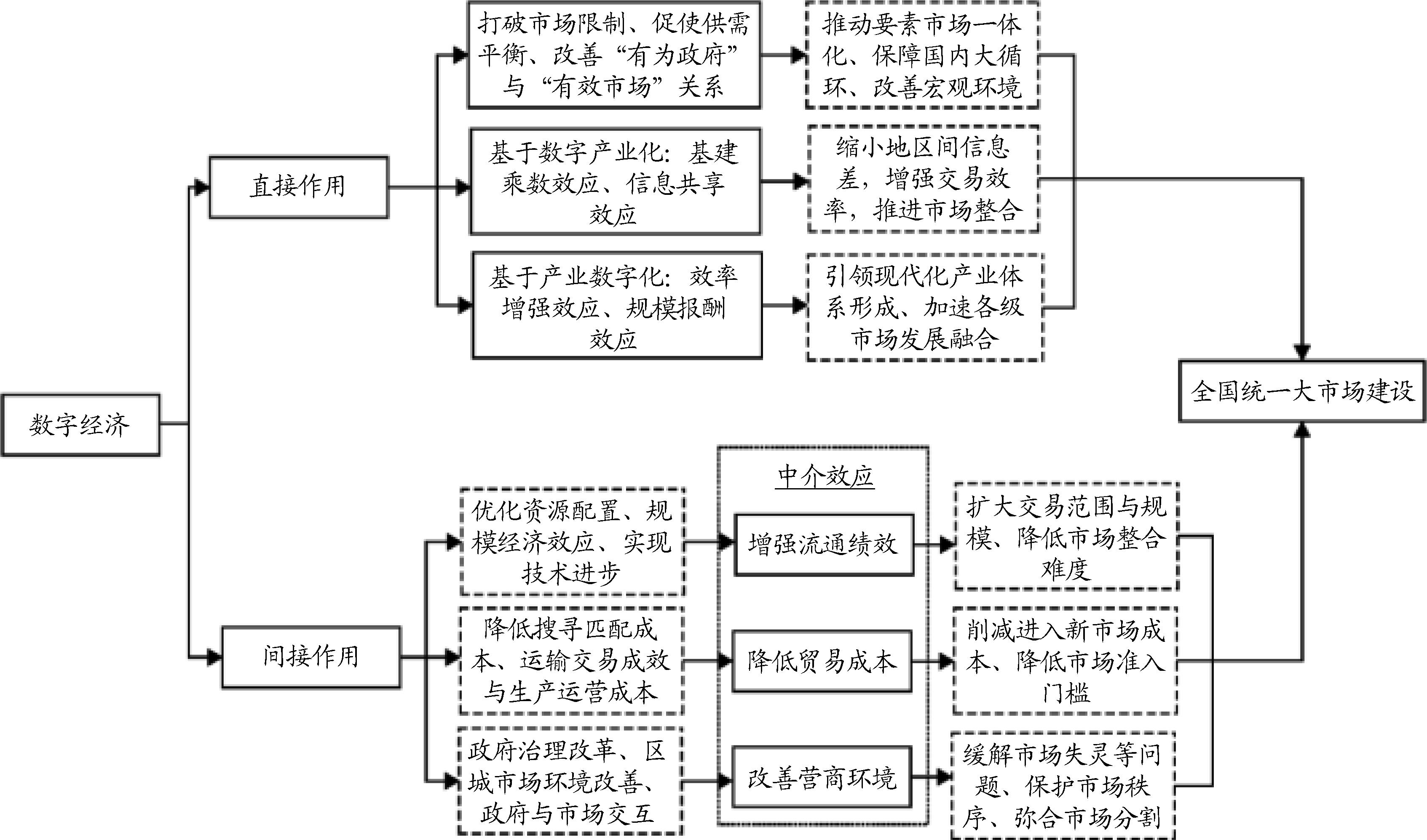 摘要:党的二十届三中全会强调,要构建高水平社会主义市场经济体制,构建全国统一大市场。建设全国统一大市场是发挥我国超大规模市场优势,畅通经济循环,保障新发展格局稳健形成的必由之路,而数字经济不仅为经济高质量发展注入强劲动力,也极大影响市场格局,成为全国统一大市场建设的重要力量。文章在探析数字经济对全国统一大市场建设影响机制的基础上,利用面板数据模型、面板门槛模型实证数字经济的线性效应及非线性效应,也借由中介效应模型,实证数字经济的间接作用路径。研究结果表明:第一,数字经济发展有利于全国统一大市场建设;第二,数字产业化、产业数字化均对全国统一大市场建设起到积极效用,相比数字产业化,产业数字化对统一大市场建设起到的促进效果明显更佳;第三,数字经济影响全国统一大市场建设的作用路径可集中于增强流通绩效、改善营商环境、降低贸易成本三方面,依据作用路径检验可得,数字经济通过三者正向影响全国统一大市场建设的作用机制成立;第四,数字经济对全国统一大市场建设的贡献存在自身门槛与全国统一大市场建设水平门槛,数字经济在水平中等时对全国统一大市场建设的促进程度较高,同时,当全国统一大市场建设水平较高时,数字经济对统一大市场建设的促进作用更显著。鉴于这些研究结论,从三个方面提出对策建议:第一,考虑到数字经济已然发挥出的强有力的助推作用,应积极探索以数字经济为动力基础,赋能全国统一大市场建设的新路径;第二,在夯实“数字基座”的同时,加速推动“两化协同”,使数字经济的正向效果发挥到最大;第三,释放平台经济发展动能,优化数字营商环境,助力数字经济持续健康发展的同时,发挥其市场整合效用。此研究,一方面,在数字时代背景下,厘清数字经济在全国统一大市场建设中的功效,将两者纳入统一理论框架,系统梳理数字经济所产生的直接影响机制与间接影响机制,为构建全国统一大市场提供新的研究视角与理论观点;另一方面,实证检验数字经济对全国统一大市场建设的正向影响与间接作用路径,为充分发挥数字经济的促进效应提供实证证据和政策建议。