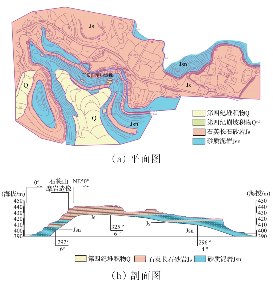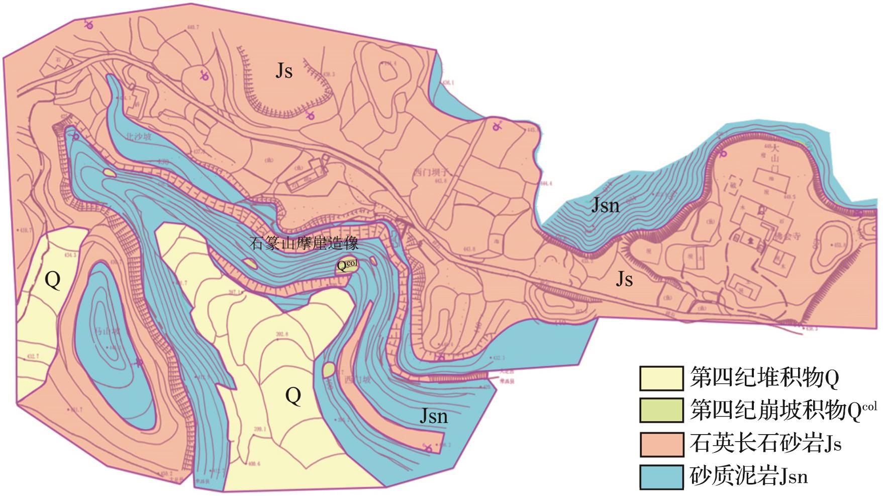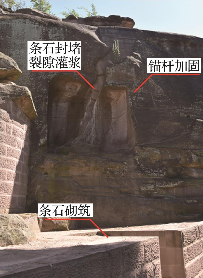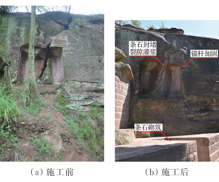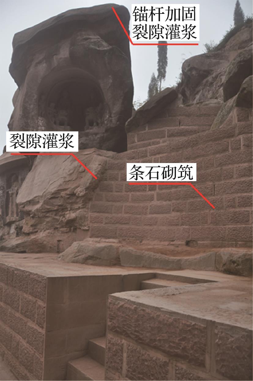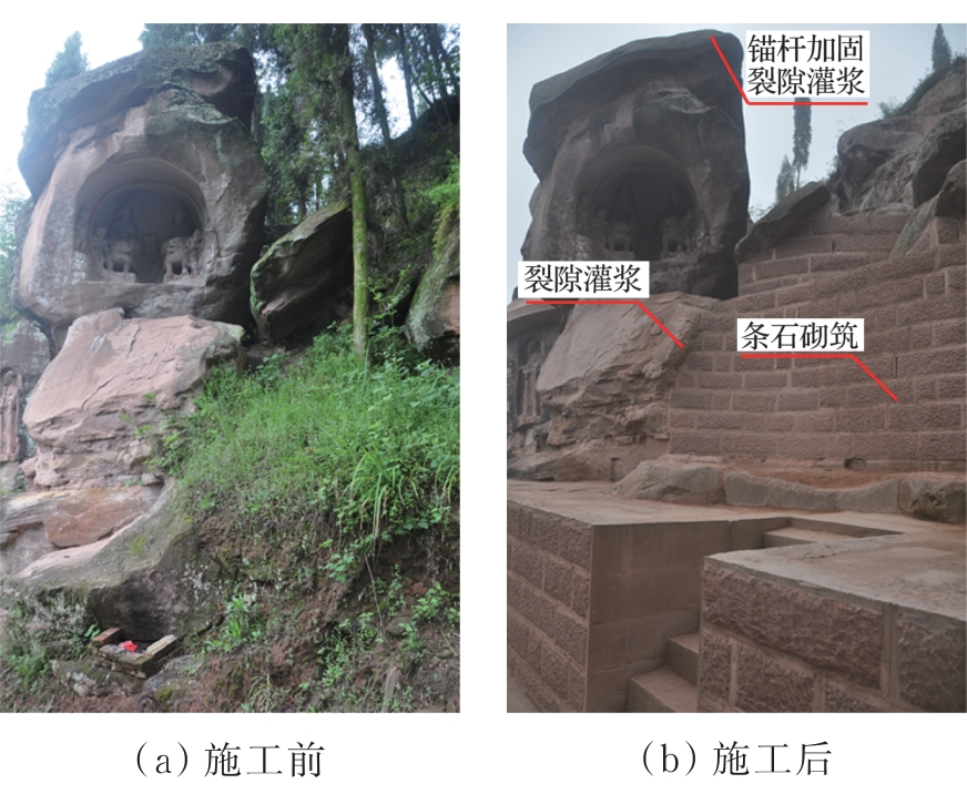 摘要:在自然营力的长期作用下,石窟寺及石刻类文化遗产极易受构造应力、裂隙扩张、雨水侵蚀等因素影响,产生严重的岩体失稳现象。以大足石刻石篆山摩崖造像为例,通过野外调查和室内试验手段,获取石刻区的工程地质条件及区域岩石的宏观力学特性,结合定性和定量方法分别评价倾倒式和滑移式两种主要破坏模式下危岩体的稳定性,并制定相应的抢险加固方案。计算结果表明,在考虑地震因素影响作用下,倾倒式和滑移式危岩体的稳定性安全系数分别为1.39和1.20。鉴于石窟区文物保存现状和游客参观服务的特殊性,采取“锚杆加固+条石砌筑+裂隙灌浆+做旧处理”综合性加固措施,通过位移和应力监测数据发现,加固后倾倒式和滑移式危岩体的变形量分别控制在3、6 mm范围内,验证了加固方案的有效性,并及时消除了石篆山摩崖造像重大险情,确保游客和文物安全。