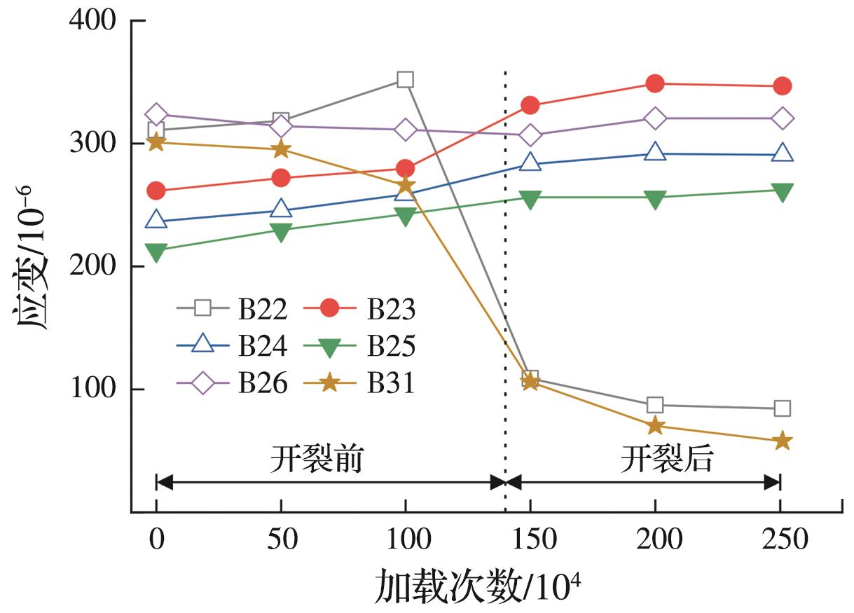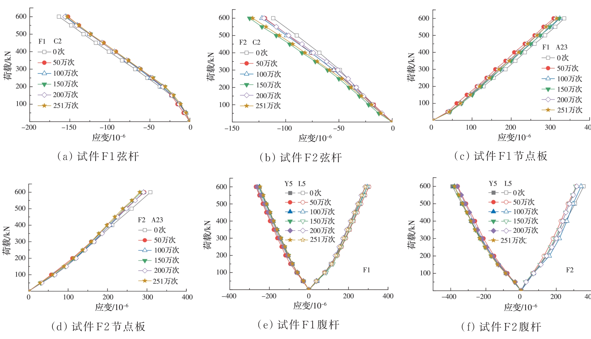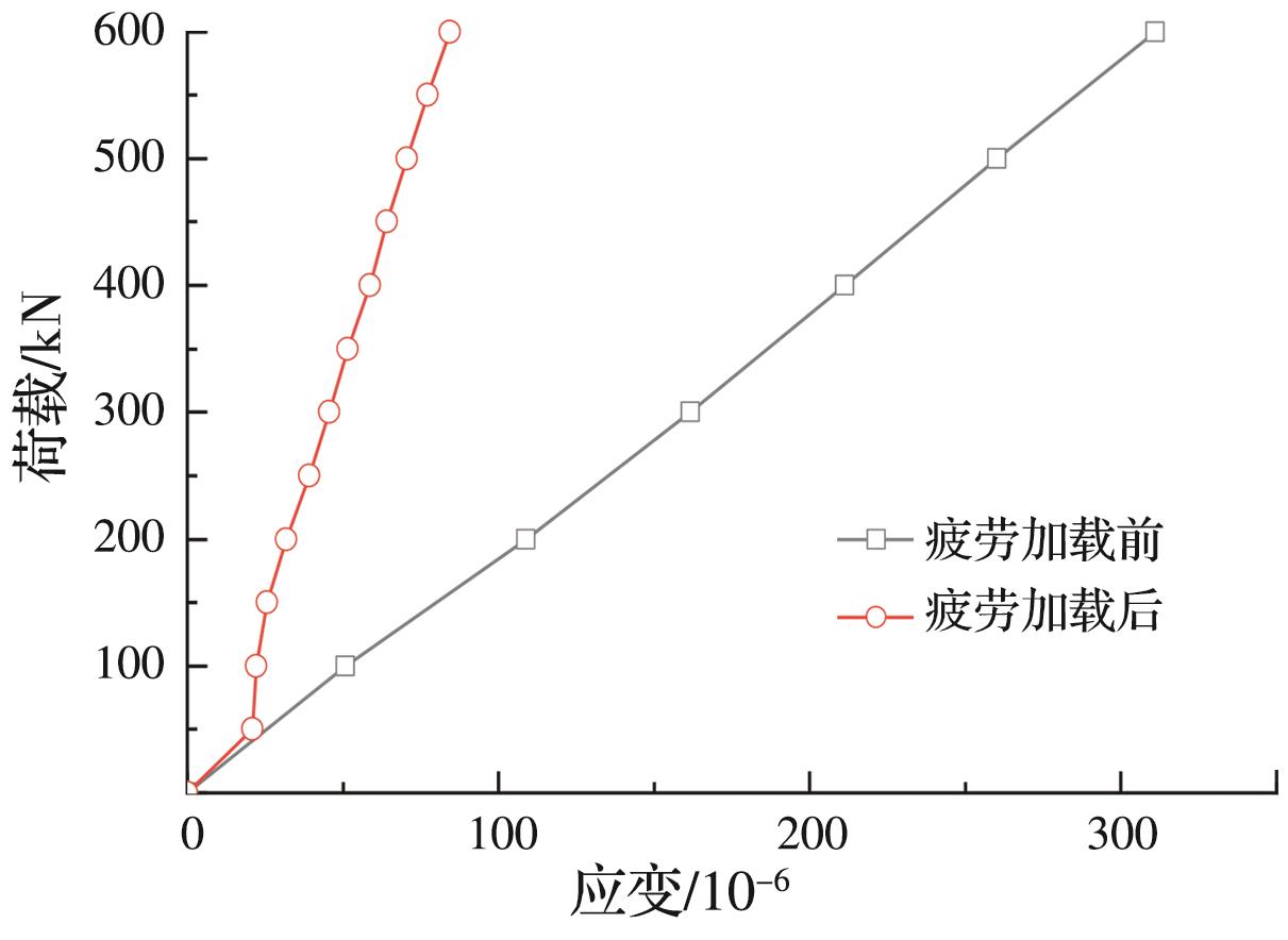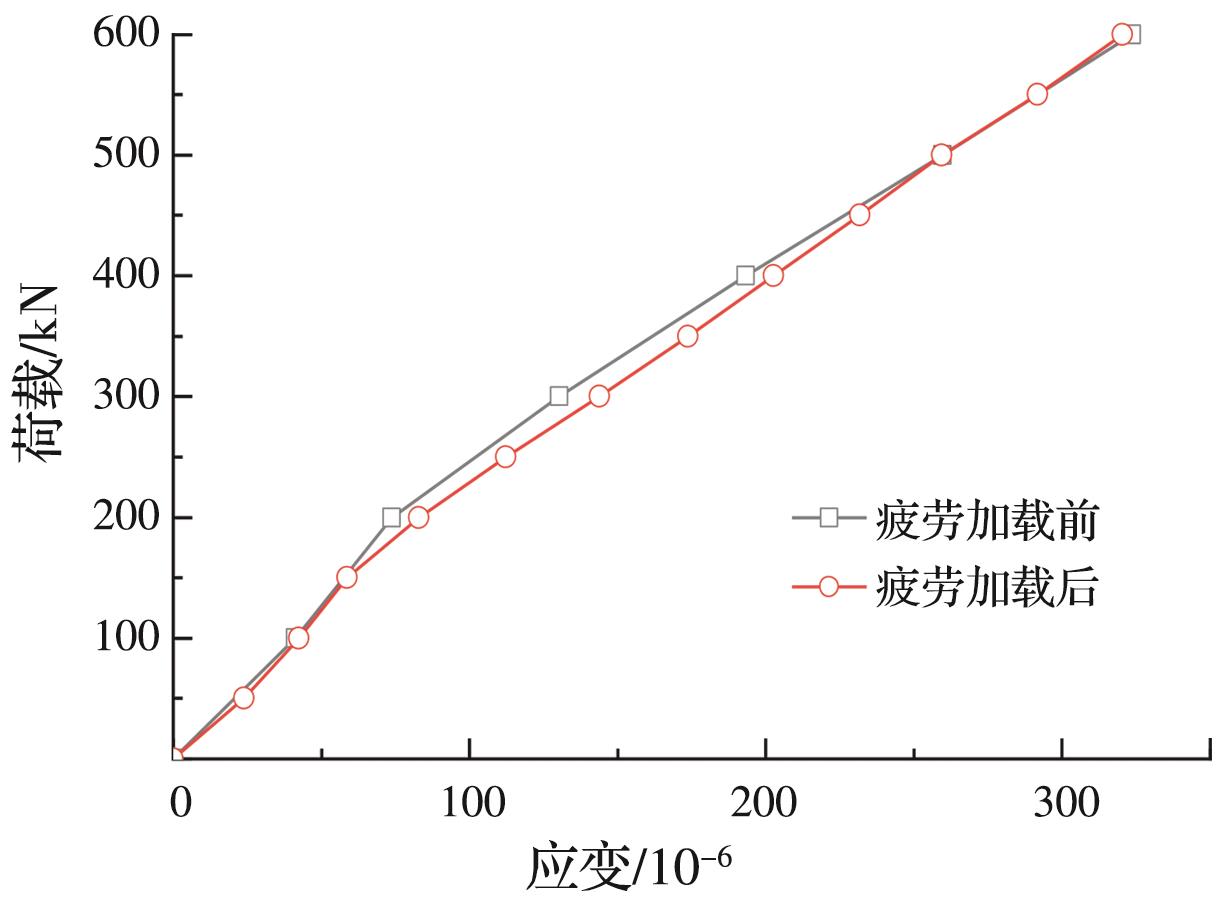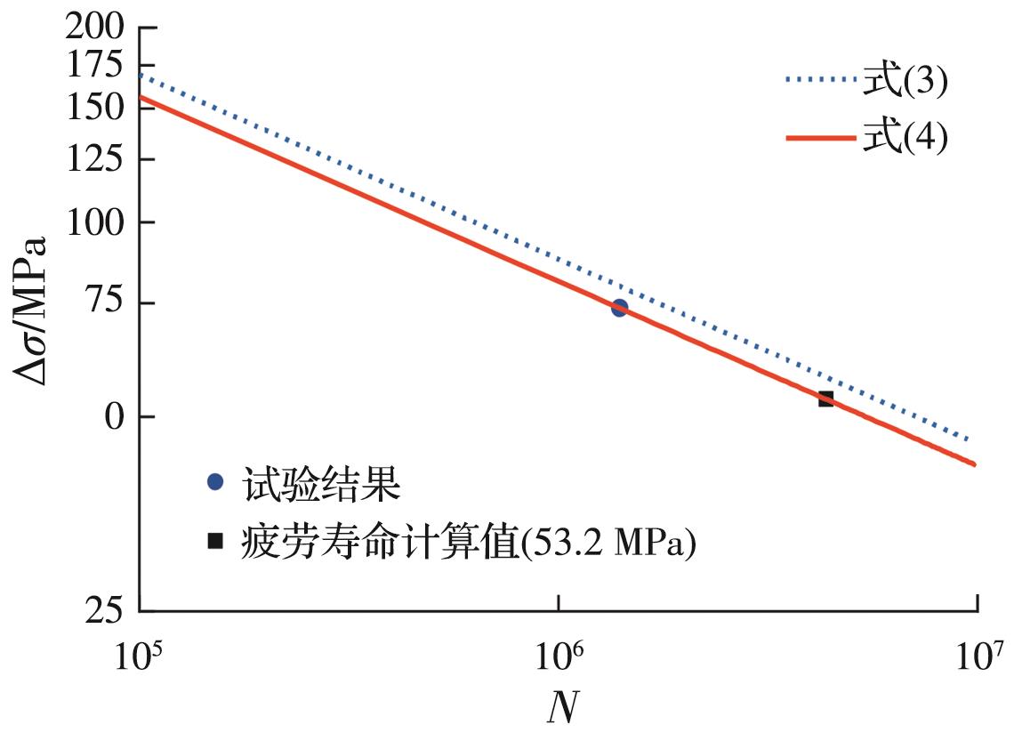 摘要:为研究钢桁腹-混凝土组合外接式节点的疲劳性能,并验证该结构应用于高速铁路桥梁的可靠性,设计制作了两个缩尺比为1∶3的节点模型并开展疲劳试验,研究组合外接式节点疲劳破坏模式、荷载-位移关系和荷载-应变曲线,观察不同应力幅作用下外接式节点疲劳受力特征。结果表明:在设计应力幅作用下,组合外接式节点疲劳寿命超过251万次,节点未破坏且刚度未减小,抗疲劳性能满足要求;在1.4倍设计应力幅作用下,节点实测疲劳寿命为140万次;外接式节点的疲劳破坏模式为受拉侧外露节点板的开裂,组合外接式节点疲劳性能的控制构造细节是外露节点板与加劲板之间的焊缝连接细节;疲劳裂纹引起节点板的应力重分布,裂纹上下节点板的应变最大减小了81%,裂纹附近节点板应变最大增加了33%;根据一点法所得S-N曲线,组合外接式节点对应于设计应力幅53.2 MPa作用下的疲劳寿命,为436万次,是设计寿命的2.18倍。