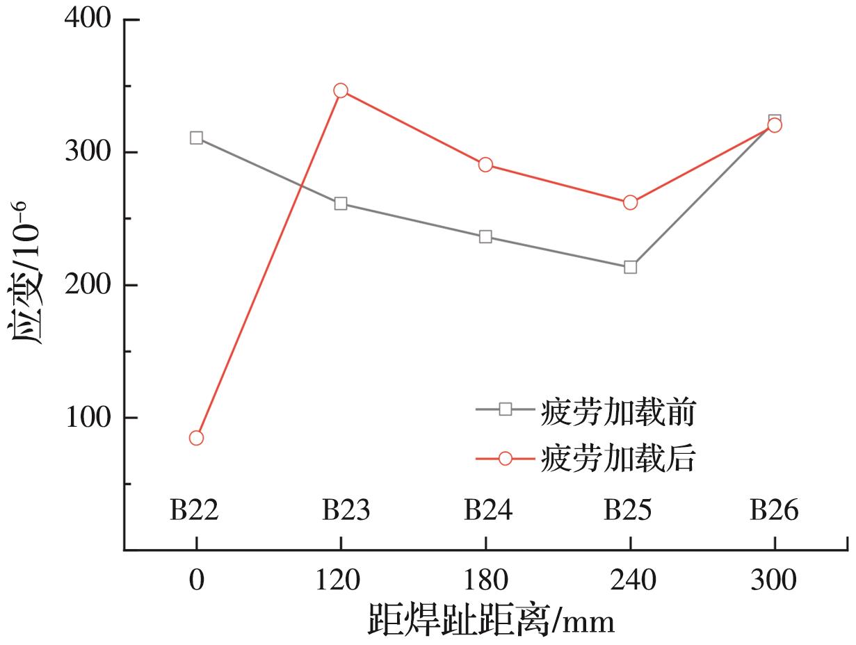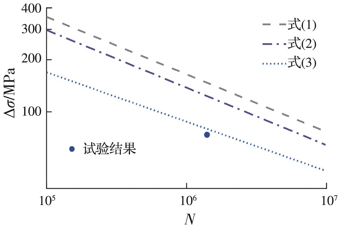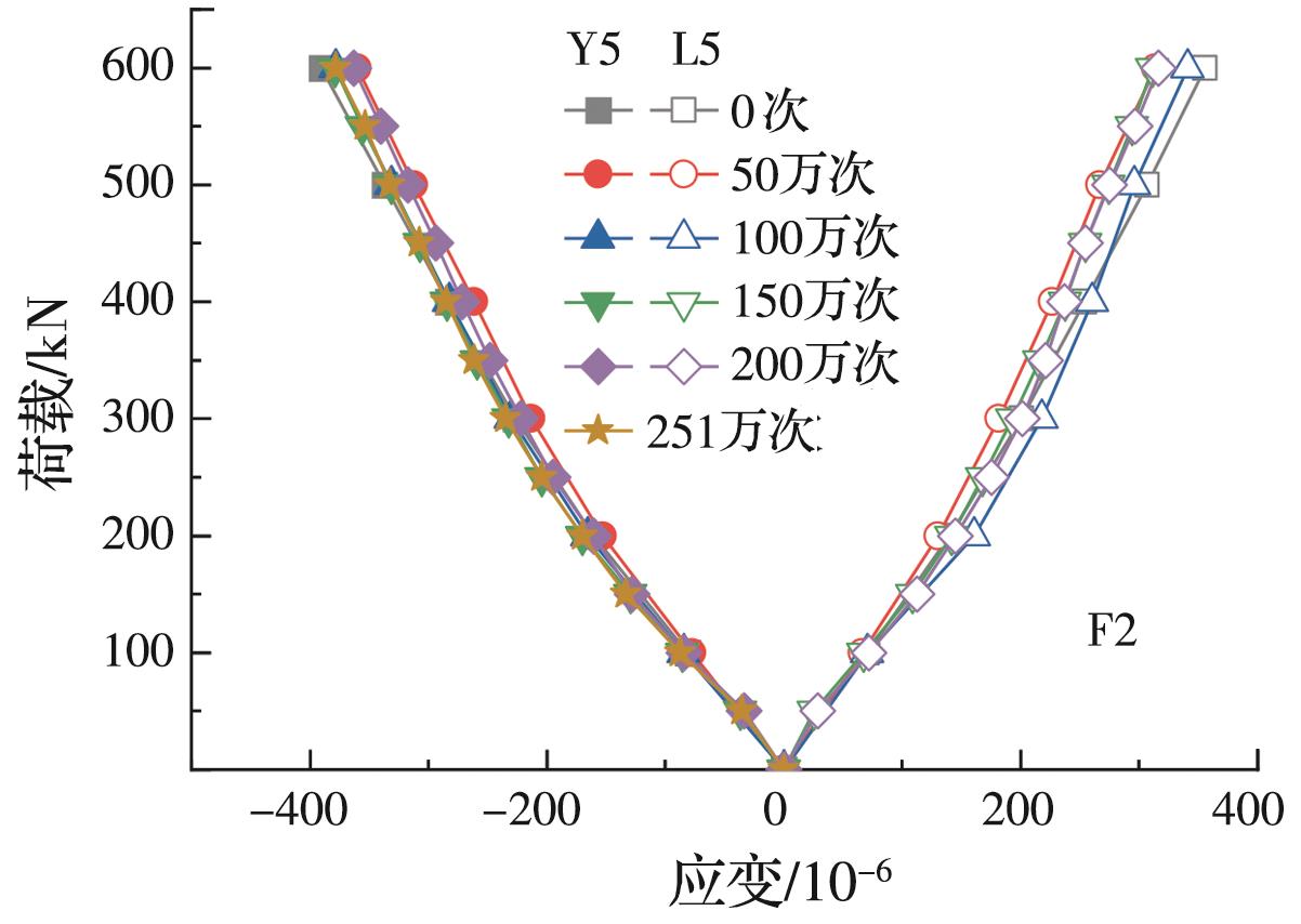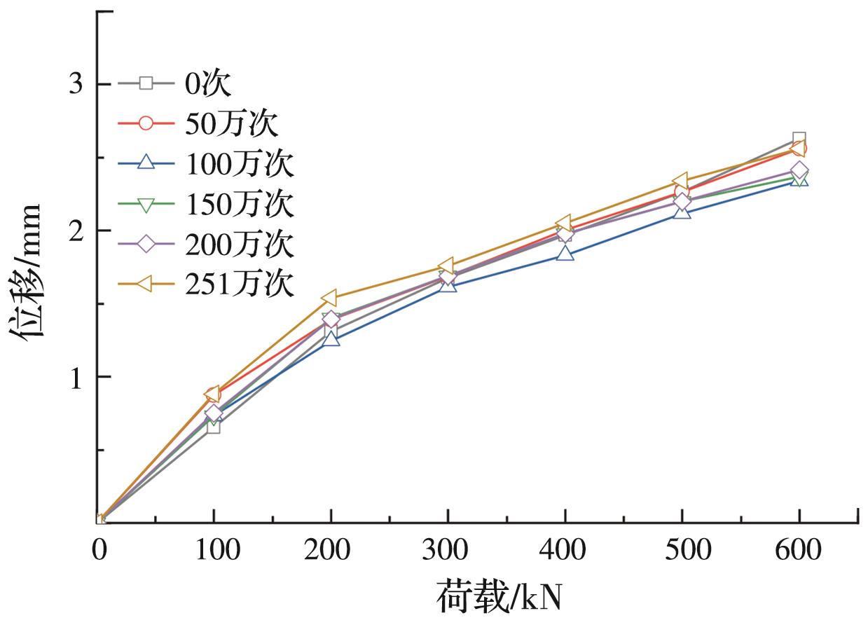摘要:为研究钢桁腹-混凝土组合外接式节点的疲劳性能,并验证该结构应用于高速铁路桥梁的可靠性,设计制作了两个缩尺比为1∶3的节点模型并开展疲劳试验,研究组合外接式节点疲劳破坏模式、荷载-位移关系和荷载-应变曲线,观察不同应力幅作用下外接式节点疲劳受力特征。结果表明:在设计应力幅作用下,组合外接式节点疲劳寿命超过251万次,节点未破坏且刚度未减小,抗疲劳性能满足要求;在1.4倍设计应力幅作用下,节点实测疲劳寿命为140万次;外接式节点的疲劳破坏模式为受拉侧外露节点板的开裂,组合外接式节点疲劳性能的控制构造细节是外露节点板与加劲板之间的焊缝连接细节;疲劳裂纹引起节点板的应力重分布,裂纹上下节点板的应变最大减小了81%,裂纹附近节点板应变最大增加了33%;根据一点法所得S-N曲线,组合外接式节点对应于设计应力幅53.2 MPa作用下的疲劳寿命,为436万次,是设计寿命的2.18倍。