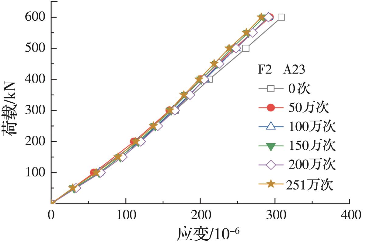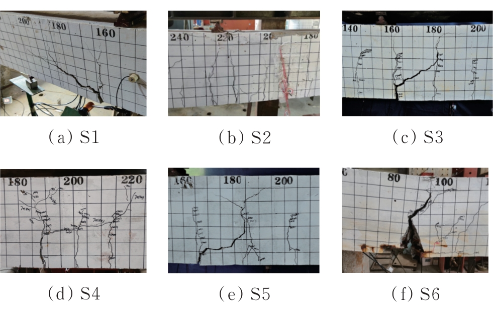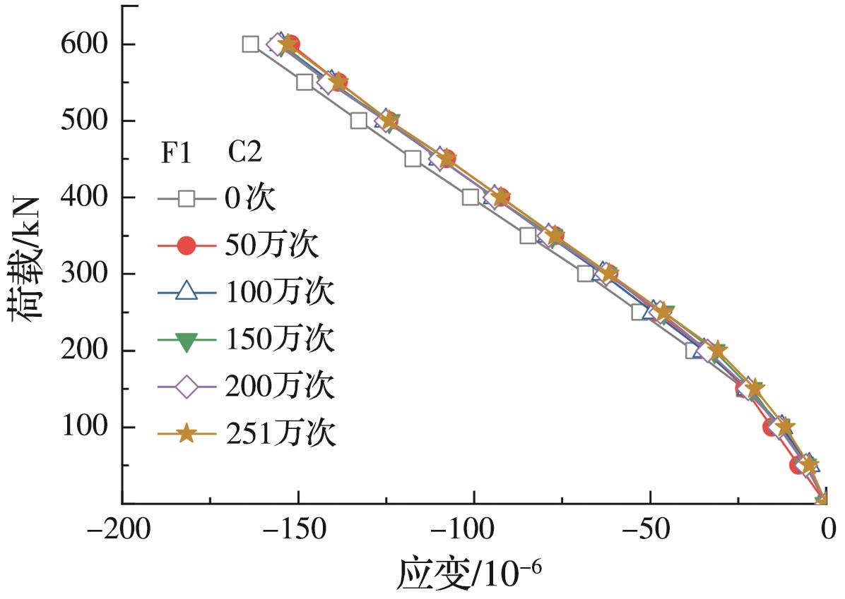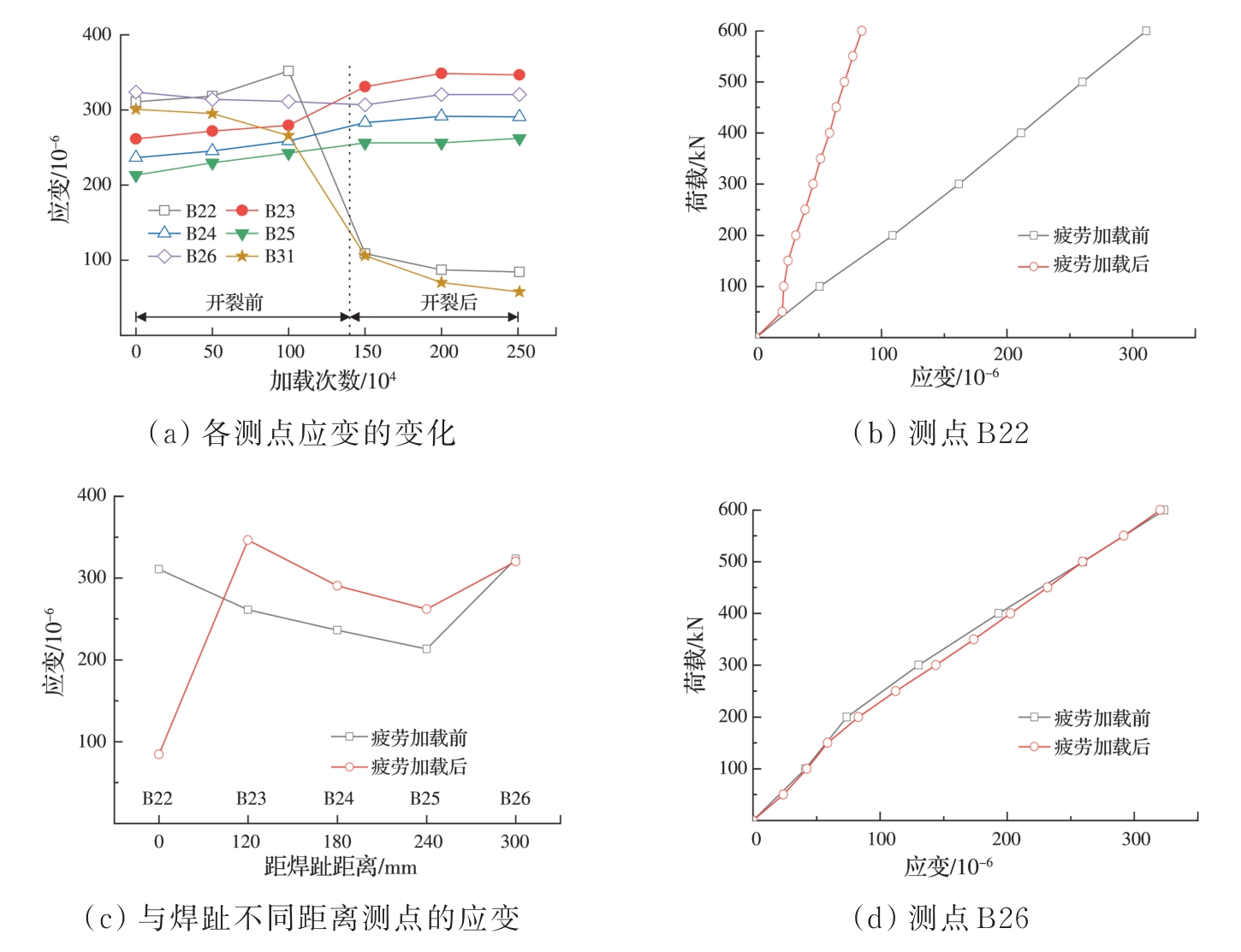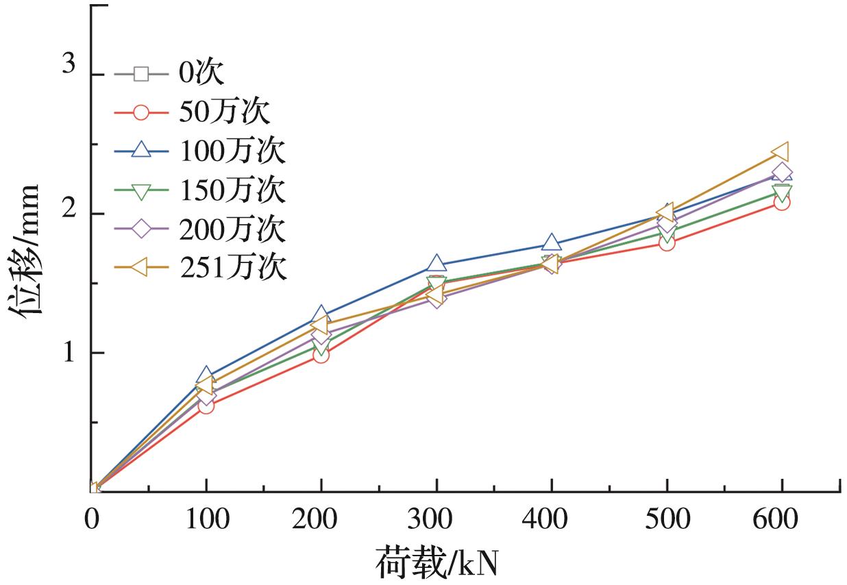 摘要:为研究钢桁腹-混凝土组合外接式节点的疲劳性能,并验证该结构应用于高速铁路桥梁的可靠性,设计制作了两个缩尺比为1∶3的节点模型并开展疲劳试验,研究组合外接式节点疲劳破坏模式、荷载-位移关系和荷载-应变曲线,观察不同应力幅作用下外接式节点疲劳受力特征。结果表明:在设计应力幅作用下,组合外接式节点疲劳寿命超过251万次,节点未破坏且刚度未减小,抗疲劳性能满足要求;在1.4倍设计应力幅作用下,节点实测疲劳寿命为140万次;外接式节点的疲劳破坏模式为受拉侧外露节点板的开裂,组合外接式节点疲劳性能的控制构造细节是外露节点板与加劲板之间的焊缝连接细节;疲劳裂纹引起节点板的应力重分布,裂纹上下节点板的应变最大减小了81%,裂纹附近节点板应变最大增加了33%;根据一点法所得S-N曲线,组合外接式节点对应于设计应力幅53.2 MPa作用下的疲劳寿命,为436万次,是设计寿命的2.18倍。