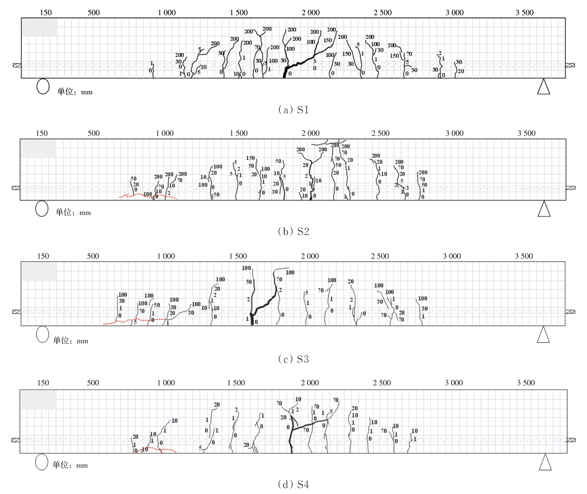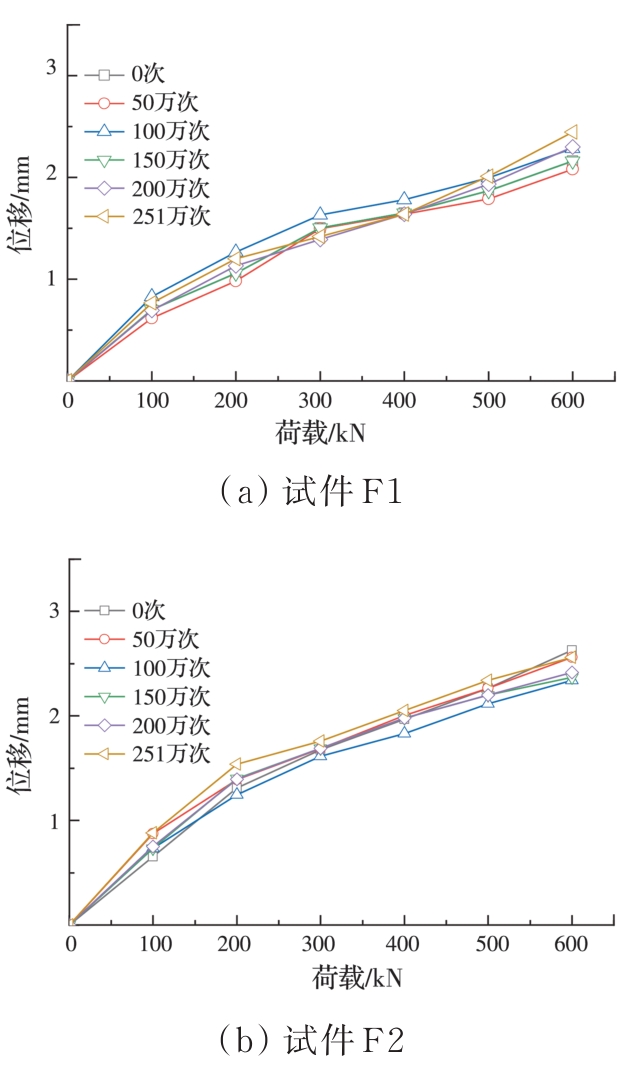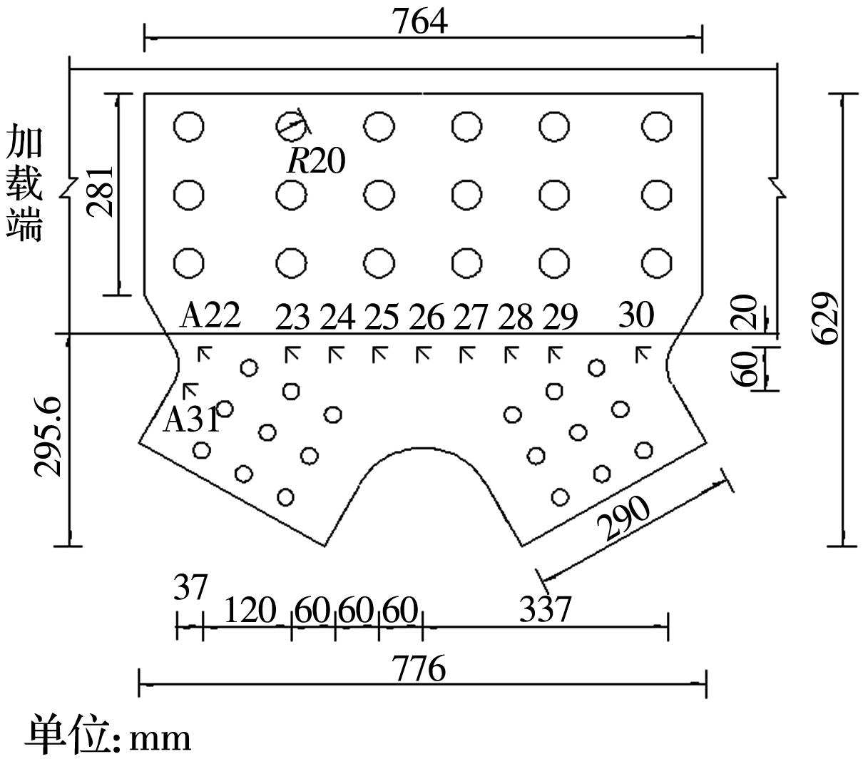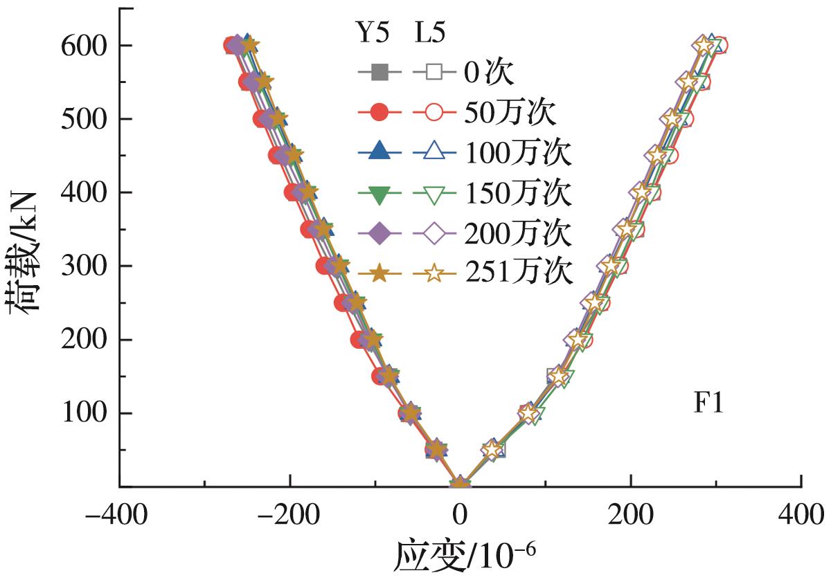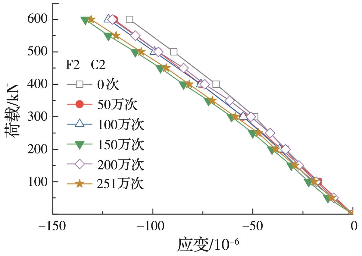 摘要:为研究钢桁腹-混凝土组合外接式节点的疲劳性能,并验证该结构应用于高速铁路桥梁的可靠性,设计制作了两个缩尺比为1∶3的节点模型并开展疲劳试验,研究组合外接式节点疲劳破坏模式、荷载-位移关系和荷载-应变曲线,观察不同应力幅作用下外接式节点疲劳受力特征。结果表明:在设计应力幅作用下,组合外接式节点疲劳寿命超过251万次,节点未破坏且刚度未减小,抗疲劳性能满足要求;在1.4倍设计应力幅作用下,节点实测疲劳寿命为140万次;外接式节点的疲劳破坏模式为受拉侧外露节点板的开裂,组合外接式节点疲劳性能的控制构造细节是外露节点板与加劲板之间的焊缝连接细节;疲劳裂纹引起节点板的应力重分布,裂纹上下节点板的应变最大减小了81%,裂纹附近节点板应变最大增加了33%;根据一点法所得S-N曲线,组合外接式节点对应于设计应力幅53.2 MPa作用下的疲劳寿命,为436万次,是设计寿命的2.18倍。