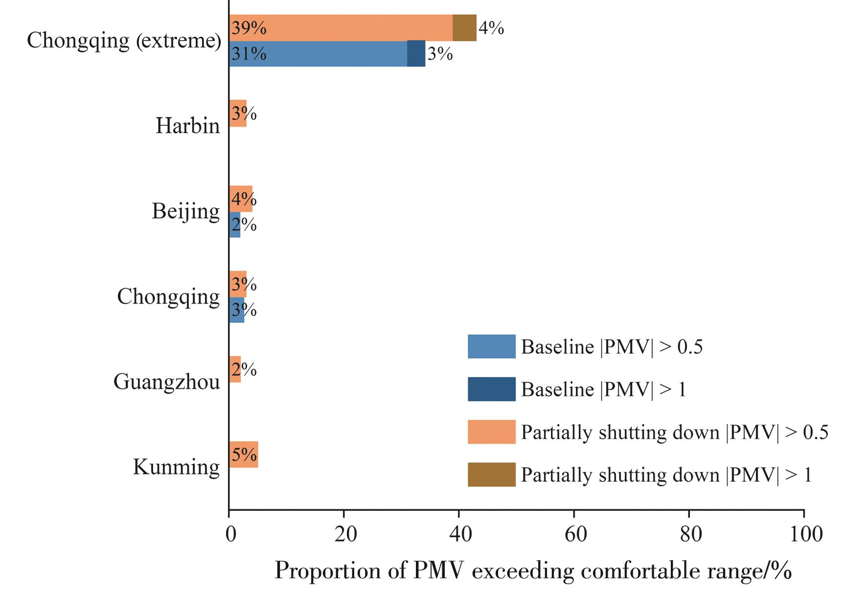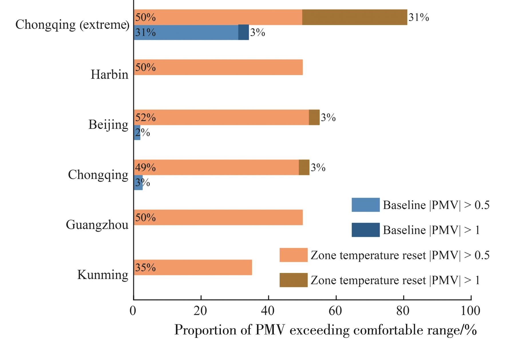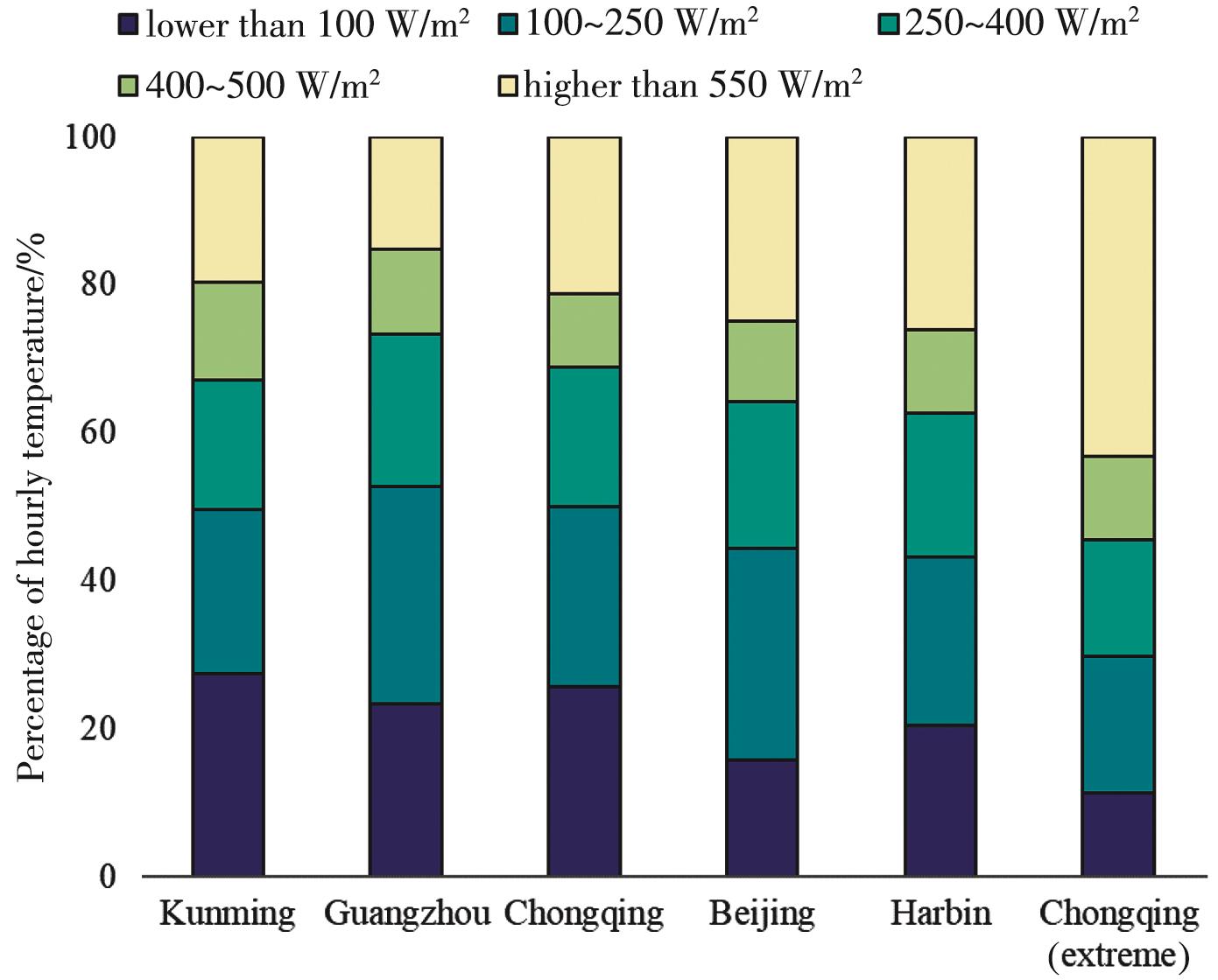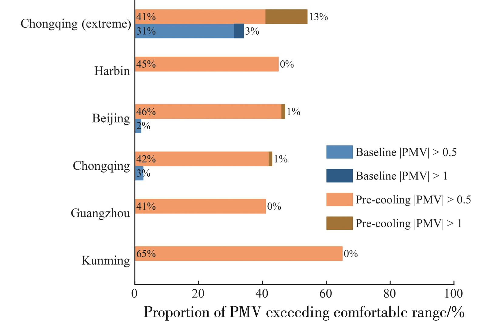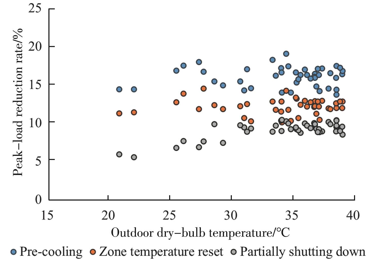 摘要:在电力供需不匹配的挑战下,需要对建筑实行柔性负荷调度以改善电网的协调性。气候变化造成日益增多的极端天气和气候活动,了解不同气候条件下柔性管理策略的效果至关重要。采用中国五大气候区代表城市的典型与极端天气数据,研究办公建筑在3种短期暖通空调管理策略下的柔性用能潜力,旨在发掘不同策略在中国不同地区及室外气候条件下的效果。结果表明,3种短期策略下,峰值负荷柔性与总能耗表现受室外气候条件影响;预冷及温度调节策略的峰值负荷降低率随户外温度升高呈线性下降;在极端气候条件下,峰值负荷出现时间较典型情况提前2 h以上,极端条件下的强烈太阳辐射可能导致峰值负荷降低率与室外温度的相关性降低,同时降低室内热舒适。