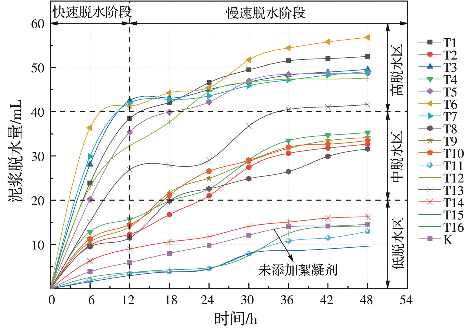 摘要:在工程建设中,废弃泥浆含水率极高,且对环境的影响极大,解决其脱水问题成为当前面临的主要难题。针对高含水率泥浆泥水分离问题,选择3种絮凝剂:氯化钙(CaCl2)、阴离子型聚丙烯酰胺(APAM)和聚合氯化铝(PAC),设计3因素4水平正交试验,采用综合平衡法,选取48 h脱水量和上清液pH值等指标,进行极差分析和方差分析,着重找出最佳复合絮凝剂组合。通过正交试验结果和SEM微观分析等对絮凝机理进行讨论。结果表明,将脱水量随时间变化曲线划分为高、中、低脱水区和快速脱水、慢速脱水阶段,则泥浆脱水速率整体呈减小趋势,其中高脱水区组在12 h时也具有较高的脱水量,即满足快速脱水的要求;3种絮凝剂存在一定的协同作用效果。通过正交试验的极差分析和方差分析发现,复合絮凝剂的最优组合为每100 g泥浆掺量为0.25 g CaCl2+0.12 g APAM+0.17 g PAC;根据机理分析,可将复合絮凝剂絮凝过程分为5个阶段:电中和阶段、架桥阶段、吸附成团阶段、网络沉降阶段和固化增强阶段。