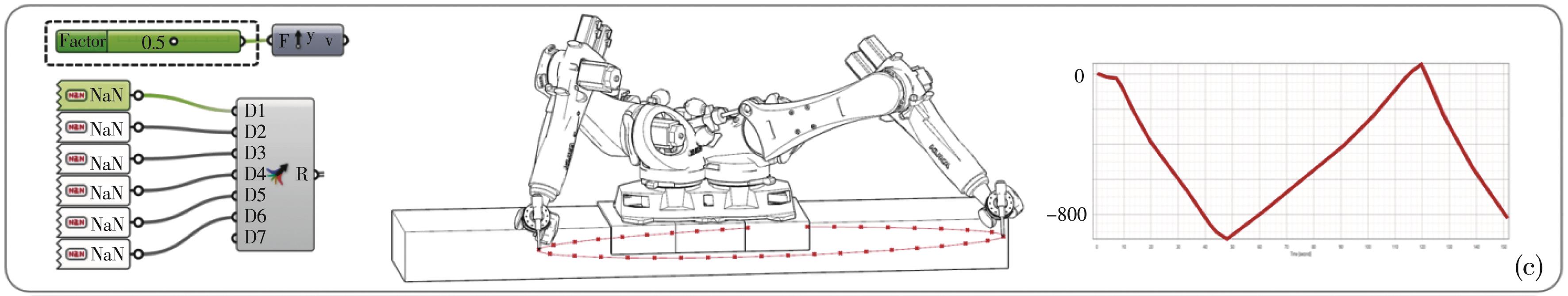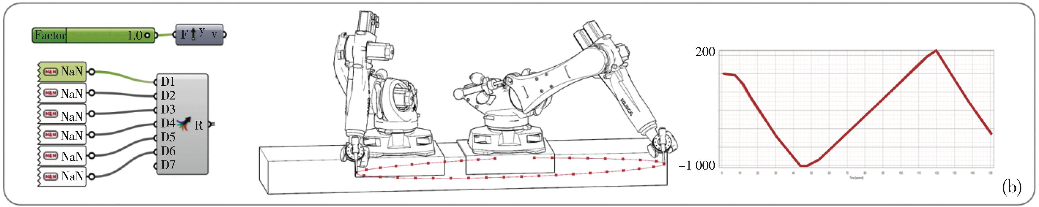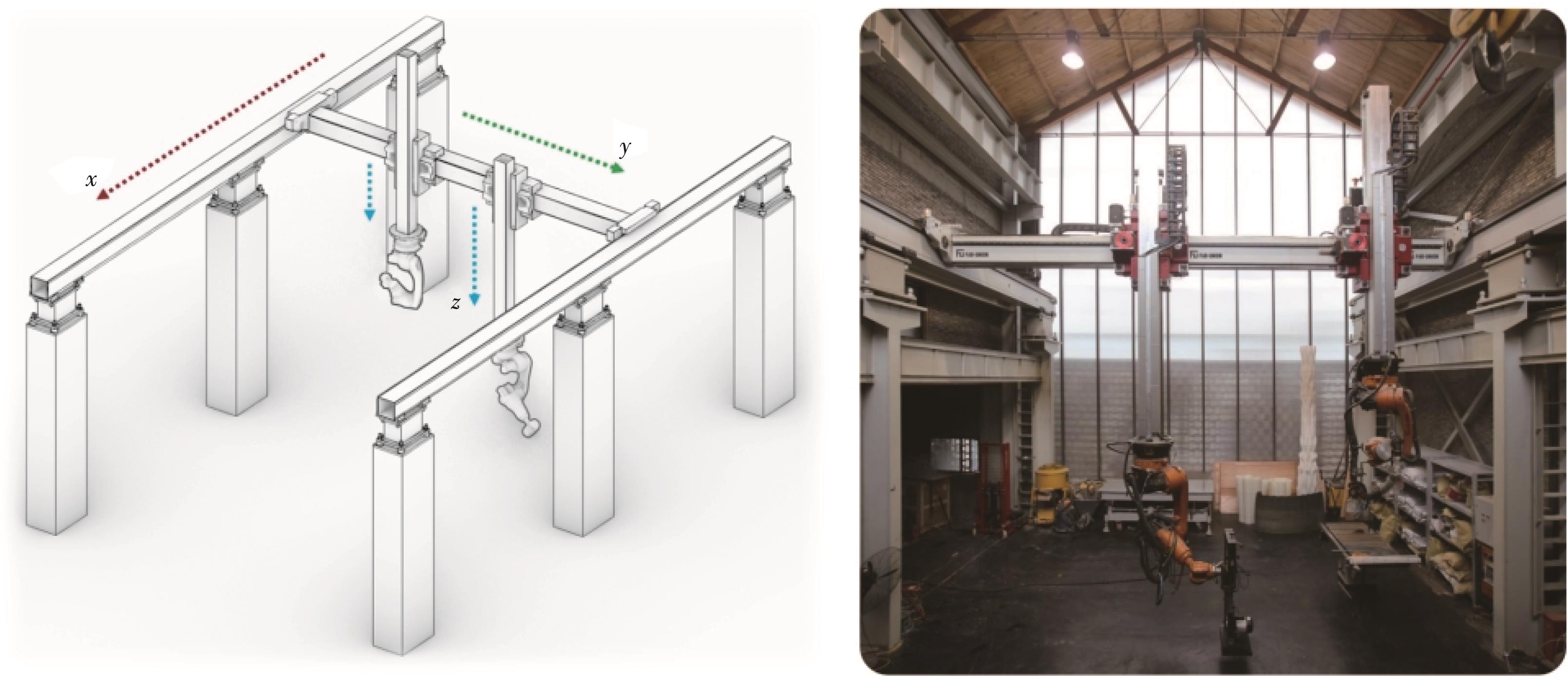 摘要:随着参数化设计的兴起,建筑构件的复杂性不断增加,传统的建造方法难以满足需求,在此背景下,建筑机器人成为重要的生产工具。由于单个机器人的臂展通常不超过3 m,无法胜任大尺度建筑构件的生产任务,因此,常通过外部轴来扩展机器人的工作范围。然而外部轴与机器人的耦合控制及其运动学解算成了关键挑战,主要技术难点包括:定制化建筑机器人、自动求解外部轴、固定轴关节以及特定的运动模式控制。提出针对这些难点的解决方案,详细介绍相关的基本概念和算法,并将这些机器人学原理与算法流程封装到建筑师常用的Grasshopper插件中,形成FURobot软件平台。该平台不仅有效解决了上述问题,还降低了建筑师的使用门槛,提升了生产效率。最后,通过仿真试验验证了算法和软件的有效性。