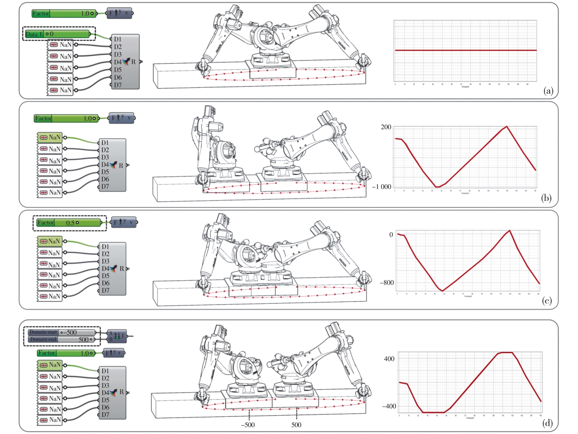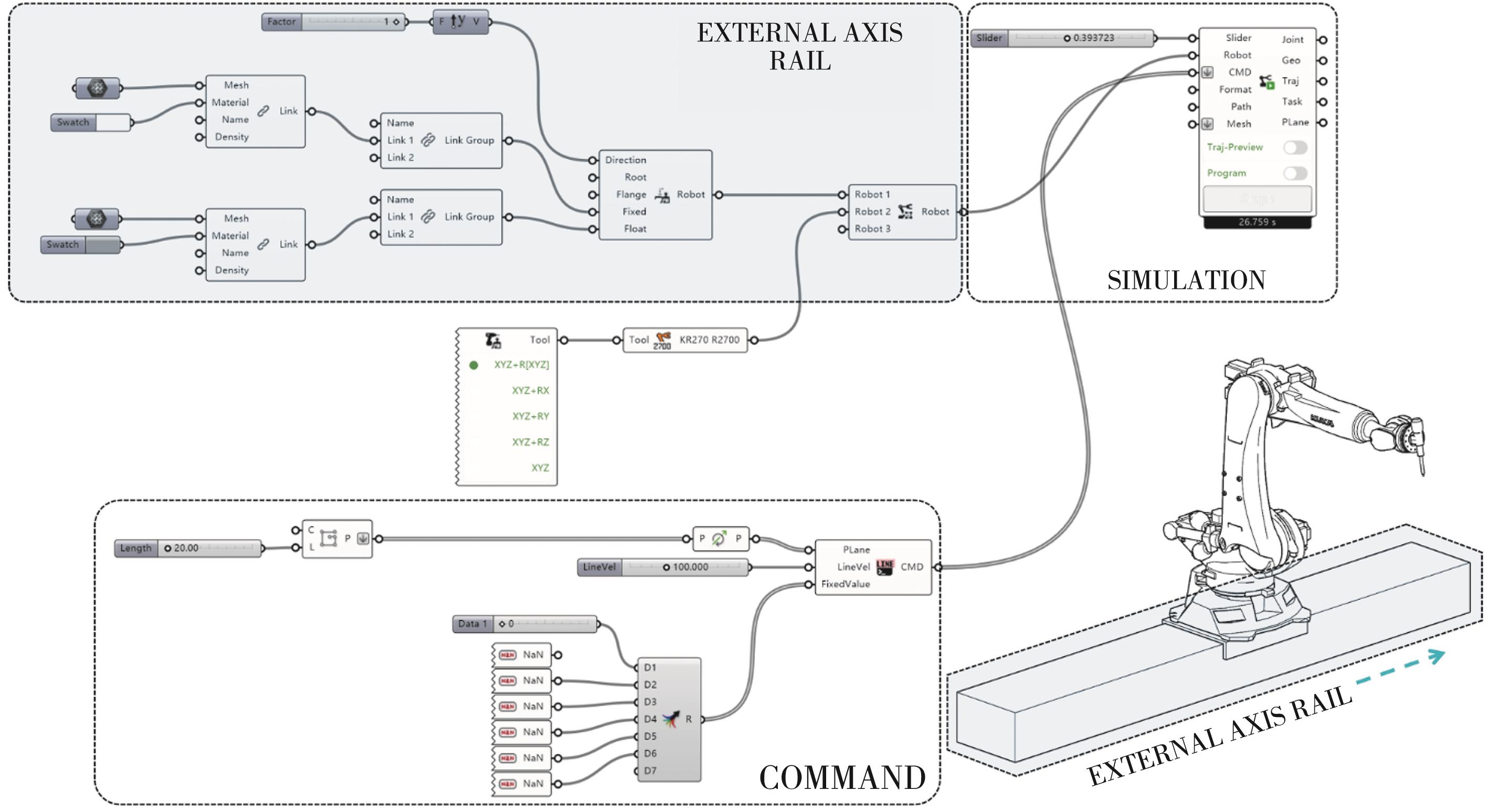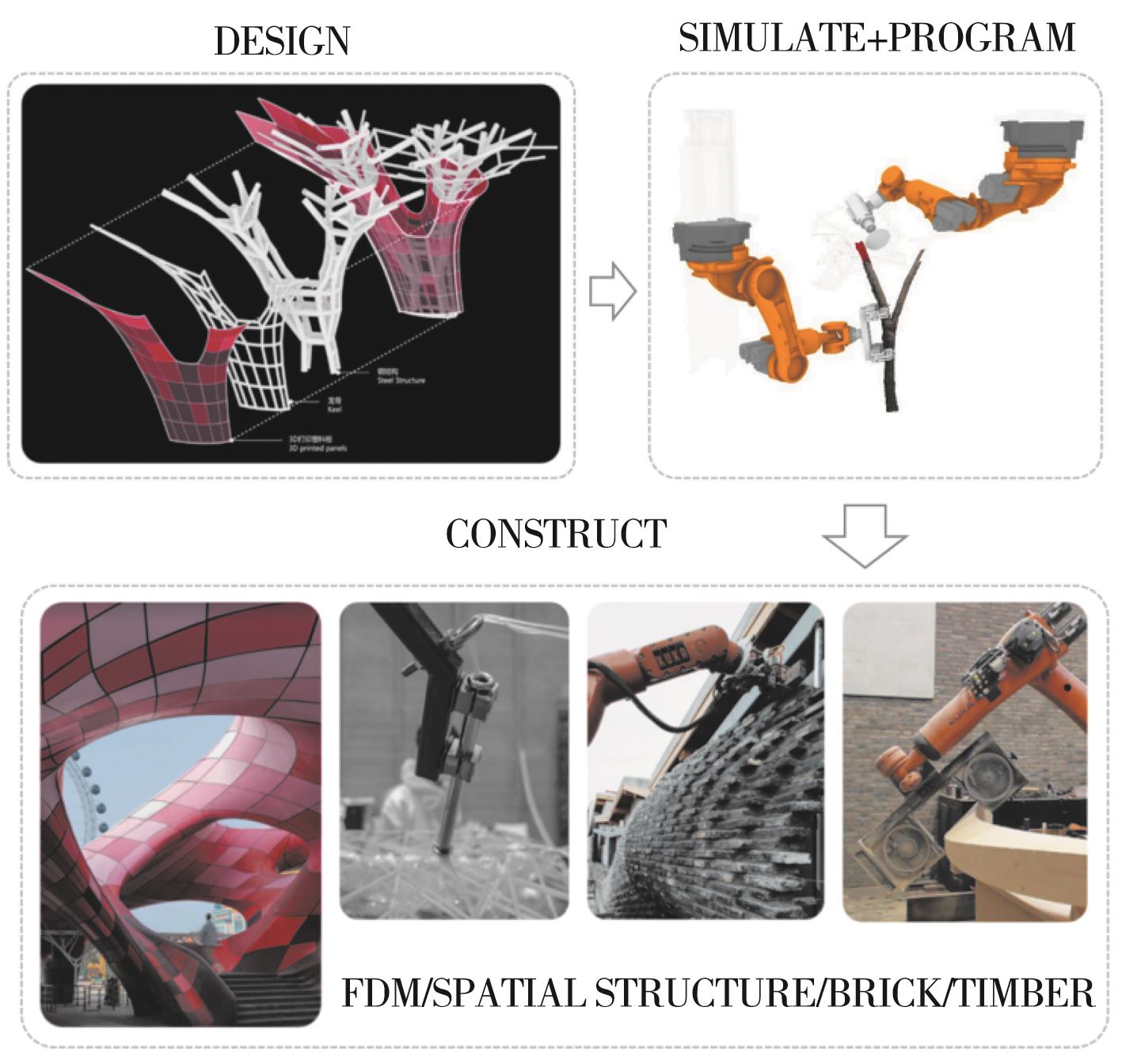 摘要:随着参数化设计的兴起,建筑构件的复杂性不断增加,传统的建造方法难以满足需求,在此背景下,建筑机器人成为重要的生产工具。由于单个机器人的臂展通常不超过3 m,无法胜任大尺度建筑构件的生产任务,因此,常通过外部轴来扩展机器人的工作范围。然而外部轴与机器人的耦合控制及其运动学解算成了关键挑战,主要技术难点包括:定制化建筑机器人、自动求解外部轴、固定轴关节以及特定的运动模式控制。提出针对这些难点的解决方案,详细介绍相关的基本概念和算法,并将这些机器人学原理与算法流程封装到建筑师常用的Grasshopper插件中,形成FURobot软件平台。该平台不仅有效解决了上述问题,还降低了建筑师的使用门槛,提升了生产效率。最后,通过仿真试验验证了算法和软件的有效性。