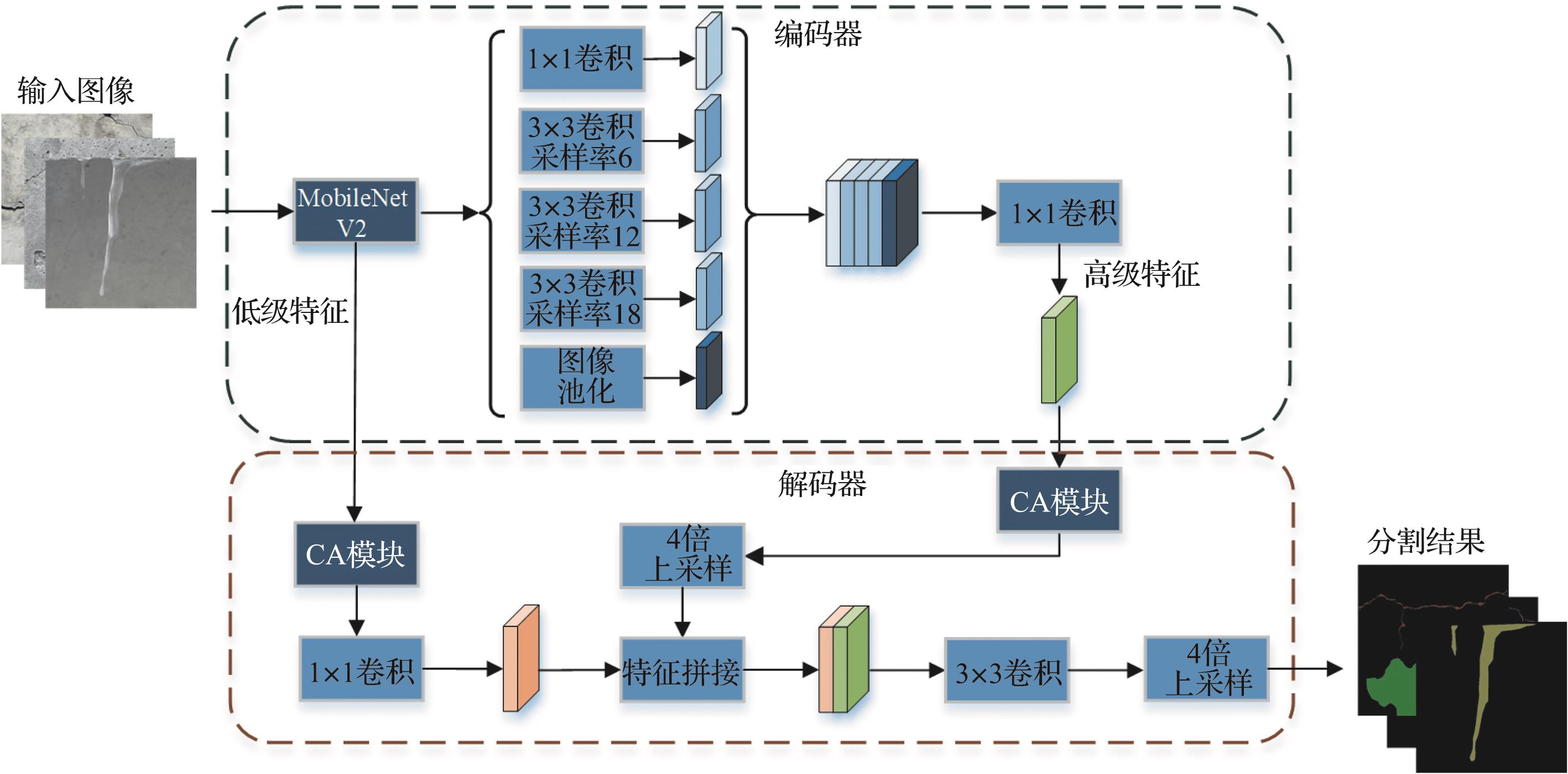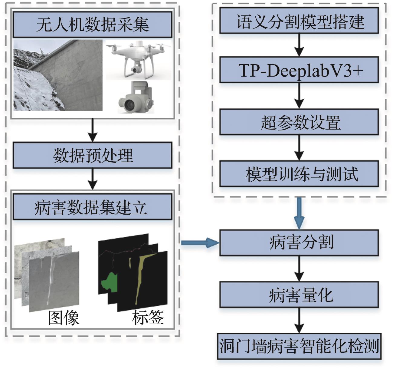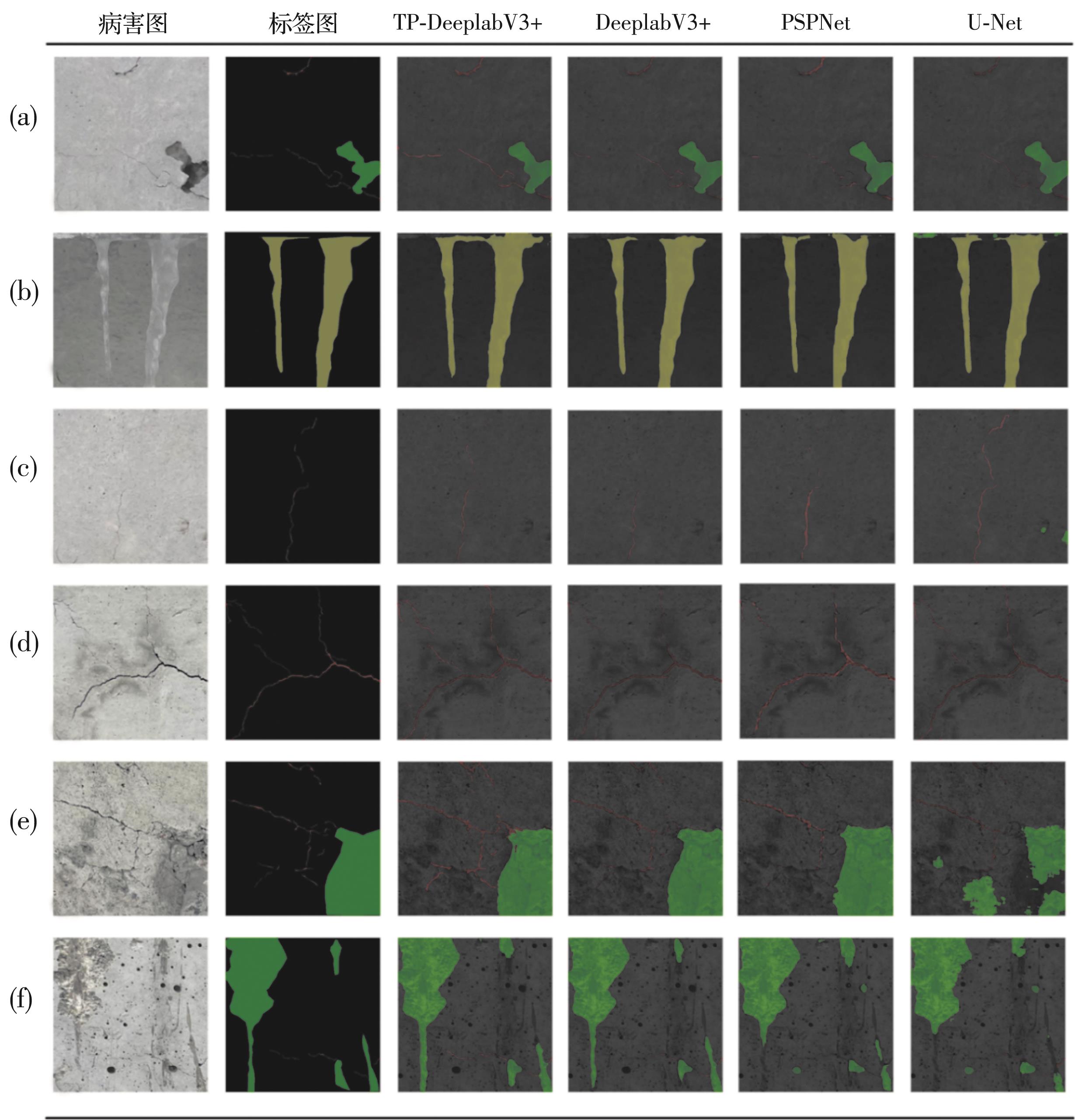 摘要:针对修建在高原恶劣环境下的隧道洞门墙病害频发及传统人工病害检测方法效率低下、危险性高等问题,提出基于无人机图像与深度学习的高原区隧道洞门墙病害检测方法。首先使用无人机航拍采集新疆某高原地区隧道洞门墙病害图像,建立多病害语义分割数据集;随后以语义分割模型DeeplabV3+为基础,提出以MobileNetV2作为主干特征提取网络的改进模型TP-DeeplabV3+,以减少模型参数;采用Focal Loss作为损失函数,以解决病害图像中的类别不平衡问题;添加CA注意力机制,以提升模型分割性能;最后提出病害量化方法。结果表明,TP-DeeplabV3+在测试集上可以达到88.37%和94.93%的mIoU和mPA,模型体量压缩了88.83%;提出的病害量化方法对于病害覆盖率的绝对误差不超过0.3%,相对误差维持在7.31%以下。相比传统方法,该方法安全、准确地实现了高原恶劣环境下的隧道洞门墙智能化检测。