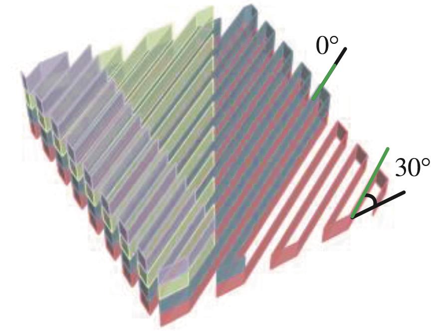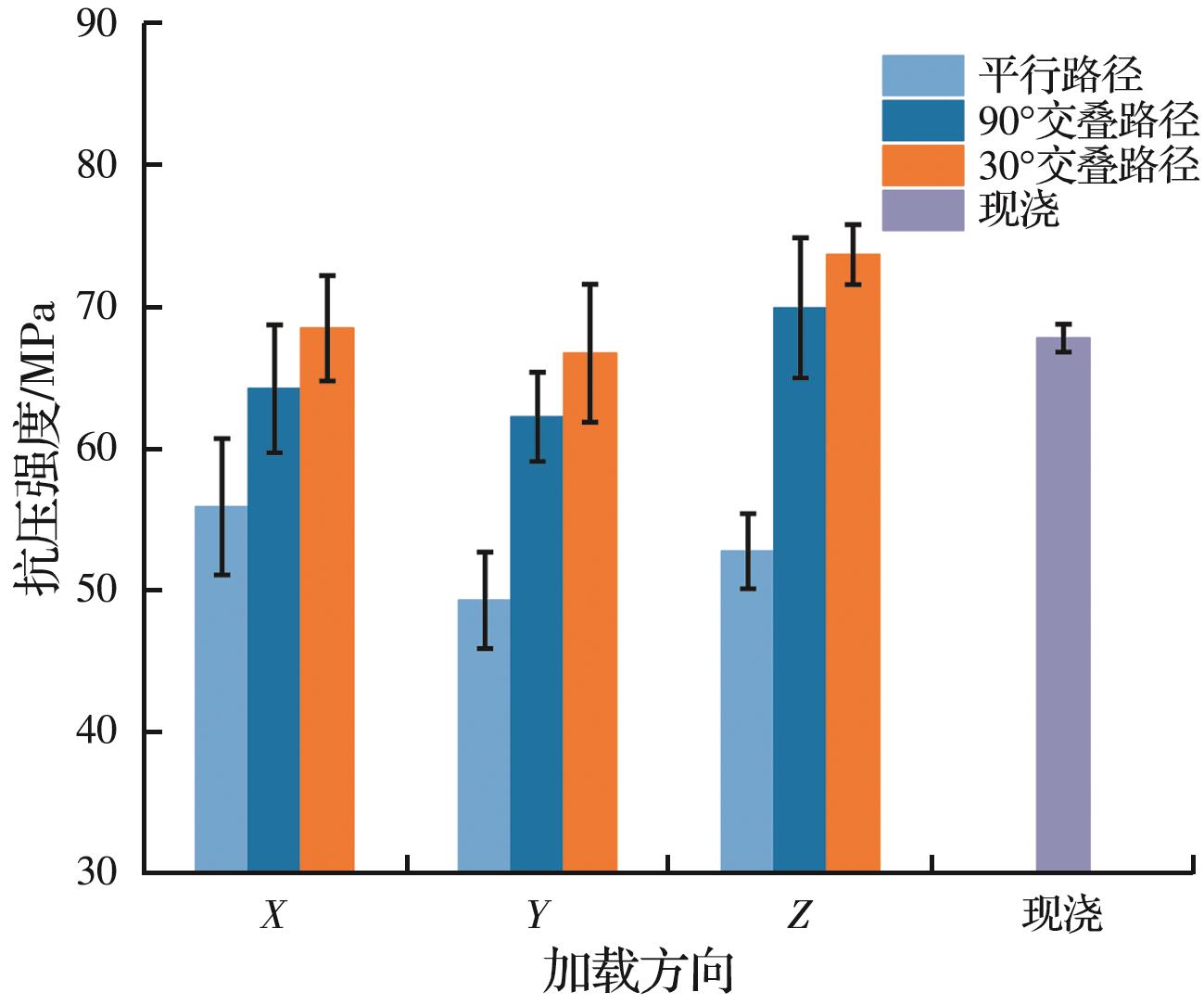 摘要:3D打印混凝土具有灵活、低碳、快速、无模板施工的优势,但界面黏结问题可能导致打印层结合不紧密,影响强度。交叠打印路径可减少该缺陷并增强层间黏结,提高抗压强度。对于钢纤维增强水泥基材料,钢纤维的分布方向易受打印路径的影响,交叠路径下的3D打印钢纤维增强水泥基材料的抗压强度研究尚不充分。采用平行路径和螺旋交叠路径两种3D打印方式,通过改变荷载与路径方向的夹角和螺旋交叠角制作钢纤维增强水泥基立方体试块,探究上述参数对其抗压强度的影响规律。结果表明:在X-Y平面内,平行路径抗压强度随荷载方向与路径方向夹角的变化先增后降,但均小于现浇试件;在X-Y平面内,当纤维的分布方向与加载方向平行时,抗压强度最大(X方向),当纤维的分布方向与加载方向垂直时,抗压强度最小(Y方向);30°、90°螺旋交叠路径在X、Y、Z方向的抗压强度明显高于平行路径;相比平行打印,螺旋交叠结构减小了力学各向异性;螺旋交叠的打印方式可作为提升构件抗压强度的有效措施。