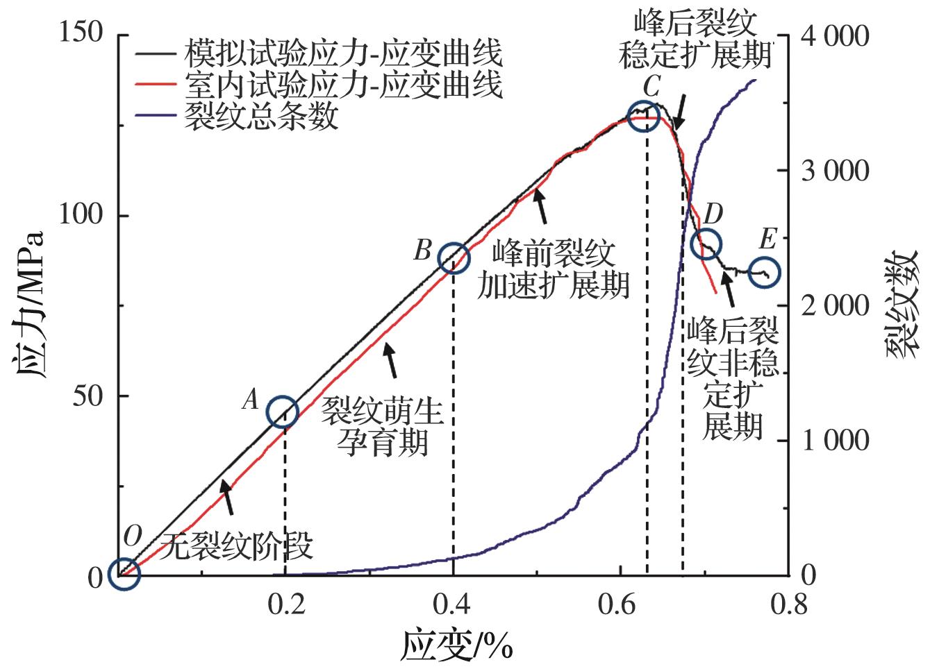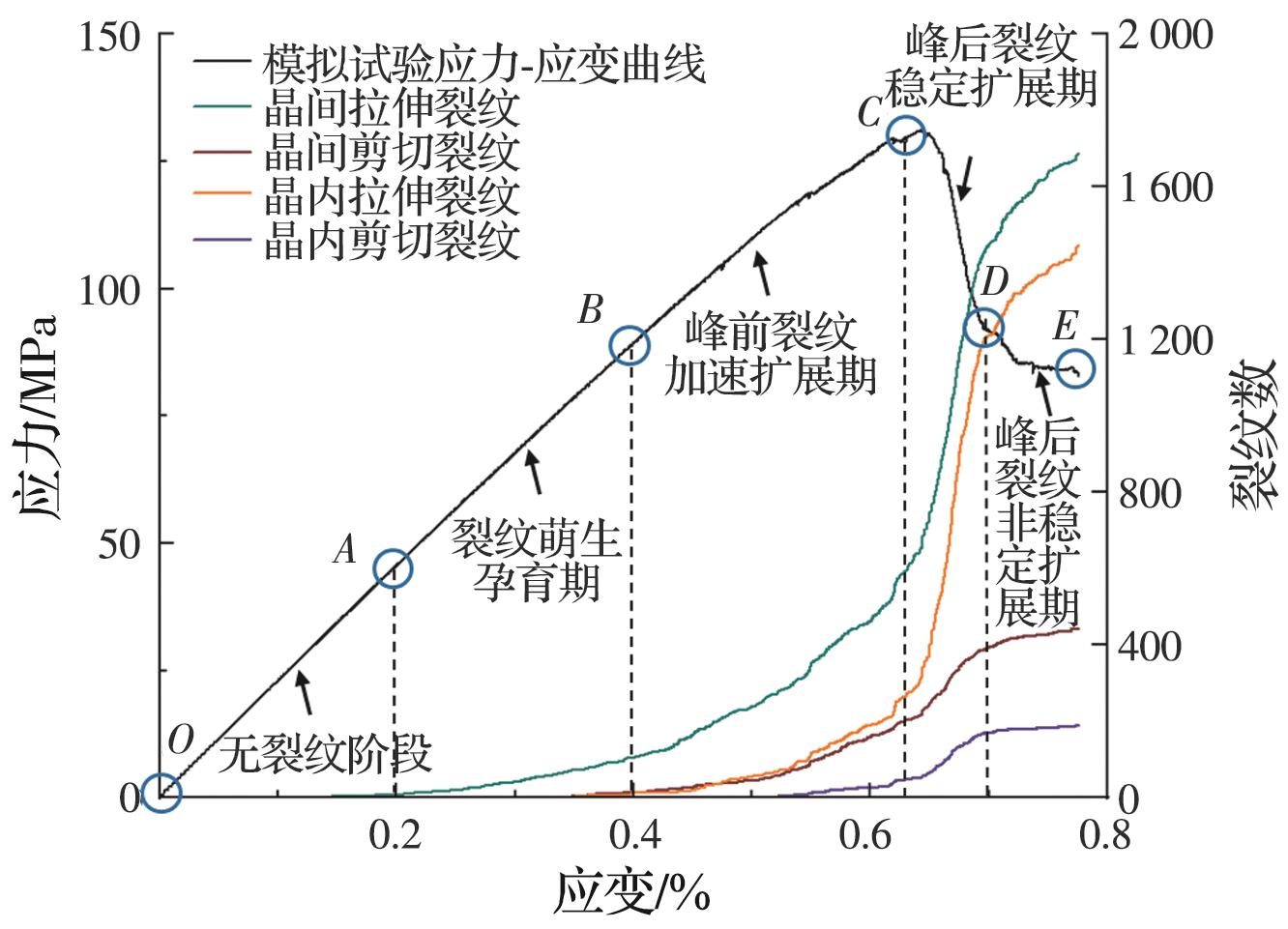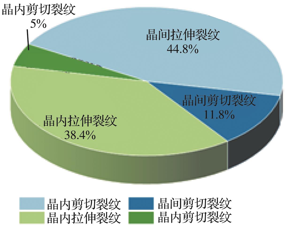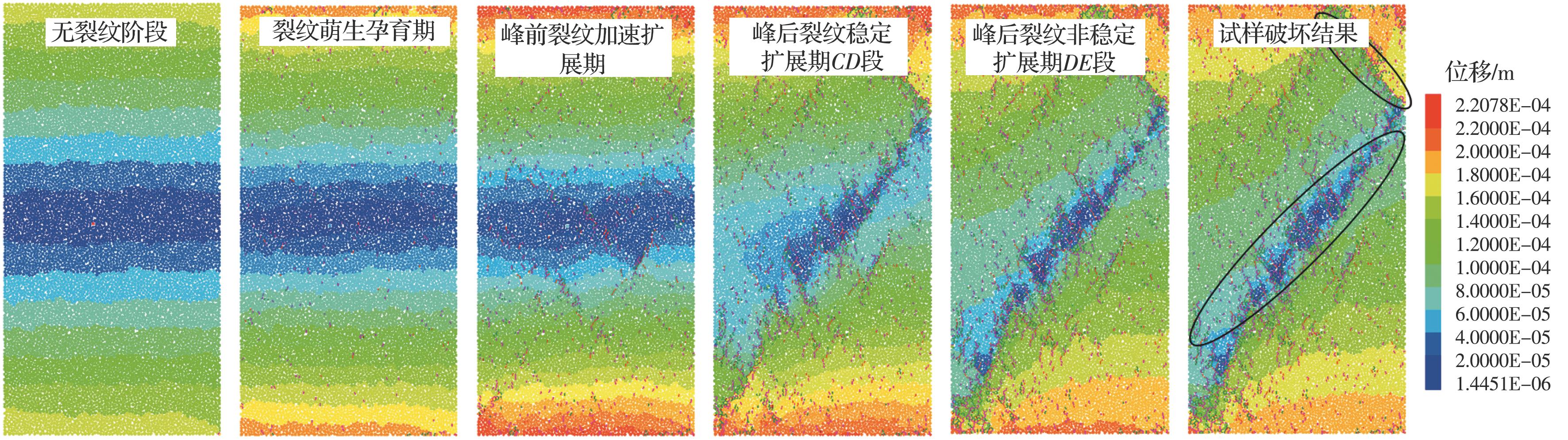 摘要:为了揭示三轴压缩下砂岩的细观破裂规律,以砂岩室内三轴压缩试验为基础,结合非均质晶质模型(grain-based model, GBM)和矩张量理论模拟砂岩内部裂纹衍生、声发射事件及破裂强度发展特征,推导砂岩内微裂纹衍生过程、声发射响应特征规律,从细观尺度上综合分析裂纹以及声发射事件的时空演化过程。结果表明:在三轴压缩下,砂岩起裂阶段微裂纹在试样内部随机分布,位移场呈水平层状分布;随着载荷的增加,微裂纹增多,并逐渐贯通成两条宏观裂纹,位移场偏移且非均质性明显;裂纹在孕育期发展缓慢,当达到发展期时,裂纹以极高的非线性速率增长,其发展顺序为晶间拉伸裂纹、晶间剪切裂纹、晶内拉伸裂纹、晶内剪切裂纹;试样内部拉伸裂纹占比达83.2%,以拉伸破坏为主;试样声发射事件数与裂纹条数呈负指数关系,单次声发射事件产生一条微裂纹次数占比为75.60%,声发射事件数、微裂纹数与破裂强度近似呈正态分布。