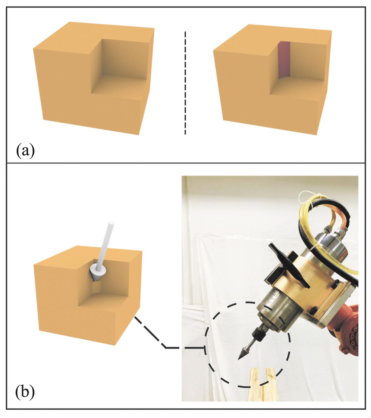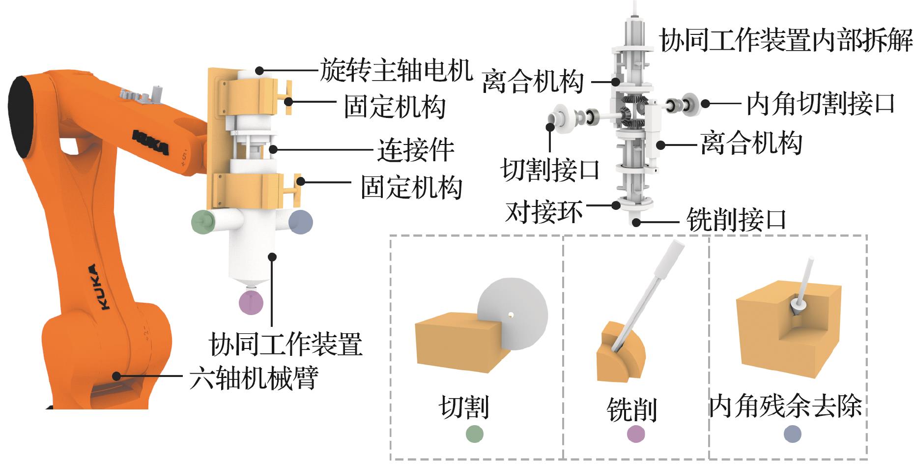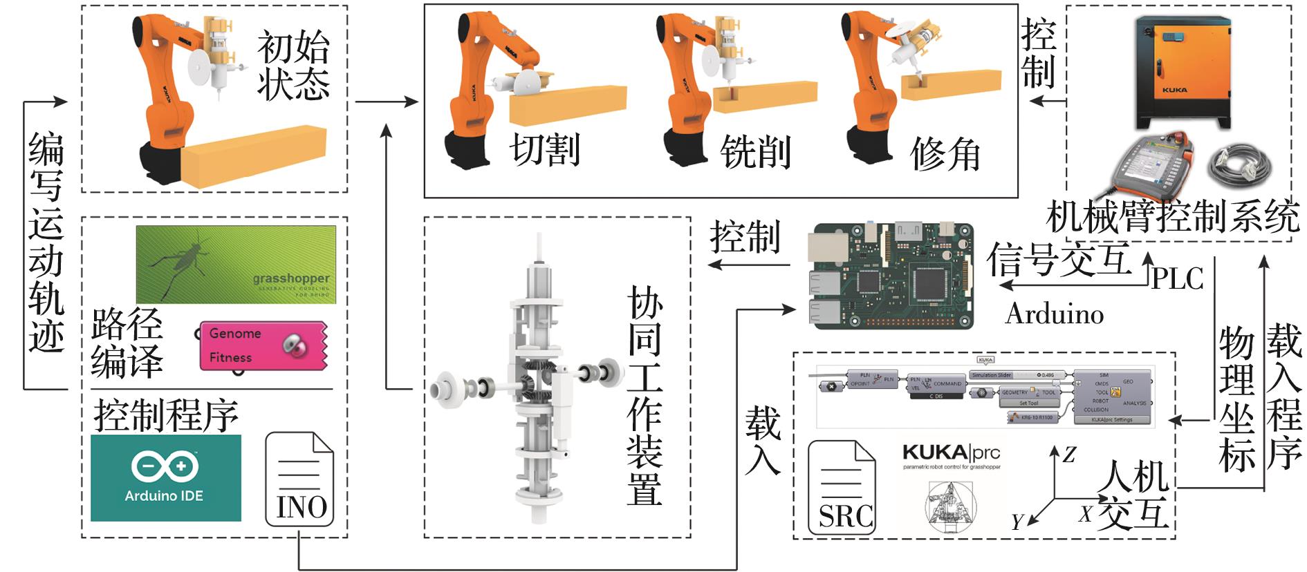 摘要:对于智能建造中的机械臂木结构建造,榫卯木构铣削过程中产生的内角残留问题严重影响木构加工精度。针对这一问题,提出一种基于遗传算法的内角残留去除精加工技术,并开发高度集成化的木构加工装置。借助可视化编程技术对工具适配进行标准程序开发,将已有木构加工技术与机械臂运动系统相结合,构建木构协同加工系统。最后选取木结构中的卯结构进行建造实验。结果表明:基于遗传算法的内角残留去除技术能精准切除残留内角,有效解决铣削技术圆弧形内角残留问题,提出的木构协同加工系统能高效、高精度地完成建造任务。通过实际建造验证了数字建造技术的可行性及适用性。