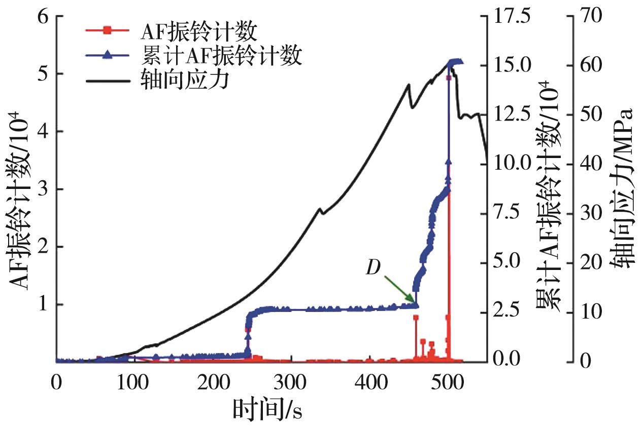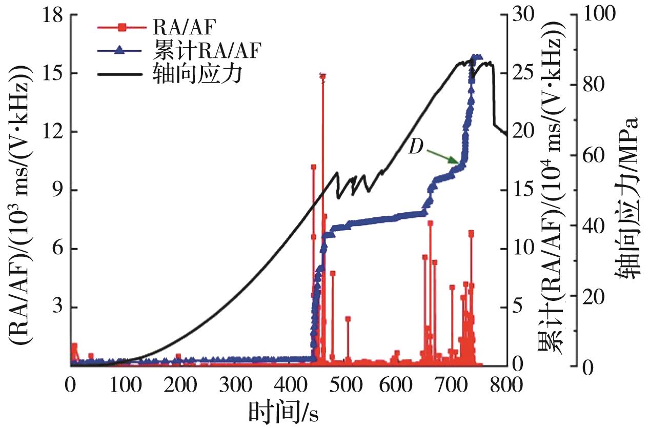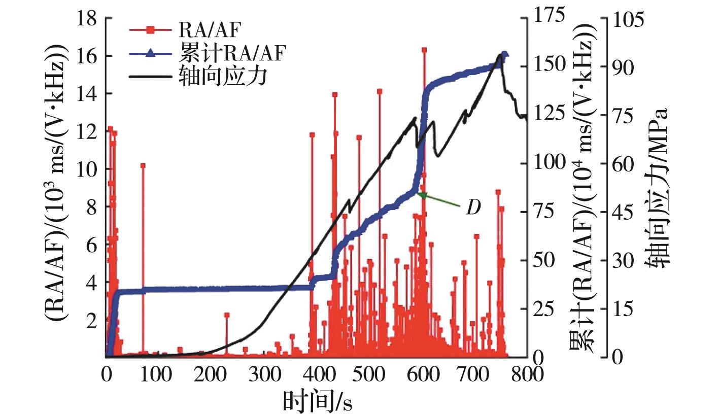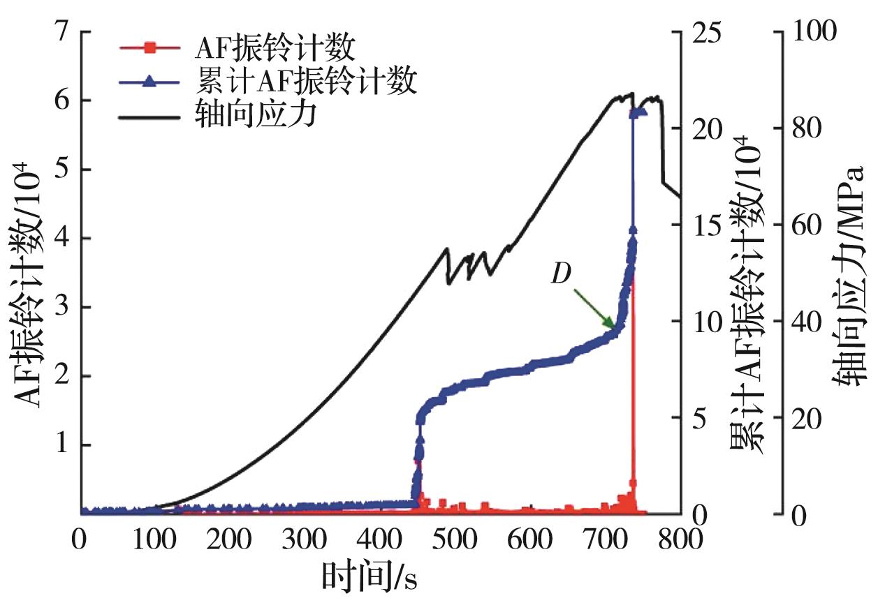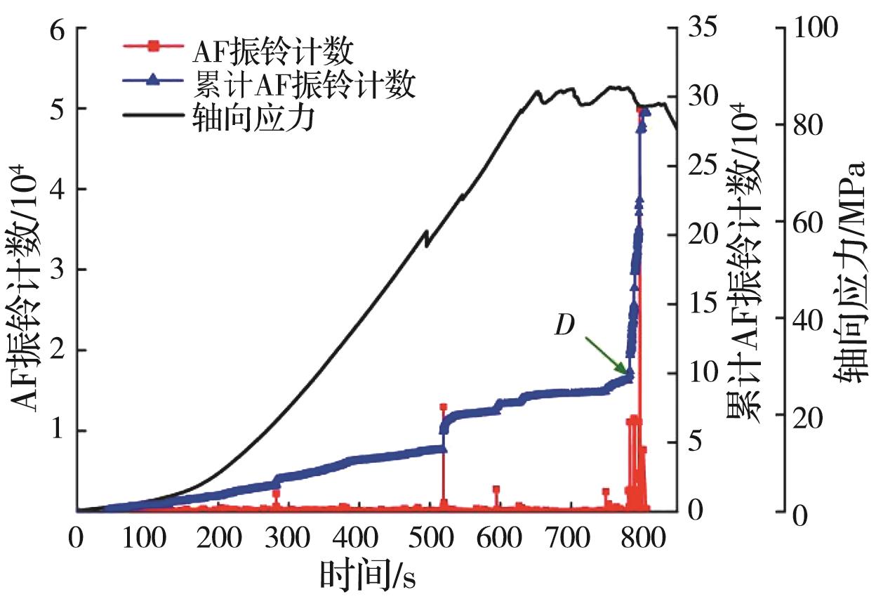 摘要:岩石的裂隙孔洞等缺陷极易引发其局部破坏,对施工安全与运营维护产生不利影响。利用岩石力学测试系统对不同岩桥长度的双圆孔洞凝灰岩进行单轴压缩试验,配合声发射(acoustic emission,简称AE)监测系统对试验全过程进行声发射监测,进行岩石变形破坏过程的声发射特征研究。基于声发射能量、振铃计数、上升时间与幅值的比值(RA)/振铃计数与持续时间的比值(AF)、b值等特征参数,分析不同岩桥长度对岩石破坏的影响,并对其损伤演化特征的前兆信息进行探索。结果表明:声发射参数随时间呈阶段性变化,岩石失稳破坏前有明显异常响应特征;随着岩桥长度的增加,AE能量由群震型向孤震型转变,AE振铃计数经历了平静期、活跃期和突增区,AE RA/AF值对局部细小裂纹扩展较敏感,AE b值随时间经历了上升期、波动期及下降期,总体呈减小趋势;声发射各参数均存在岩石破坏前兆,将AE累计能量、AE累计振铃计数、AE累计RA/AF值的突增点和AE b值的最低点作为“临界破坏前兆点”D,预警时效序列为:AE累计RA/AF值>AE累计振铃计数>AE累计能量>AE b值。