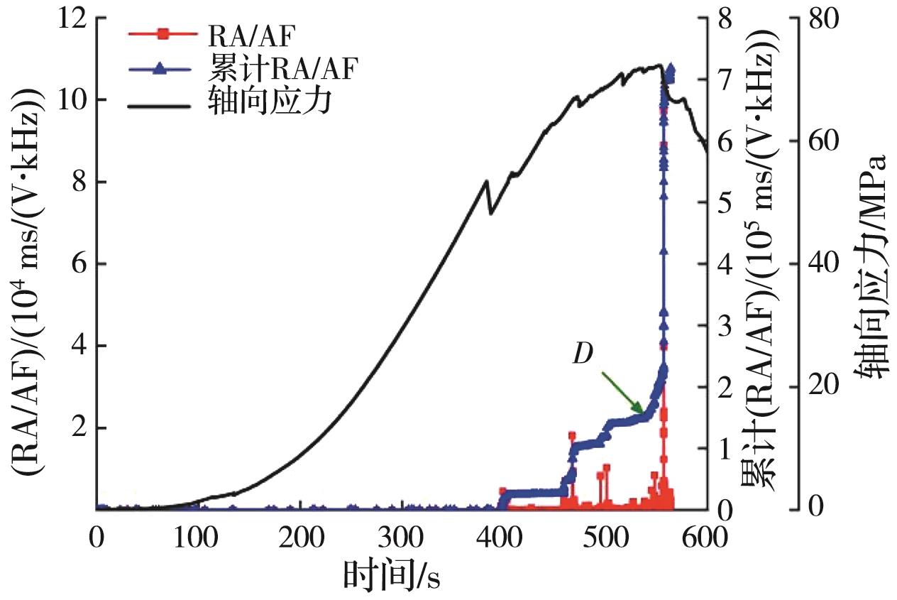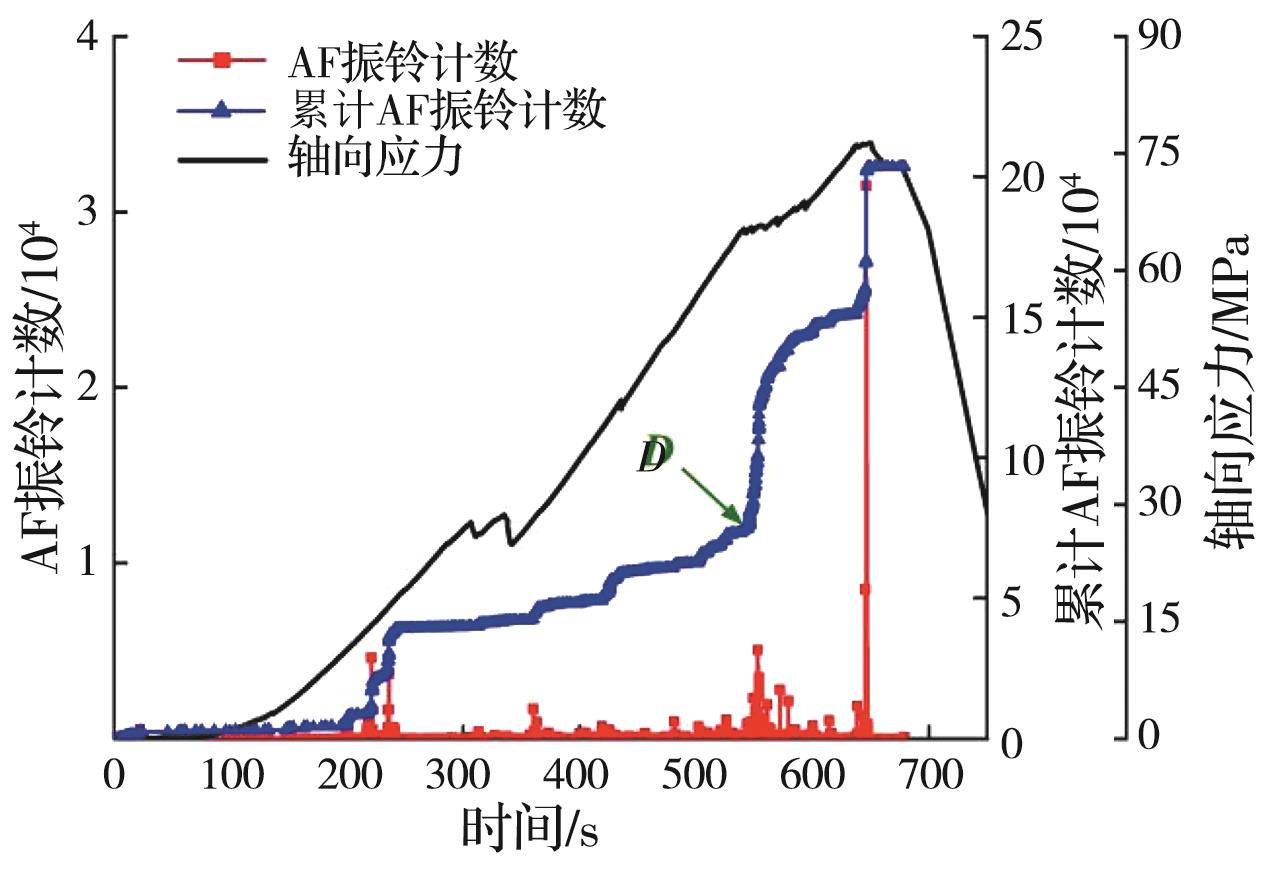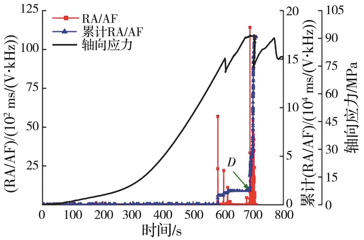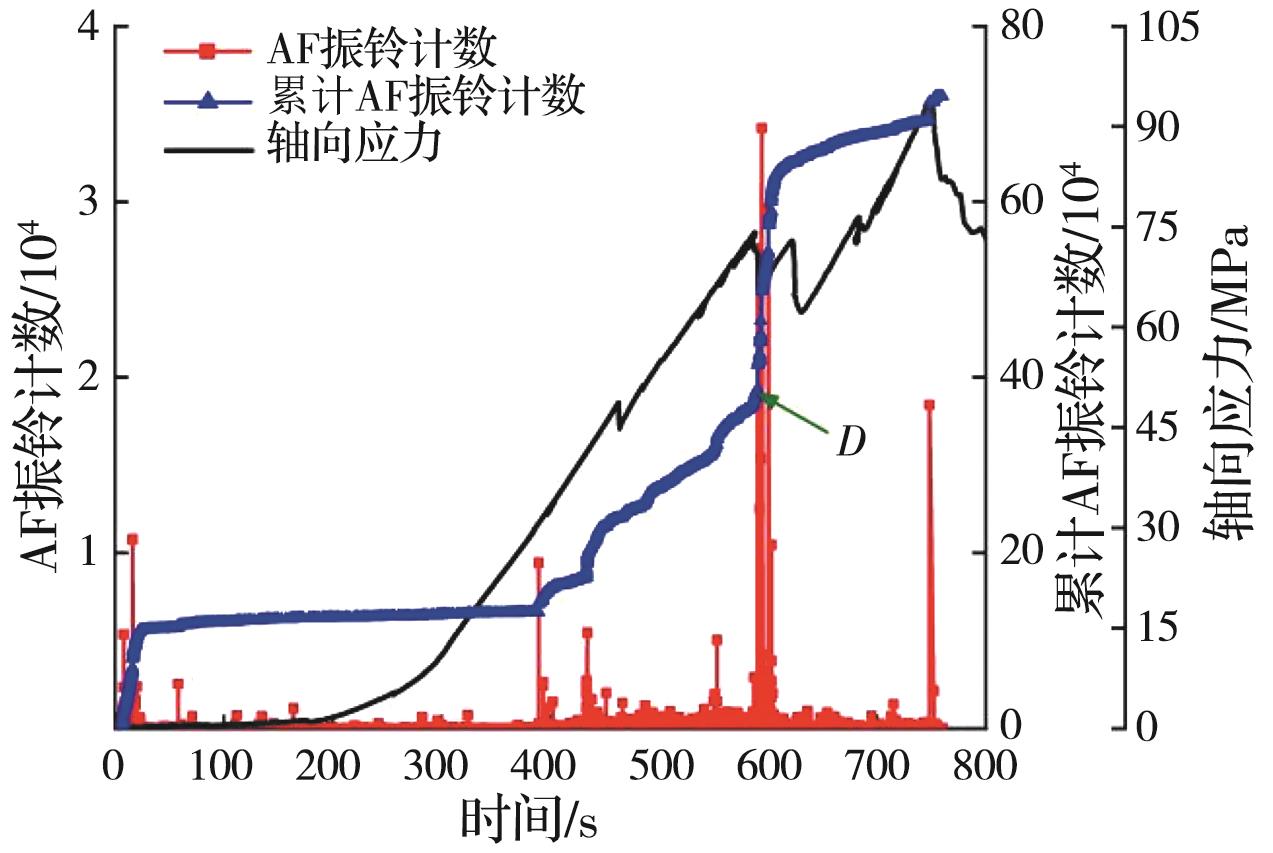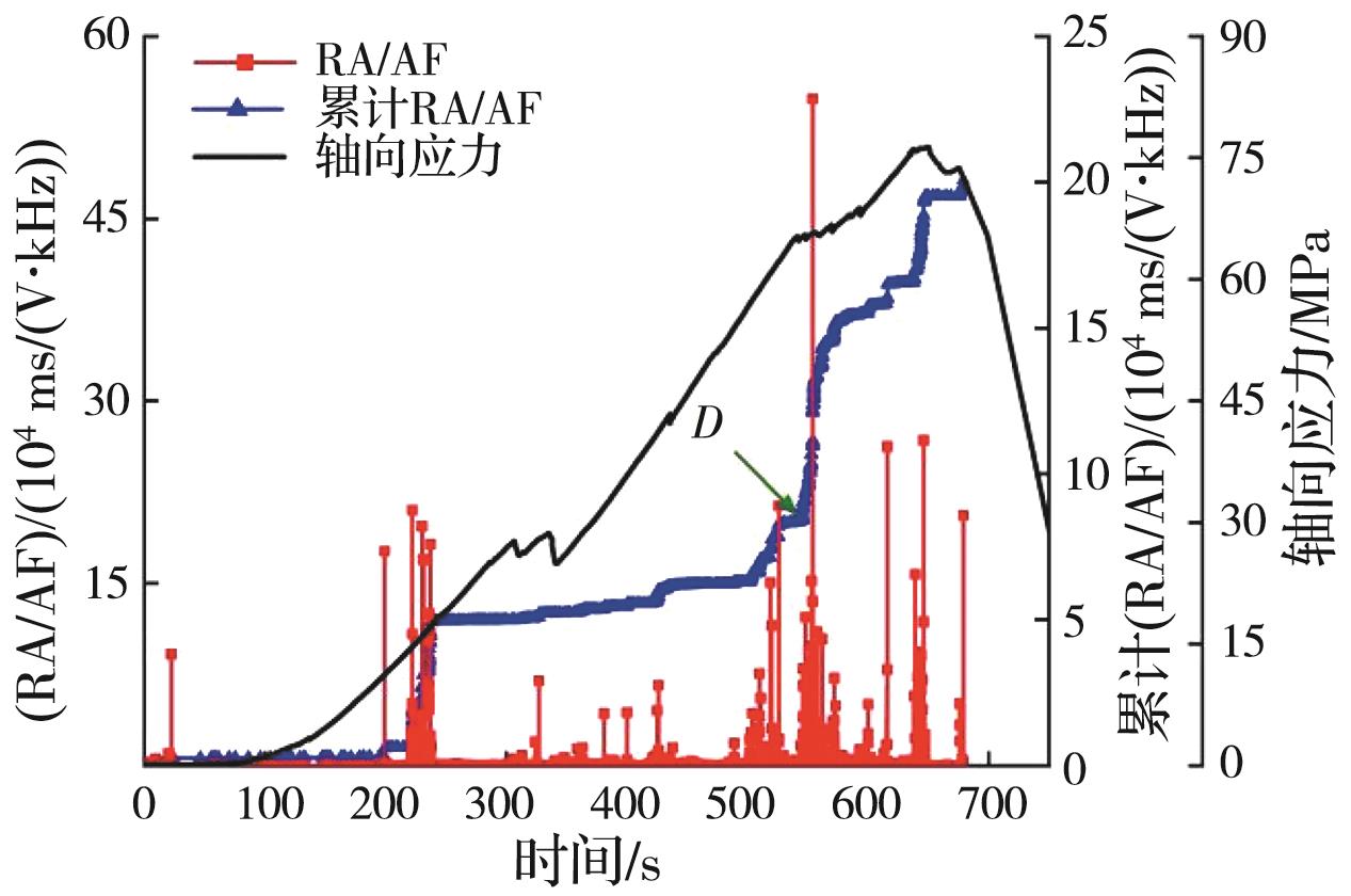 摘要:岩石的裂隙孔洞等缺陷极易引发其局部破坏,对施工安全与运营维护产生不利影响。利用岩石力学测试系统对不同岩桥长度的双圆孔洞凝灰岩进行单轴压缩试验,配合声发射(acoustic emission,简称AE)监测系统对试验全过程进行声发射监测,进行岩石变形破坏过程的声发射特征研究。基于声发射能量、振铃计数、上升时间与幅值的比值(RA)/振铃计数与持续时间的比值(AF)、b值等特征参数,分析不同岩桥长度对岩石破坏的影响,并对其损伤演化特征的前兆信息进行探索。结果表明:声发射参数随时间呈阶段性变化,岩石失稳破坏前有明显异常响应特征;随着岩桥长度的增加,AE能量由群震型向孤震型转变,AE振铃计数经历了平静期、活跃期和突增区,AE RA/AF值对局部细小裂纹扩展较敏感,AE b值随时间经历了上升期、波动期及下降期,总体呈减小趋势;声发射各参数均存在岩石破坏前兆,将AE累计能量、AE累计振铃计数、AE累计RA/AF值的突增点和AE b值的最低点作为“临界破坏前兆点”D,预警时效序列为:AE累计RA/AF值>AE累计振铃计数>AE累计能量>AE b值。