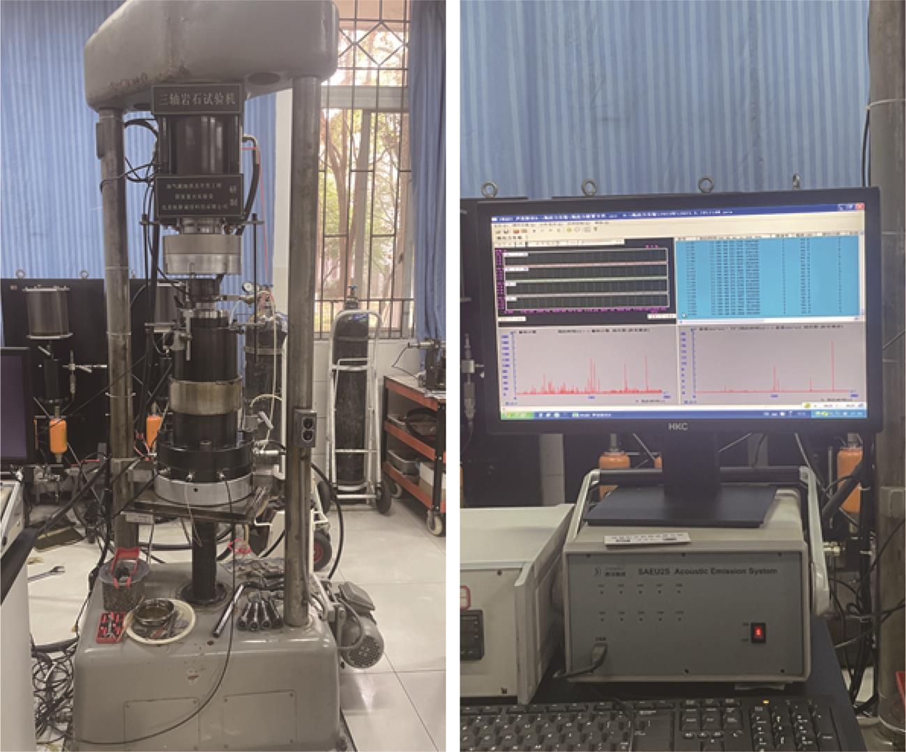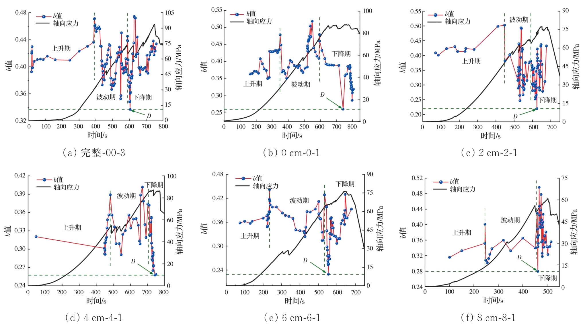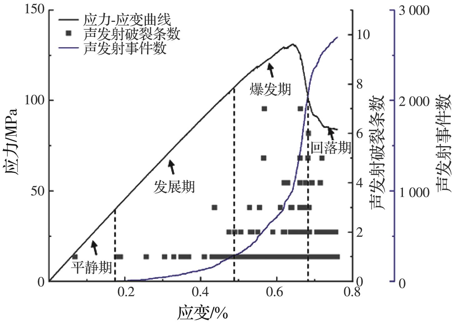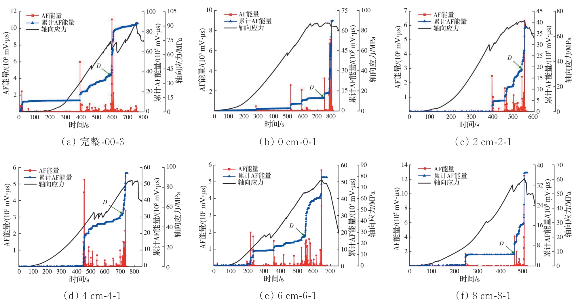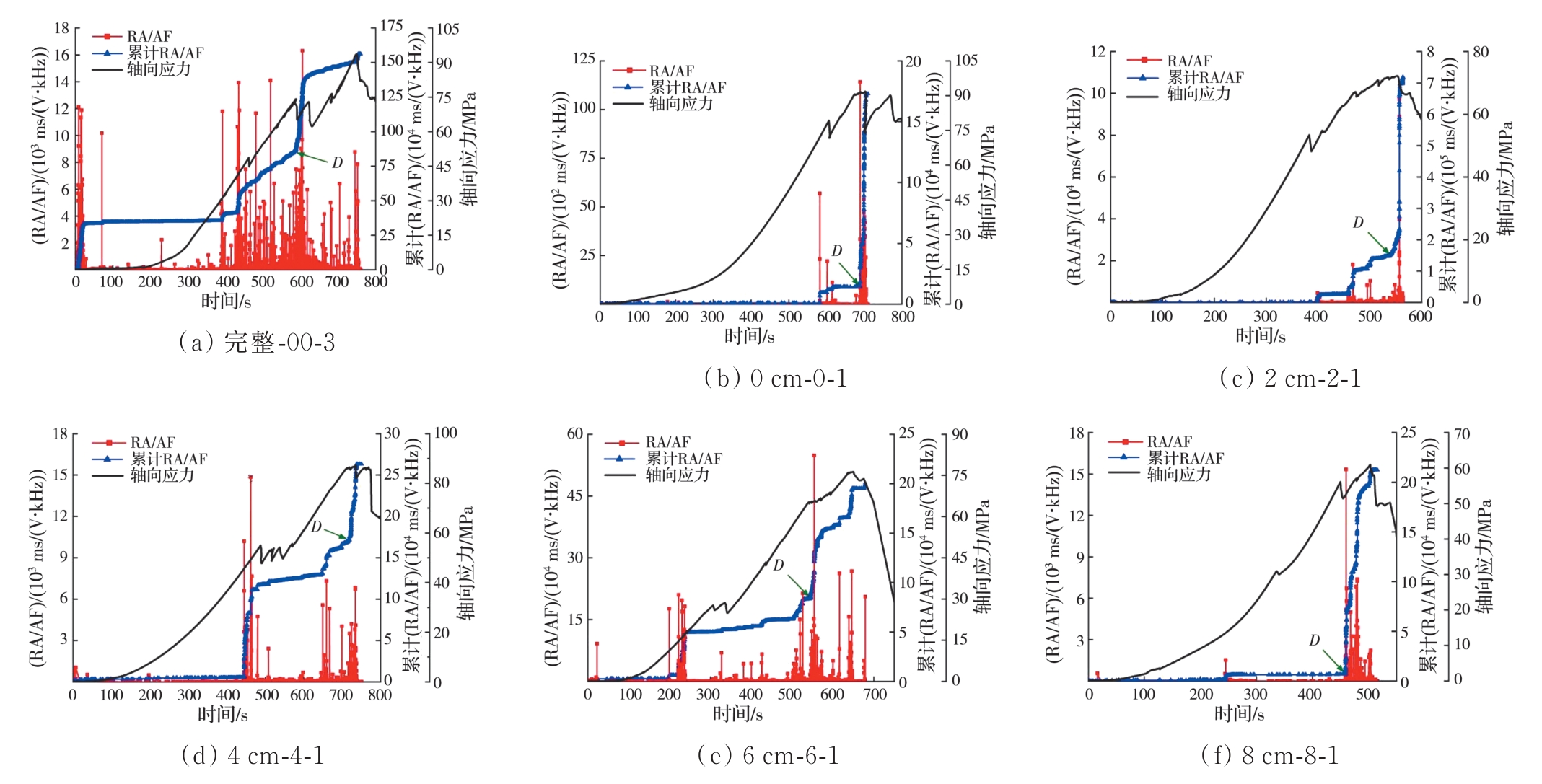 摘要:岩石的裂隙孔洞等缺陷极易引发其局部破坏,对施工安全与运营维护产生不利影响。利用岩石力学测试系统对不同岩桥长度的双圆孔洞凝灰岩进行单轴压缩试验,配合声发射(acoustic emission,简称AE)监测系统对试验全过程进行声发射监测,进行岩石变形破坏过程的声发射特征研究。基于声发射能量、振铃计数、上升时间与幅值的比值(RA)/振铃计数与持续时间的比值(AF)、b值等特征参数,分析不同岩桥长度对岩石破坏的影响,并对其损伤演化特征的前兆信息进行探索。结果表明:声发射参数随时间呈阶段性变化,岩石失稳破坏前有明显异常响应特征;随着岩桥长度的增加,AE能量由群震型向孤震型转变,AE振铃计数经历了平静期、活跃期和突增区,AE RA/AF值对局部细小裂纹扩展较敏感,AE b值随时间经历了上升期、波动期及下降期,总体呈减小趋势;声发射各参数均存在岩石破坏前兆,将AE累计能量、AE累计振铃计数、AE累计RA/AF值的突增点和AE b值的最低点作为“临界破坏前兆点”D,预警时效序列为:AE累计RA/AF值>AE累计振铃计数>AE累计能量>AE b值。