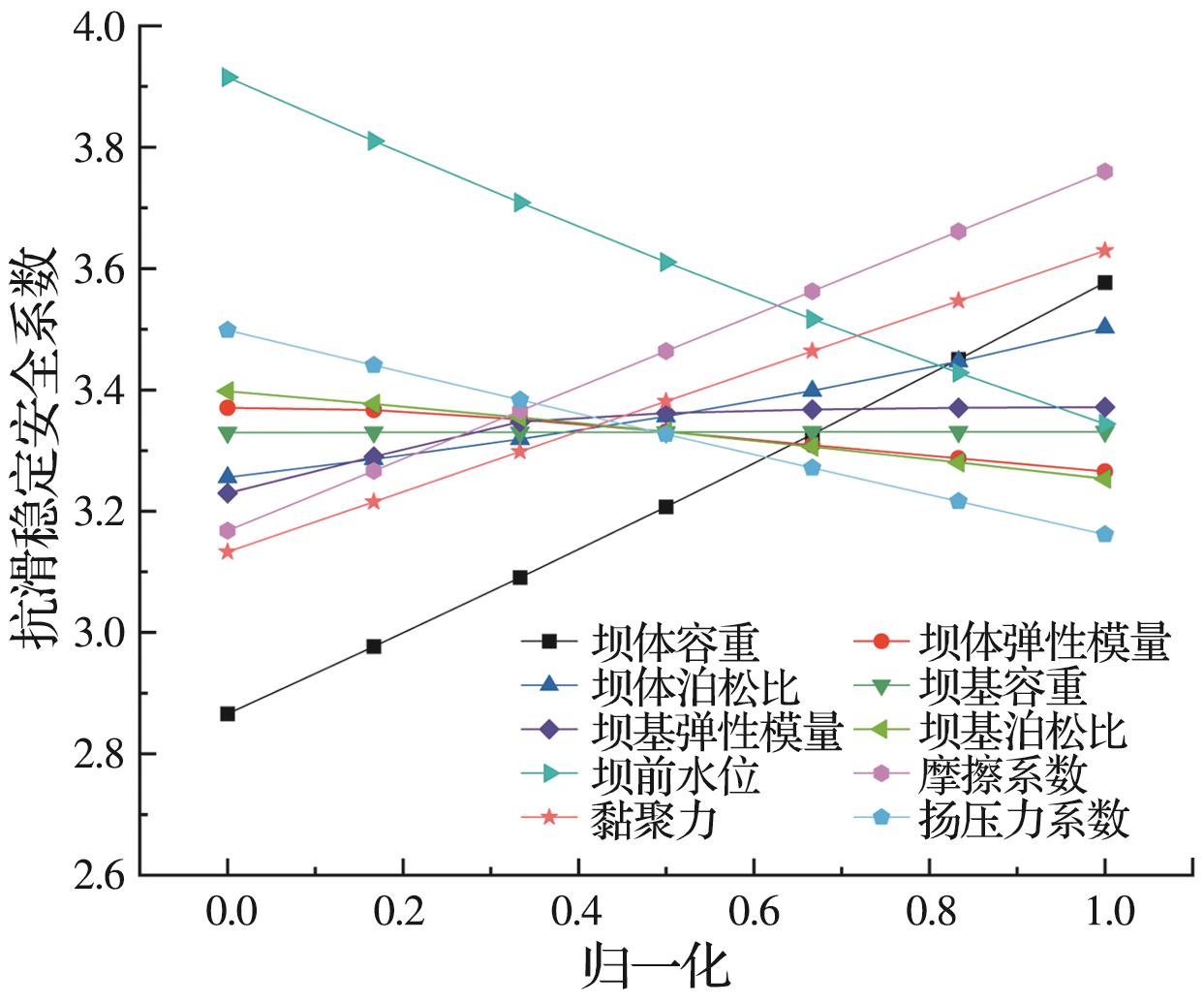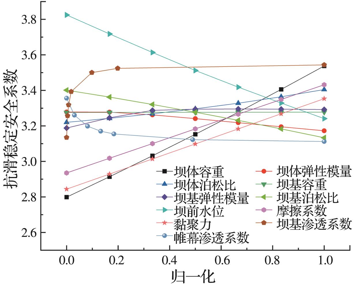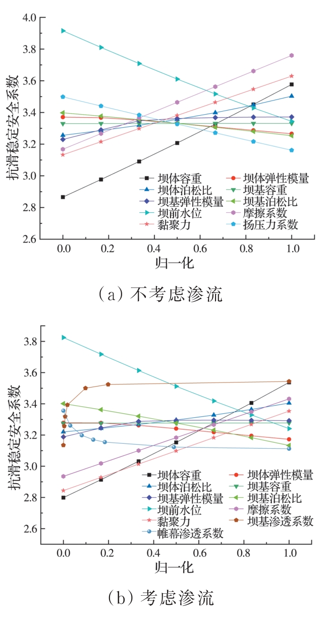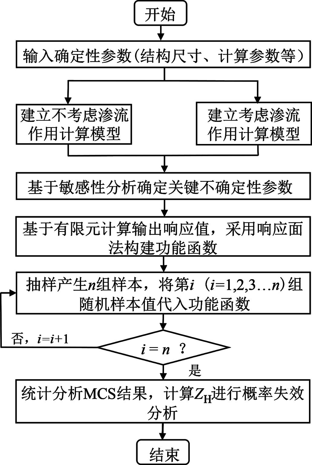 摘要:重力坝服役期间,渗流会对大坝稳定及应力产生不利影响,研究重力坝在渗流作用下的可靠度具有重要意义。将响应面法与随机有限元法结合,提出考虑渗流作用的重力坝稳定与应力高效可靠度分析方法。依托某水电站工程,通过敏感性分析,确定影响重力坝抗滑稳定与应力的关键不确定性参数;基于响应面法构建渗流作用下重力坝抗滑稳定安全系数的功能函数,计算多破坏模式的失效概率并与不考虑渗流作用的结果进行对比分析;采用概率失效分析方法定量分析关键不确定性参数对重力坝失效概率的影响。结果表明:考虑渗流作用计算得到的失效概率较高,忽略渗流作用会导致低估重力坝失效概率;比较3种失效模式,坝踵拉裂与沿坝基面滑动失稳最容易发生,其次是坝趾压坏。
