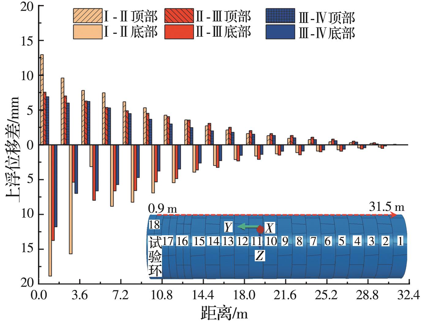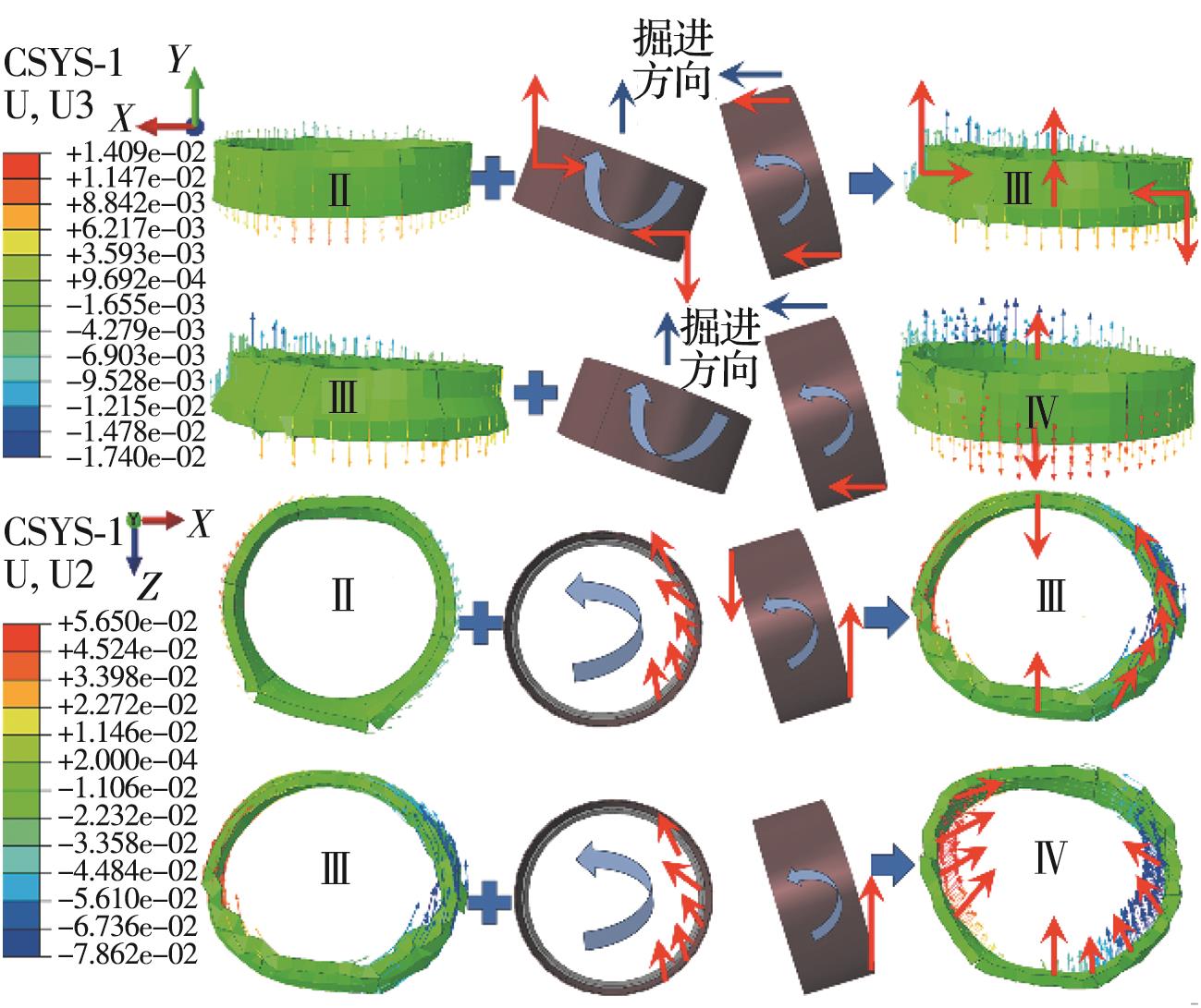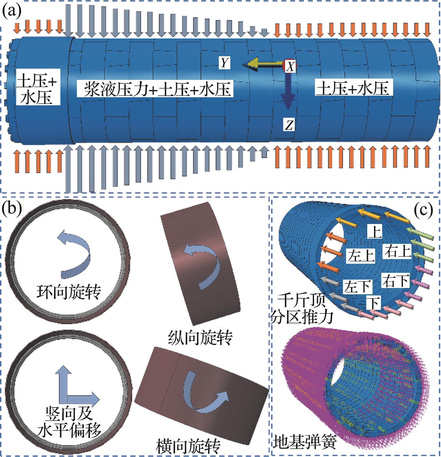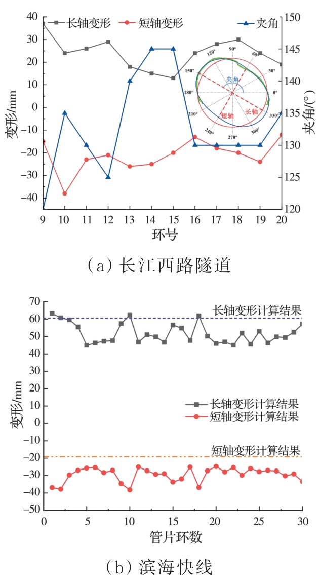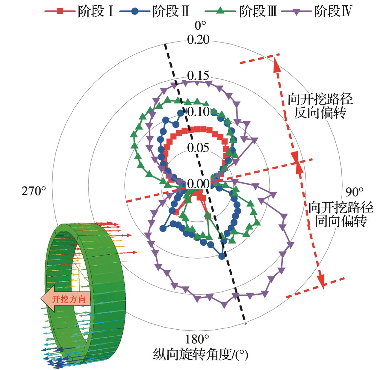 摘要:复合地层盾构掘进过程中,盾构机常会由于空间姿态偏移而与管片发生复杂相互作用,使得管片各部位发生多维变形响应,管片上浮位移和错台超限。为探明施工过程中管片结构响应及其衍生机制,建立多源荷载耦合作用三维数值计算模型,计算分析管片空间变形分布及其过程演化特性,通过现场三维激光雷达测试揭示管片变形演化模式,并对数值计算结果进行校验。结果表明,施工过程中管片“斜鸭蛋”状长轴变形增量的64%发生在完全脱出盾尾前,管片各部位纵向旋转角均值增量的50%发生在管片完全脱出盾尾后,而环向旋转角增量的44%发生在逐渐脱出盾尾阶段。管片环向位移持续发展主要由盾壳环向旋转引起,在管片完全脱出盾尾后,其径向位移发展及形状改变主要受其自身环向位移改变的影响,其纵向位移的进一步发展主要受盾壳纵向偏转的影响。三维激光雷达点云测量能精确地定量评估施工过程中管片长轴和短轴变形及长轴夹角的变化。