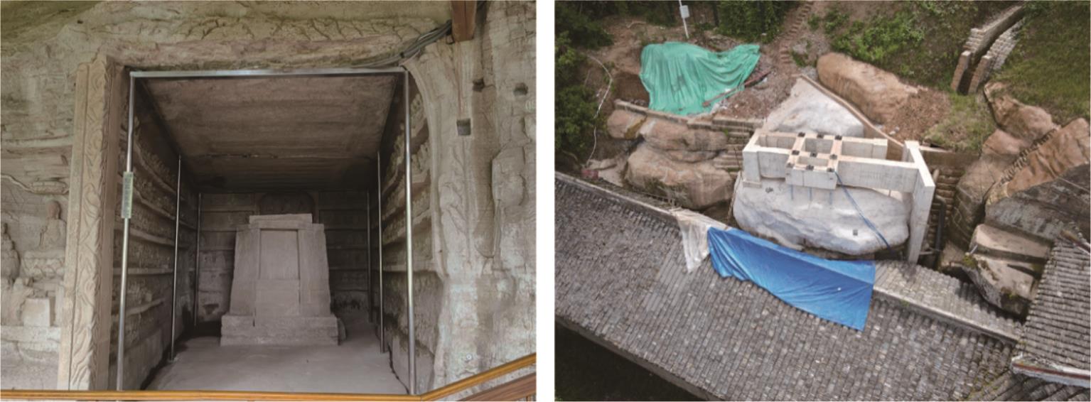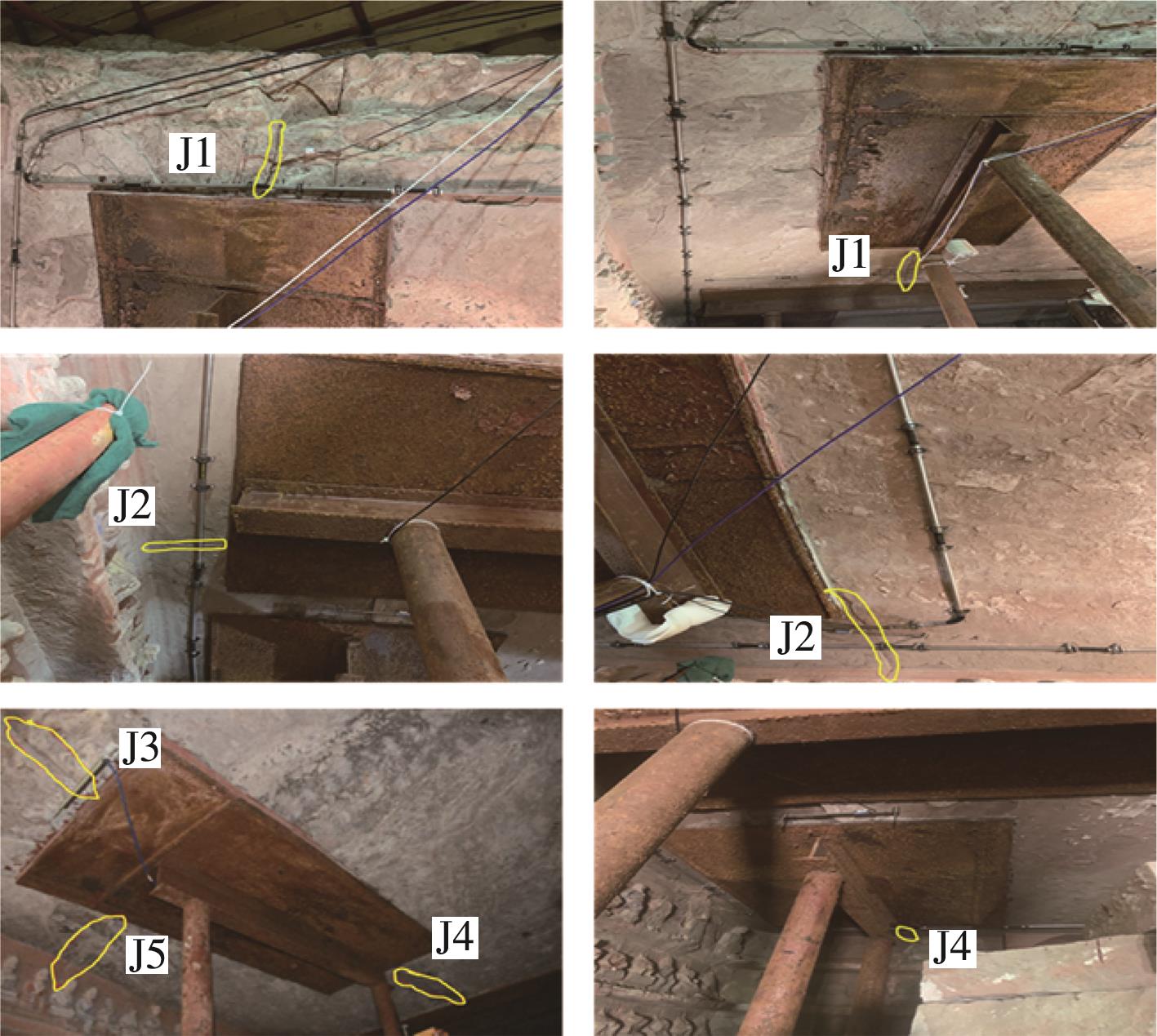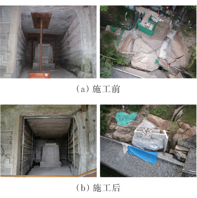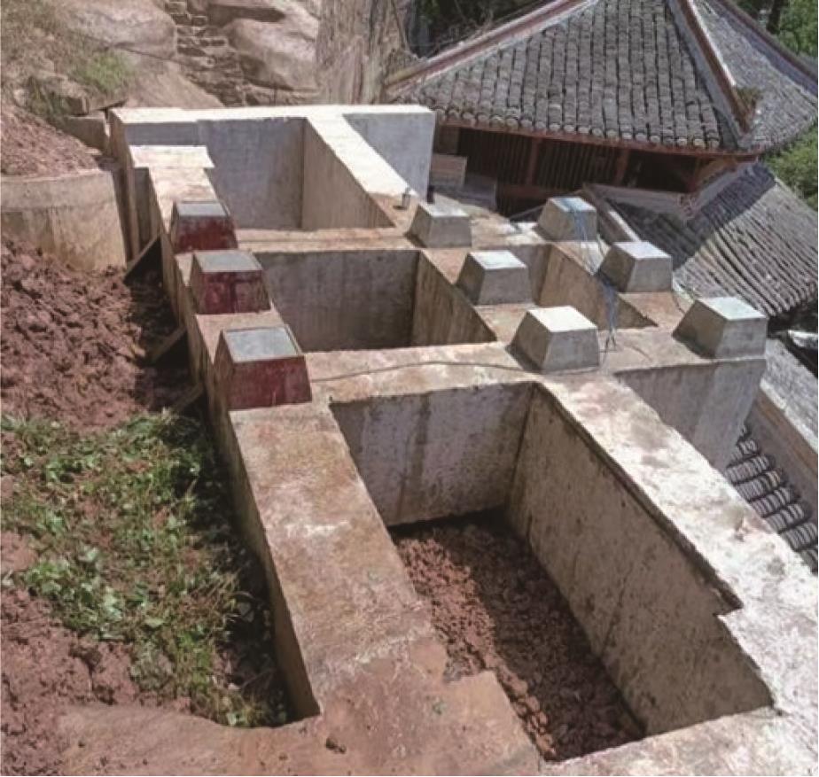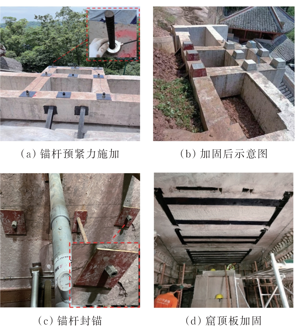 摘要:在多年风化作用和自重应力的影响下,大足石刻北山168窟的石窟壁和顶板位置出现了大量裂缝,导致洞窟顶部围岩的稳定性变差,面临失稳坍塌的风险,为了对平顶石窟顶板破碎围岩进行有效加固,针对现场地质情况,采用悬吊锚杆加固方式。首先通过现场调查确定顶板裂缝的分布规律,分析石窟顶板开裂的主要原因;然后利用新奥法思想,在考虑最不利围岩受力的情况下计算锚杆的锚固长度;最后利用数值模拟手段,分析悬吊锚杆加固方法在降雨条件下石窟顶板的位移变化及应力情况。结果表明:在悬吊锚杆加固下,其顶板各个方向位移均不超过1 mm;石窟洞口位置及靠近洞内位置的应力较为集中,最大拉应力小于砂岩的抗拉强度值,顶板围岩处于稳定状态;悬吊锚杆加固中锚固段承受拉应力,平均所受轴力为31 kN,受力情况较好。从加固前后的监测曲线可以看出,悬吊锚杆加固方式减少了裂缝的波动值,可以认为在悬吊锚杆加固下石窟保持稳定状态。