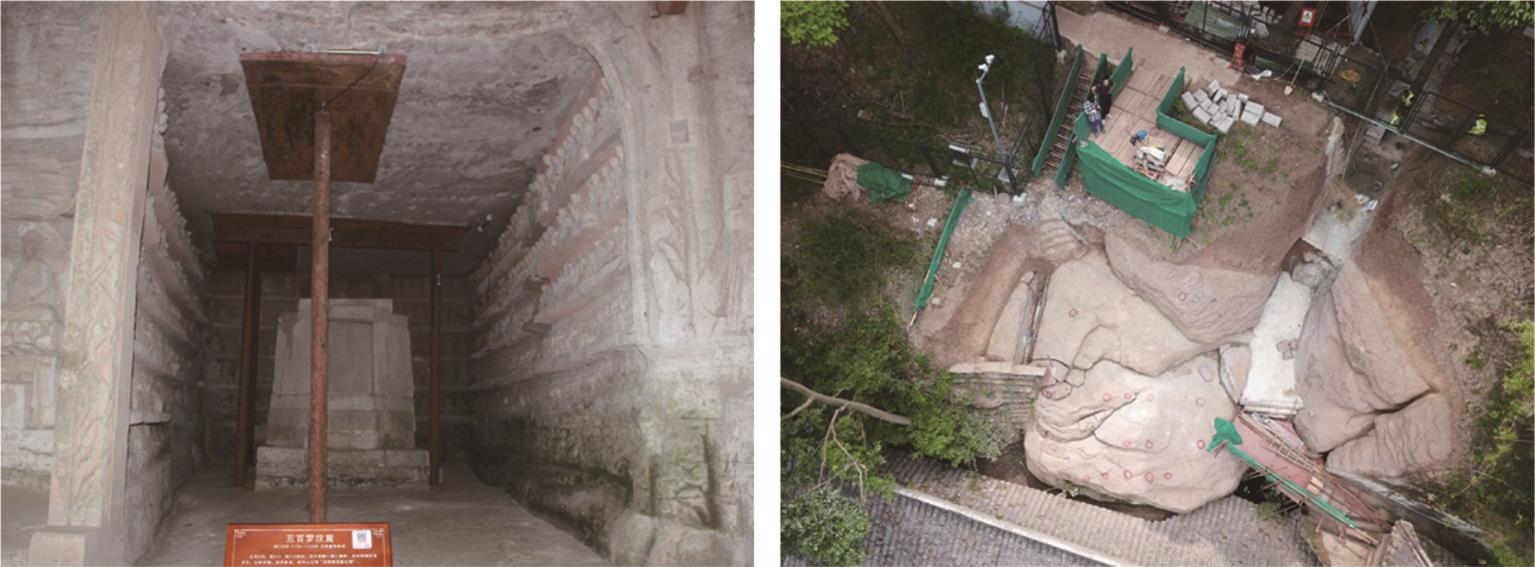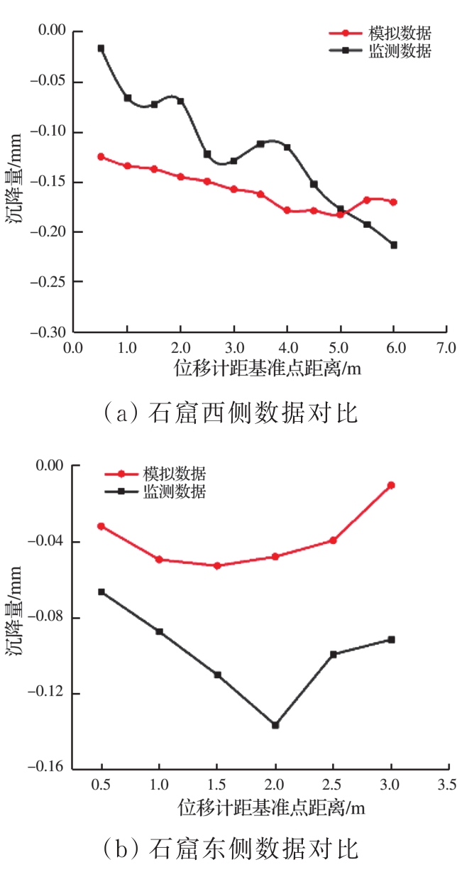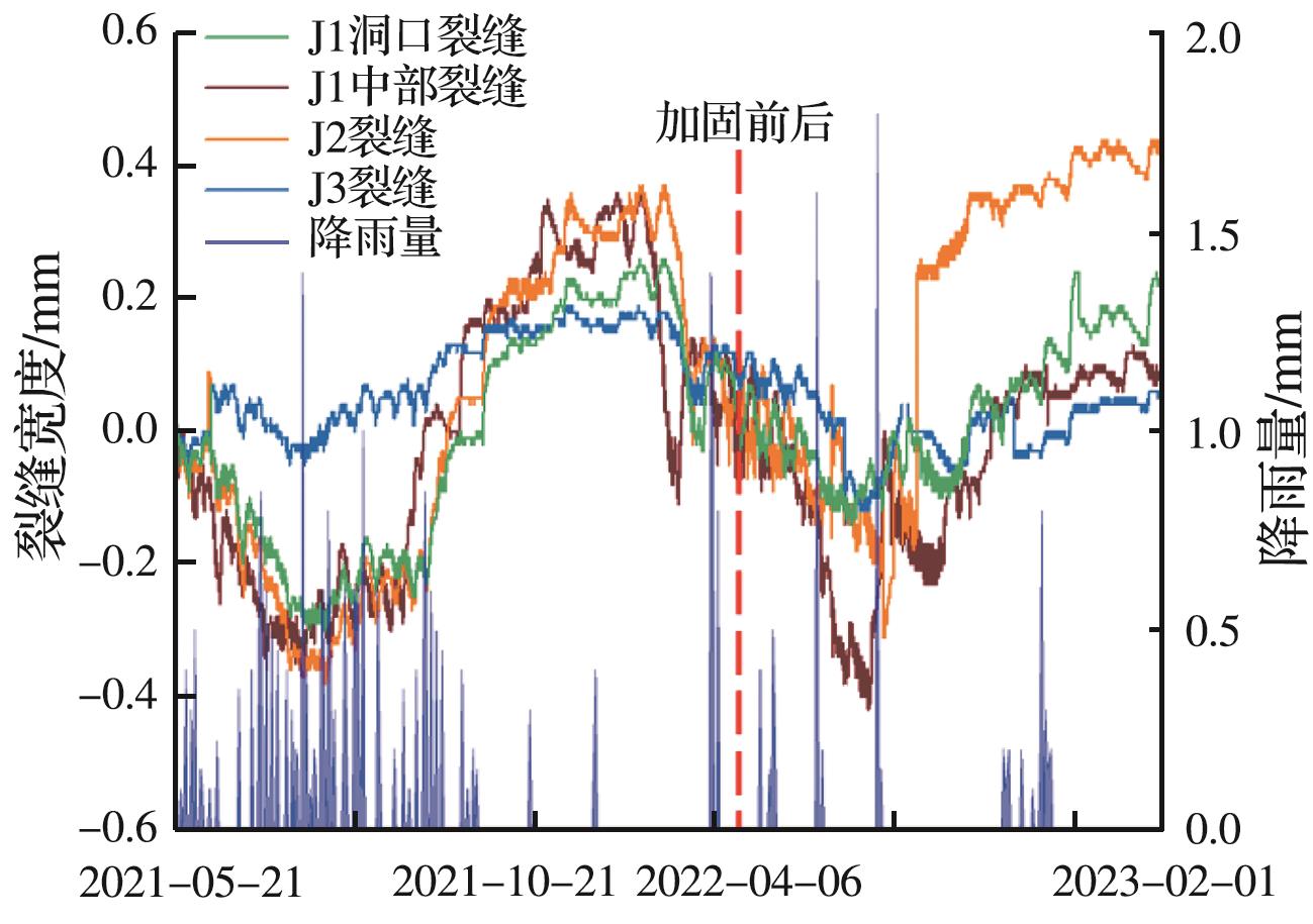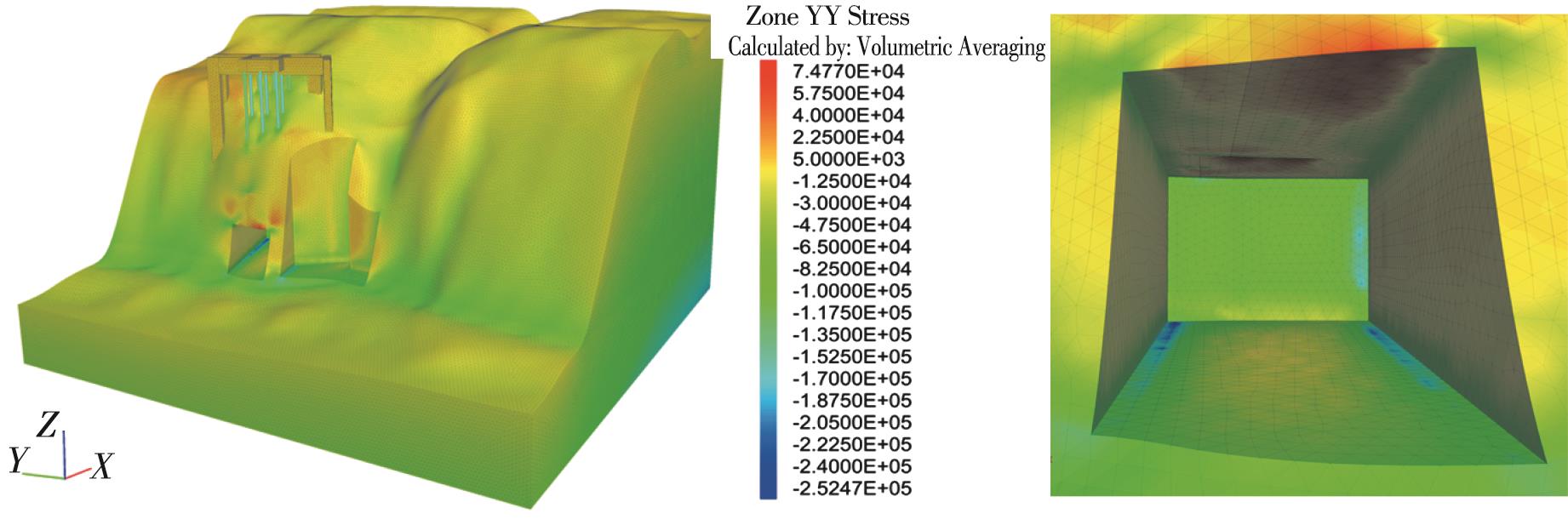 摘要:在多年风化作用和自重应力的影响下,大足石刻北山168窟的石窟壁和顶板位置出现了大量裂缝,导致洞窟顶部围岩的稳定性变差,面临失稳坍塌的风险,为了对平顶石窟顶板破碎围岩进行有效加固,针对现场地质情况,采用悬吊锚杆加固方式。首先通过现场调查确定顶板裂缝的分布规律,分析石窟顶板开裂的主要原因;然后利用新奥法思想,在考虑最不利围岩受力的情况下计算锚杆的锚固长度;最后利用数值模拟手段,分析悬吊锚杆加固方法在降雨条件下石窟顶板的位移变化及应力情况。结果表明:在悬吊锚杆加固下,其顶板各个方向位移均不超过1 mm;石窟洞口位置及靠近洞内位置的应力较为集中,最大拉应力小于砂岩的抗拉强度值,顶板围岩处于稳定状态;悬吊锚杆加固中锚固段承受拉应力,平均所受轴力为31 kN,受力情况较好。从加固前后的监测曲线可以看出,悬吊锚杆加固方式减少了裂缝的波动值,可以认为在悬吊锚杆加固下石窟保持稳定状态。