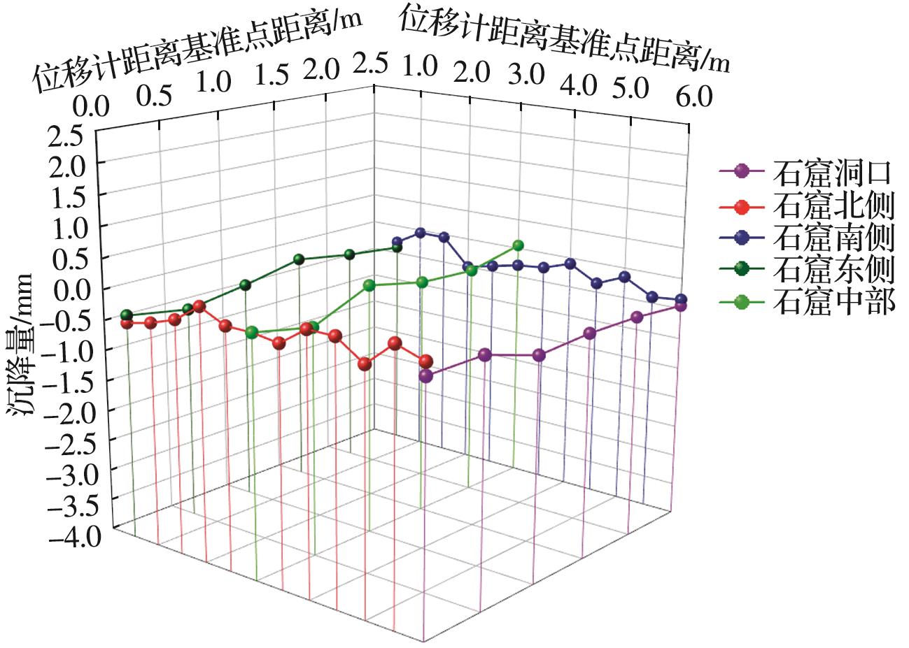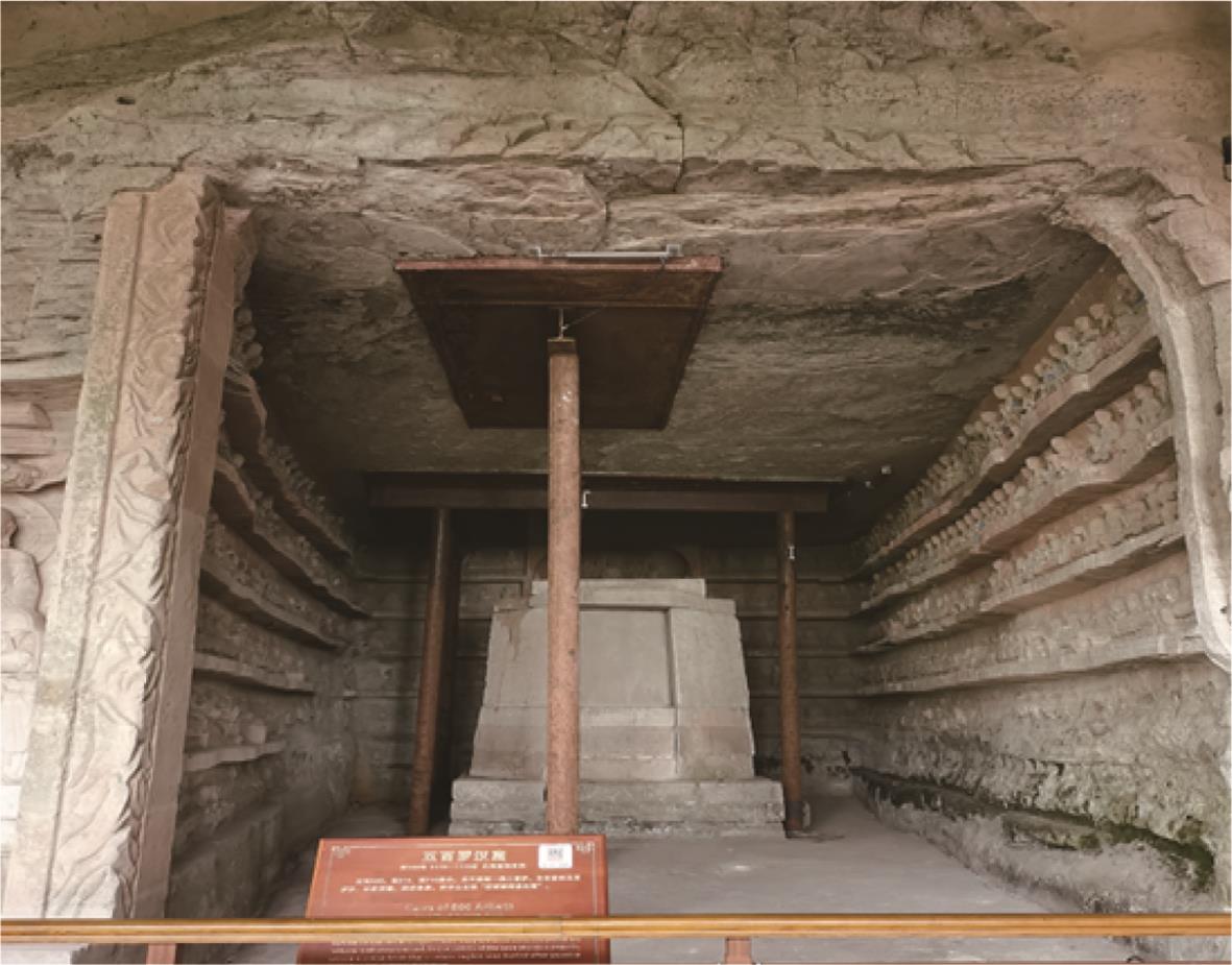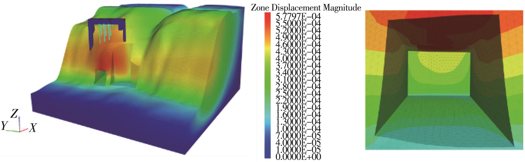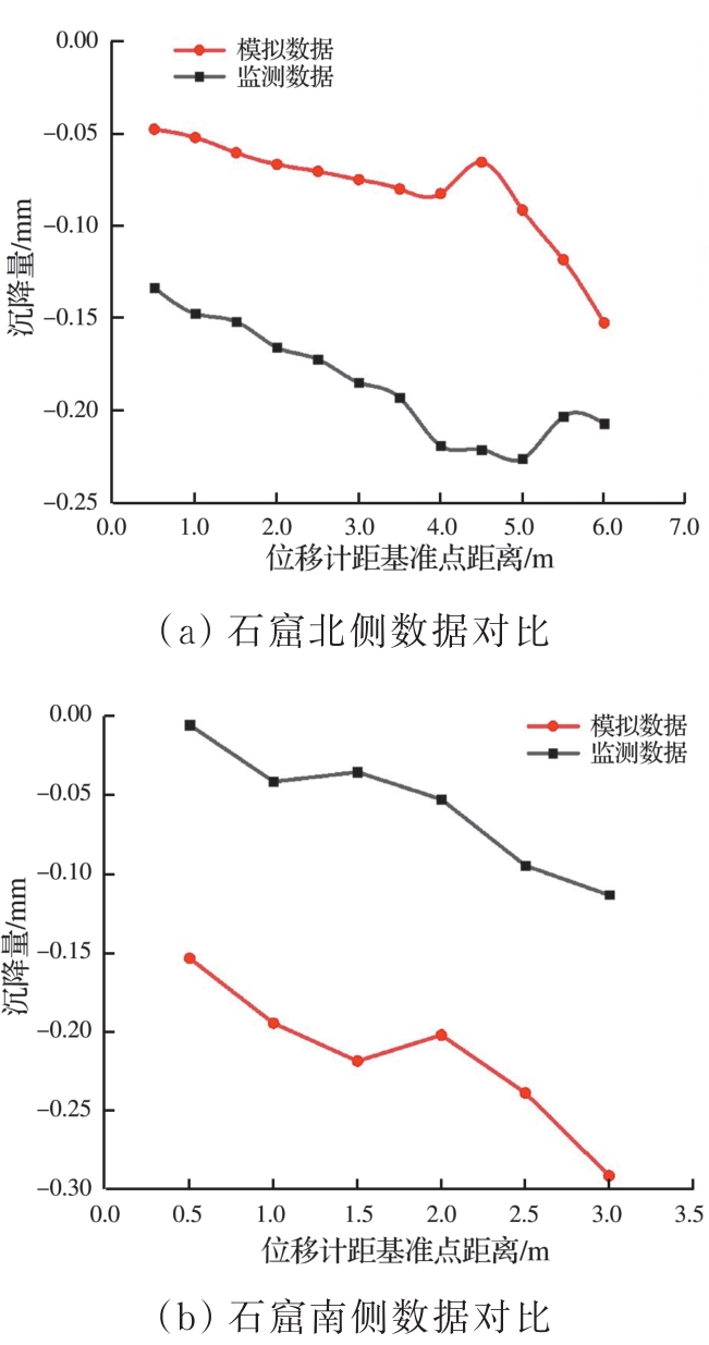 摘要:在多年风化作用和自重应力的影响下,大足石刻北山168窟的石窟壁和顶板位置出现了大量裂缝,导致洞窟顶部围岩的稳定性变差,面临失稳坍塌的风险,为了对平顶石窟顶板破碎围岩进行有效加固,针对现场地质情况,采用悬吊锚杆加固方式。首先通过现场调查确定顶板裂缝的分布规律,分析石窟顶板开裂的主要原因;然后利用新奥法思想,在考虑最不利围岩受力的情况下计算锚杆的锚固长度;最后利用数值模拟手段,分析悬吊锚杆加固方法在降雨条件下石窟顶板的位移变化及应力情况。结果表明:在悬吊锚杆加固下,其顶板各个方向位移均不超过1 mm;石窟洞口位置及靠近洞内位置的应力较为集中,最大拉应力小于砂岩的抗拉强度值,顶板围岩处于稳定状态;悬吊锚杆加固中锚固段承受拉应力,平均所受轴力为31 kN,受力情况较好。从加固前后的监测曲线可以看出,悬吊锚杆加固方式减少了裂缝的波动值,可以认为在悬吊锚杆加固下石窟保持稳定状态。