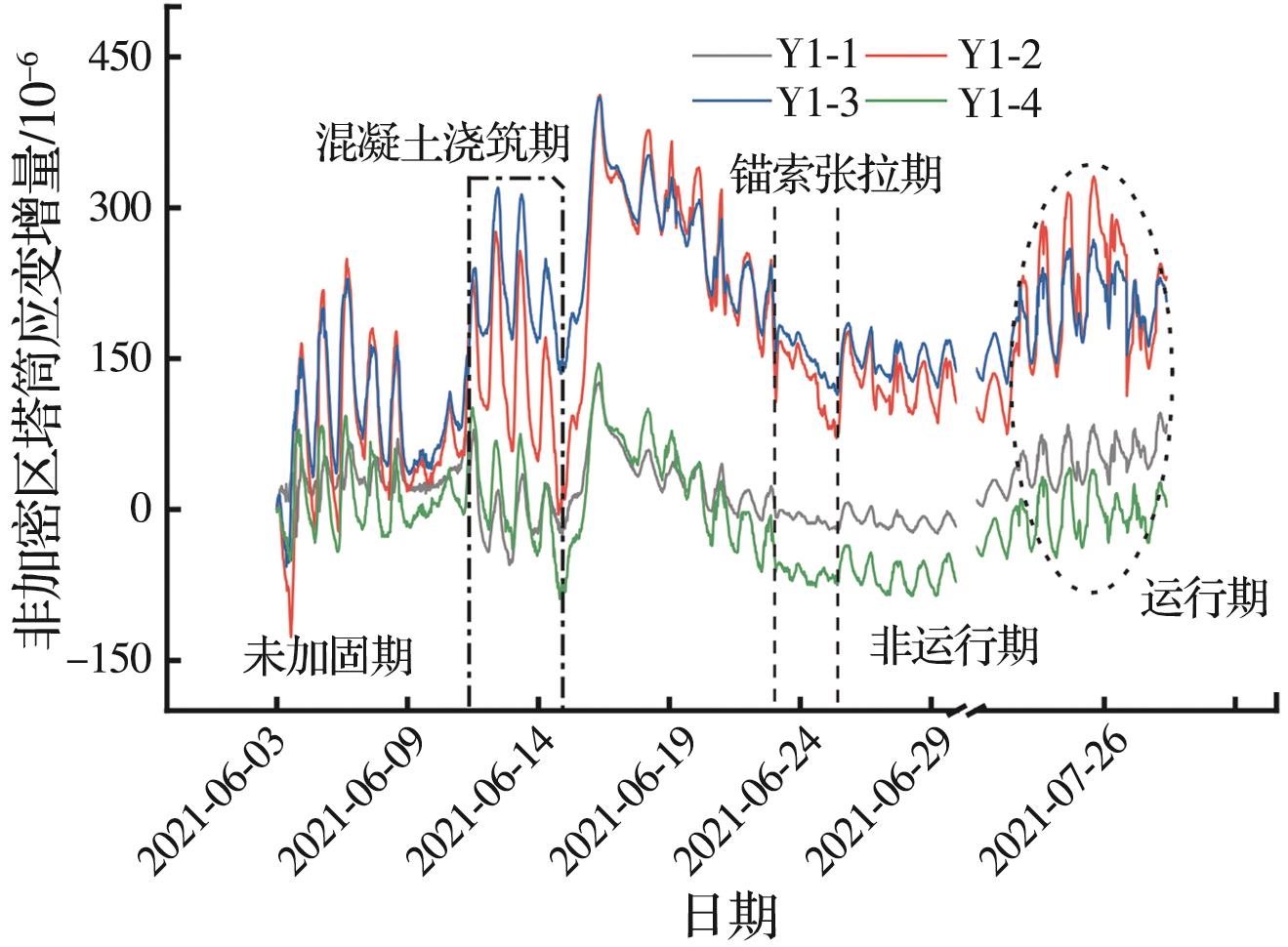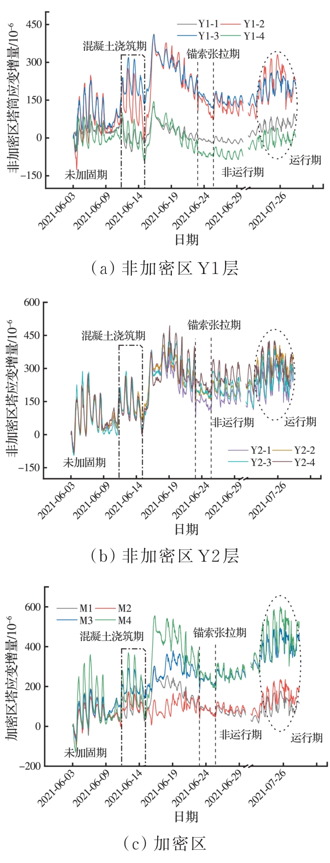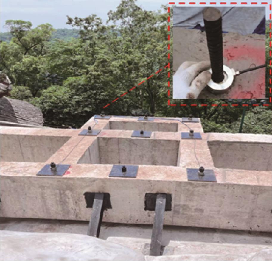 摘要:针对风机运行期间所受荷载的复杂性,依托威海某风电机组基础加固项目,提出一种系统监测方法,结合现场环境,评估加固基础的性能提升效果。从施工阶段到运行阶段,采集加固基础的塔筒应变、焊钉应变及锚索轴力等数据,研究风机加固基础在不同工况下的受力响应,并开展相关性分析,探讨基础加固后的性能提升效果及荷载传递机理。结果表明:加固区中各构件受力响应具有趋势相似性与幅值差异性,受力改善效果明显且均具有较大的安全度;该加固方法利用外包混凝土和焊接焊钉改变了结构受力边界,增加了底层塔筒的约束刚度,使上部传递荷载重新分配,实现剪力的分担与传递,保证塔筒与混凝土共同变形。基于此加固方案提出的系统监测评估方法可以有效、及时地掌握加固系统各构件的受力状态,保证后续风电机组运行安全。该加固方案改善了基础、岩石锚杆及法兰的受力状态,基础整体受力性能得到保证。