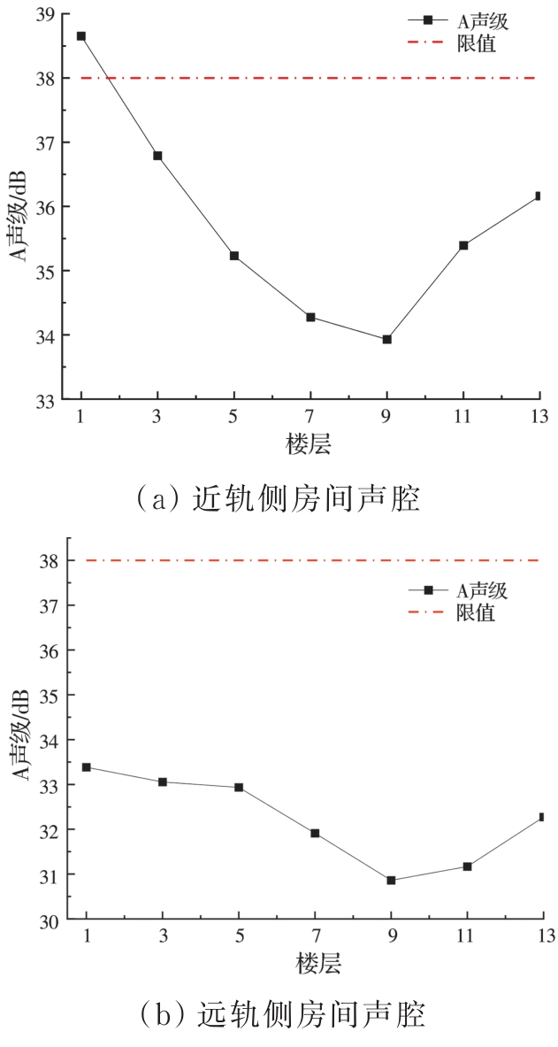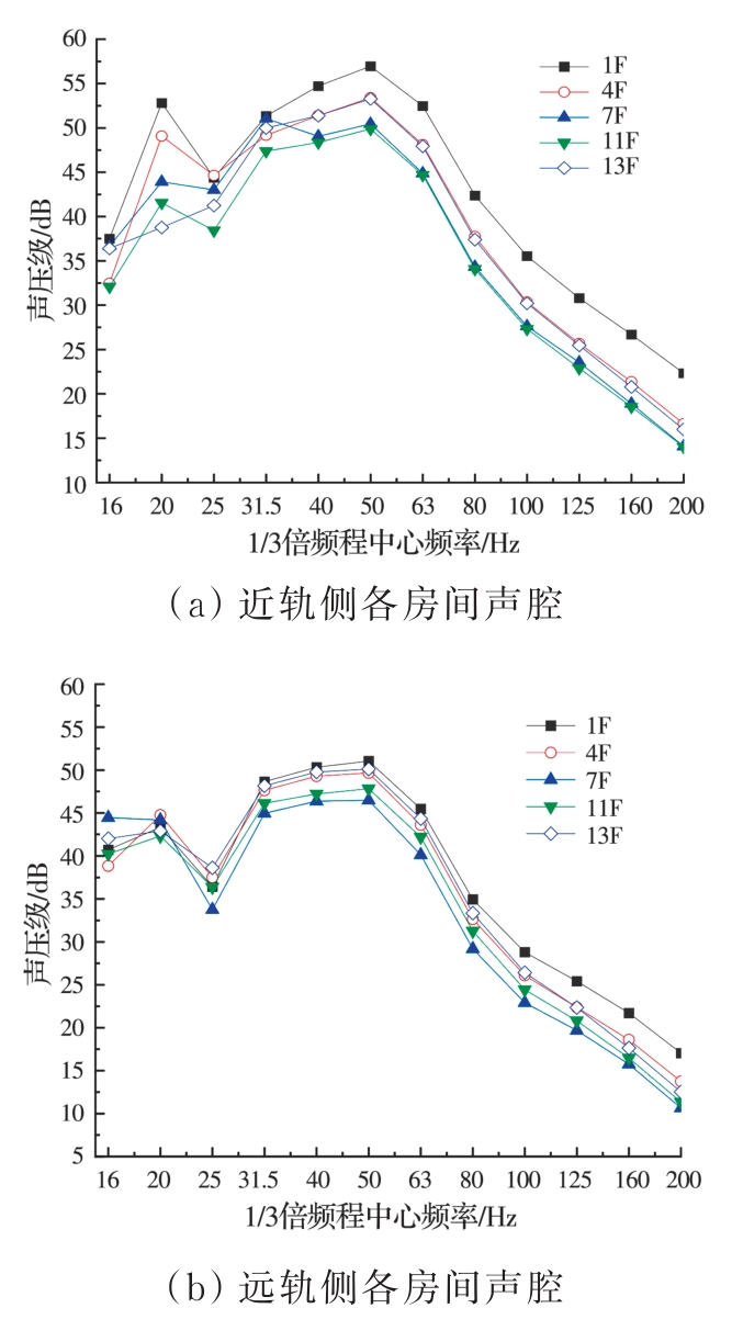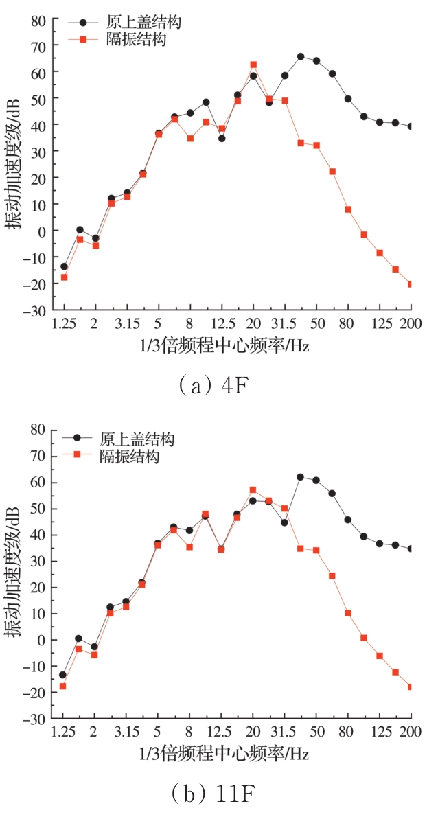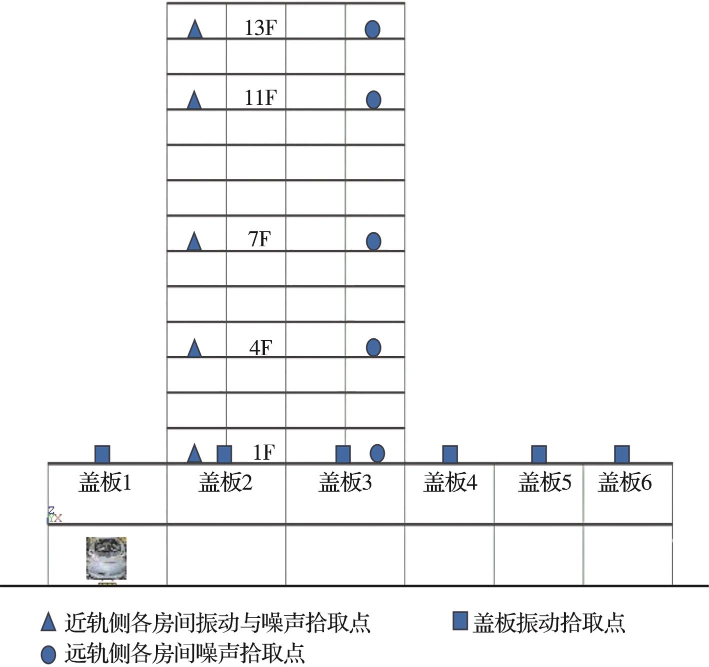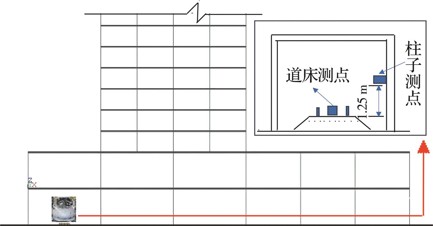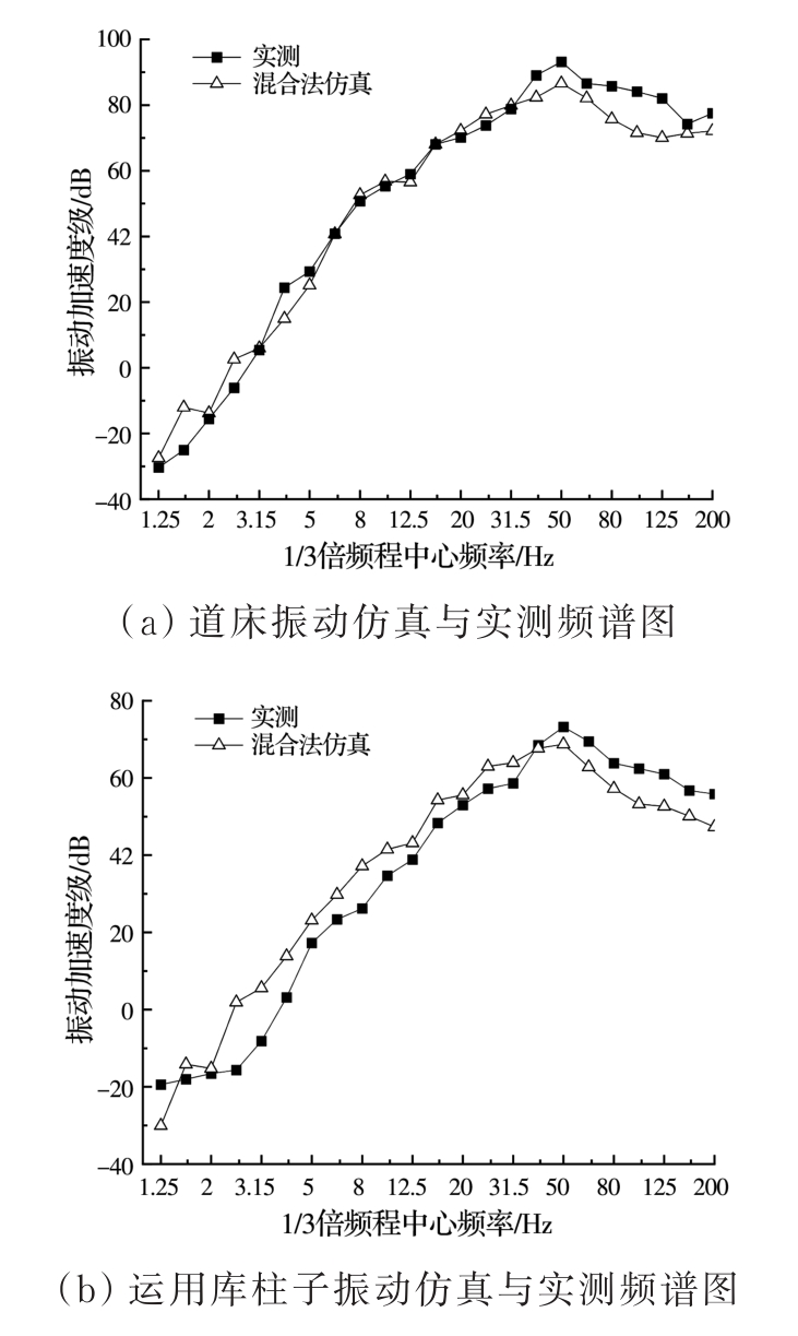 摘要:为分析地铁车辆段运行对上盖建筑振动与室内二次结构噪声的影响,基于FE-SEA混合法,以某地铁车辆段上盖建筑为依托,建立轨道-盖板-上盖建筑耦合模型,开展地铁振动作用下不同频域范围内上盖建筑振动与室内二次结构噪声分析,揭示上盖建筑振动产生机理,探究上盖建筑振动与噪声传播规律。结果表明:采用FE-SEA混合法分析预测上盖建筑振动及室内结构噪声准确性较高;受固有频率影响,上盖建筑各楼板主频振动位于31.5~50 Hz的低频段内;车致上盖建筑振动Z振级在第9层衰减至最低水平,随着楼层的增加,振动出现放大现象;各典型房间二次结构噪声声压主要集中于20~80 Hz范围内,随着楼层的增加,不同典型房间的A声级均出现先减小后增大的现象;施加隔振支座可以起到较好的减振效果,能有效降低结构的自振频率,并降低上盖结构对高于这一频率的振动响应。