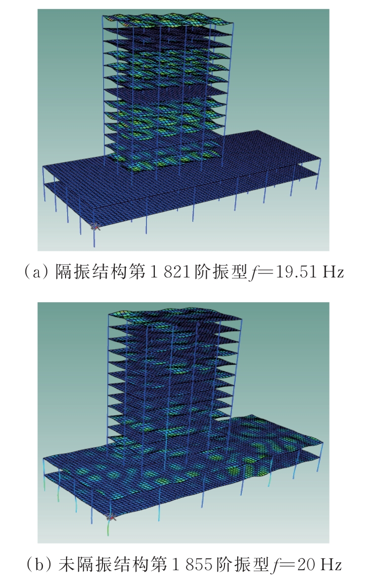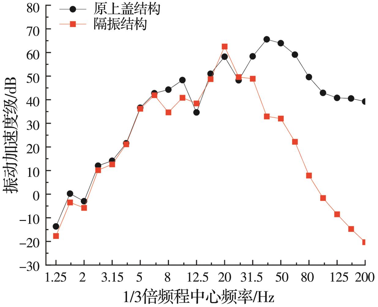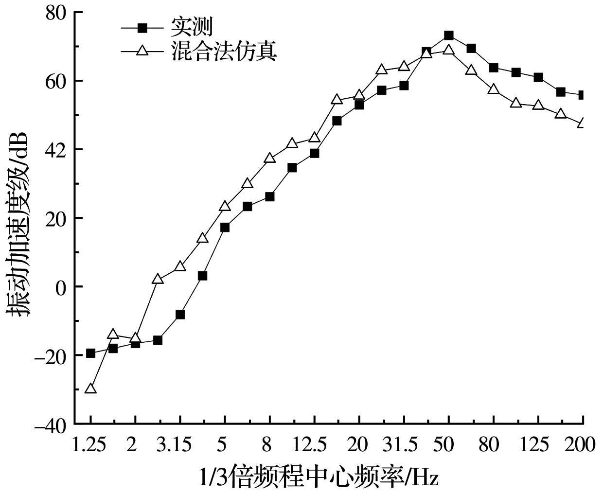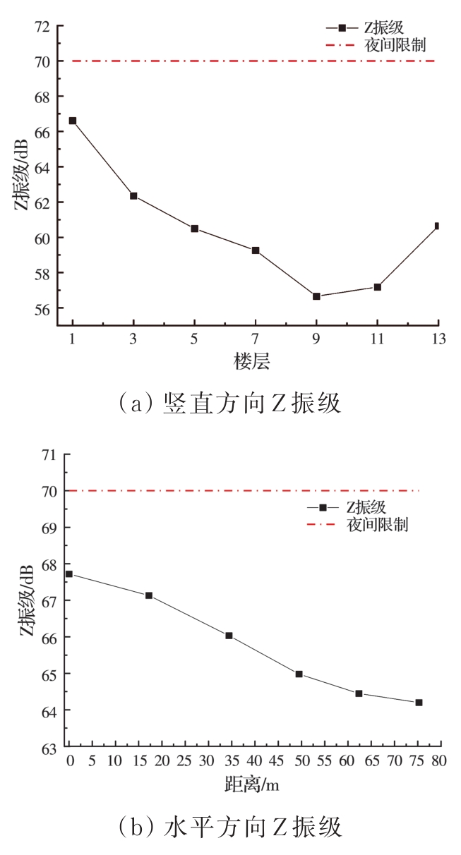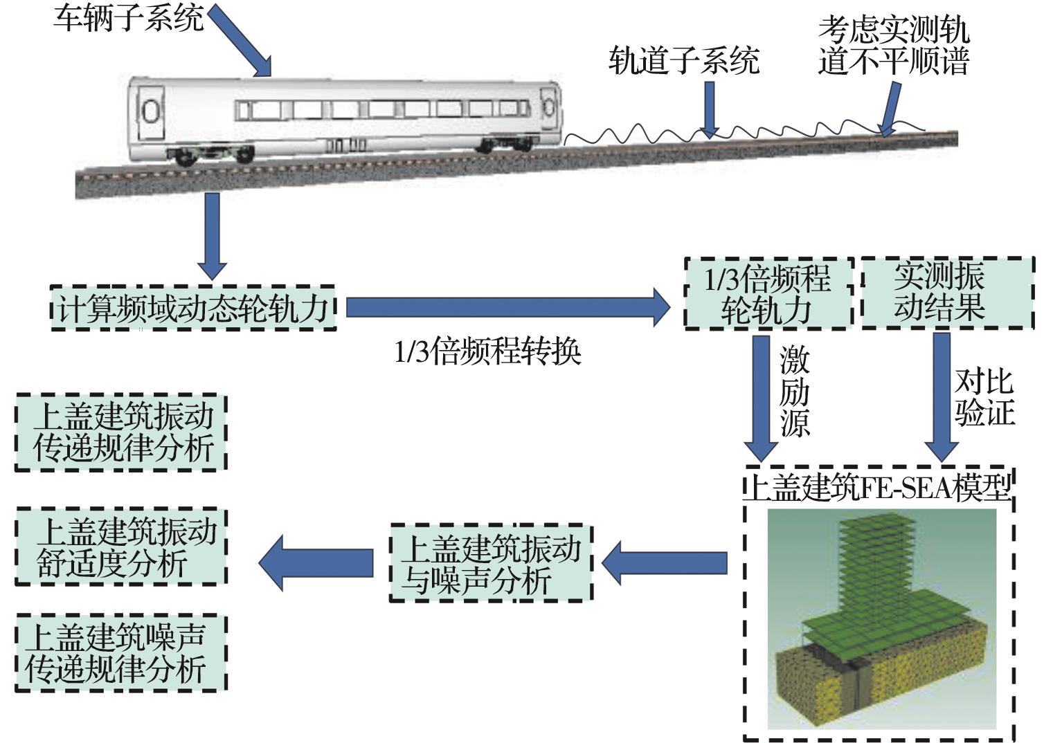摘要:为分析地铁车辆段运行对上盖建筑振动与室内二次结构噪声的影响,基于FE-SEA混合法,以某地铁车辆段上盖建筑为依托,建立轨道-盖板-上盖建筑耦合模型,开展地铁振动作用下不同频域范围内上盖建筑振动与室内二次结构噪声分析,揭示上盖建筑振动产生机理,探究上盖建筑振动与噪声传播规律。结果表明:采用FE-SEA混合法分析预测上盖建筑振动及室内结构噪声准确性较高;受固有频率影响,上盖建筑各楼板主频振动位于31.5~50 Hz的低频段内;车致上盖建筑振动Z振级在第9层衰减至最低水平,随着楼层的增加,振动出现放大现象;各典型房间二次结构噪声声压主要集中于20~80 Hz范围内,随着楼层的增加,不同典型房间的A声级均出现先减小后增大的现象;施加隔振支座可以起到较好的减振效果,能有效降低结构的自振频率,并降低上盖结构对高于这一频率的振动响应。