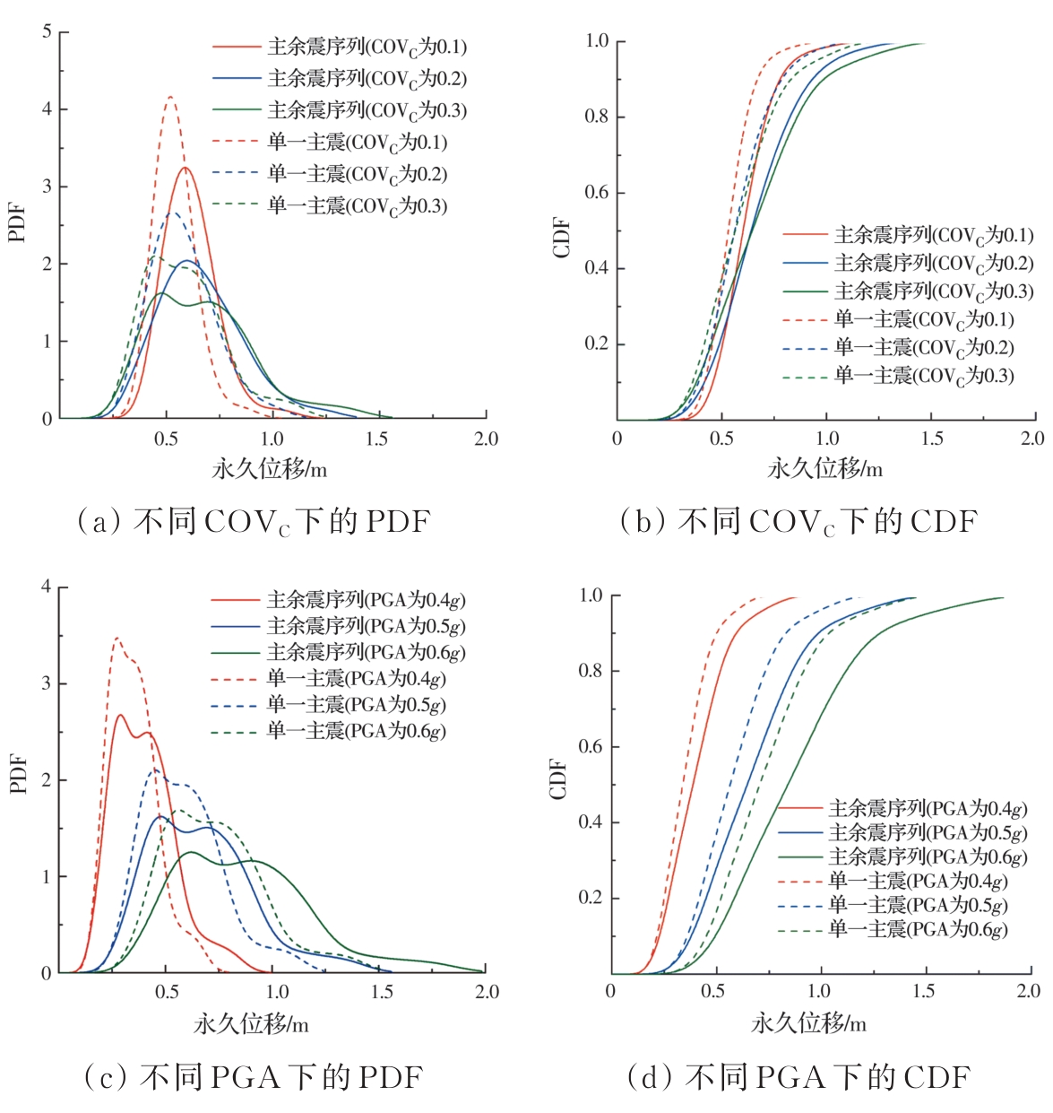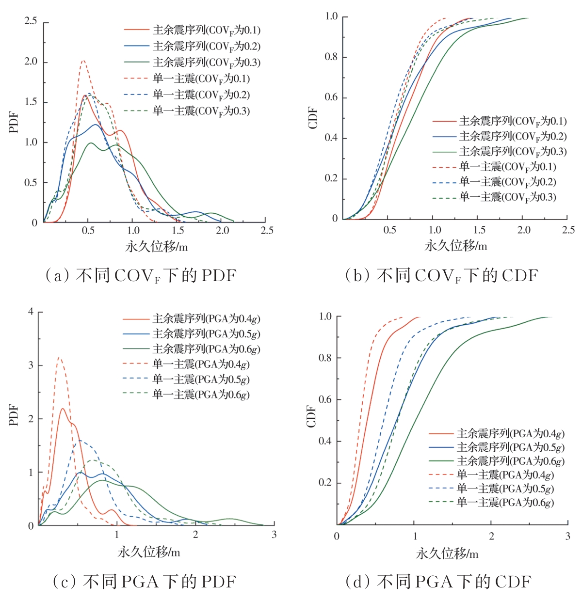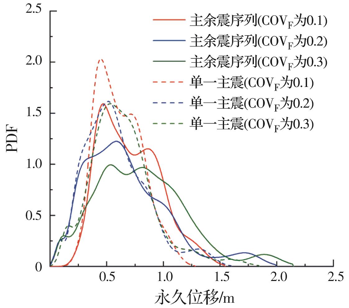 摘要:边坡在地震作用下的动力响应研究目前主要关注单一主震作用,而没有考虑余震的影响,且材料参数的空间变异性往往被忽略。考虑土体强度参数的空间变异性,提出一种基于Newmark方法和概率密度演化方法(PDEM)的可靠度分析框架来量化余震及空间变异性对边坡动力可靠度的影响。首先,将物理随机函数模型、Copula函数和窄带谐波群叠加方法相结合,生成主余震序列。此外,基于谱表示法生成随机场,并根据对应坐标将参数赋值到有限元模型中。然后,采用Newmark位移法批量计算主余震序列作用下考虑材料参数空间变异性的边坡永久位移,并通过位移均值分析黏聚力和摩擦角的变异系数(COVC和COVF)、余震和峰值加速度(PGA)对边坡永久位移的影响。最后,基于PDEM,从概率的角度解释变异系数(COV)和余震对边坡动力可靠度的影响。结果表明:随着COV的增大,边坡的永久位移均值呈逐渐增大趋势,相比之下,COVF对边坡的永久位移影响更明显;与单一主震相比,地震序列作用下边坡的位移均值更大;若忽略材料参数的空间变异性和余震的影响,将明显高估边坡的抗震性能。