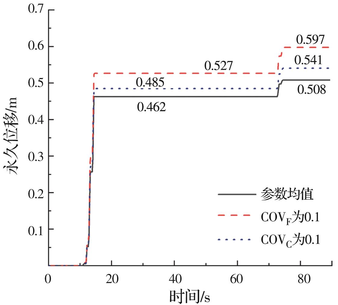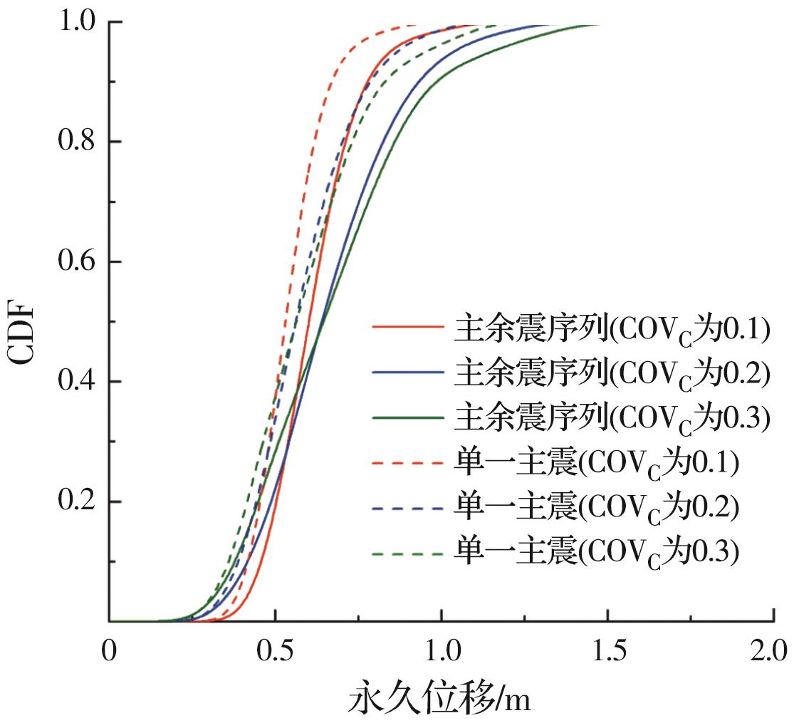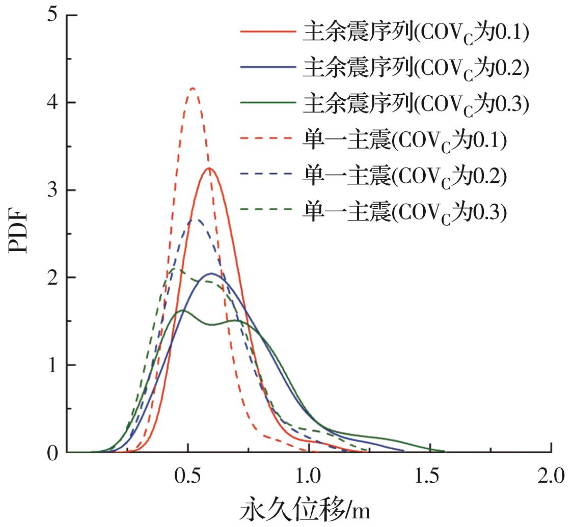 摘要:边坡在地震作用下的动力响应研究目前主要关注单一主震作用,而没有考虑余震的影响,且材料参数的空间变异性往往被忽略。考虑土体强度参数的空间变异性,提出一种基于Newmark方法和概率密度演化方法(PDEM)的可靠度分析框架来量化余震及空间变异性对边坡动力可靠度的影响。首先,将物理随机函数模型、Copula函数和窄带谐波群叠加方法相结合,生成主余震序列。此外,基于谱表示法生成随机场,并根据对应坐标将参数赋值到有限元模型中。然后,采用Newmark位移法批量计算主余震序列作用下考虑材料参数空间变异性的边坡永久位移,并通过位移均值分析黏聚力和摩擦角的变异系数(COVC和COVF)、余震和峰值加速度(PGA)对边坡永久位移的影响。最后,基于PDEM,从概率的角度解释变异系数(COV)和余震对边坡动力可靠度的影响。结果表明:随着COV的增大,边坡的永久位移均值呈逐渐增大趋势,相比之下,COVF对边坡的永久位移影响更明显;与单一主震相比,地震序列作用下边坡的位移均值更大;若忽略材料参数的空间变异性和余震的影响,将明显高估边坡的抗震性能。