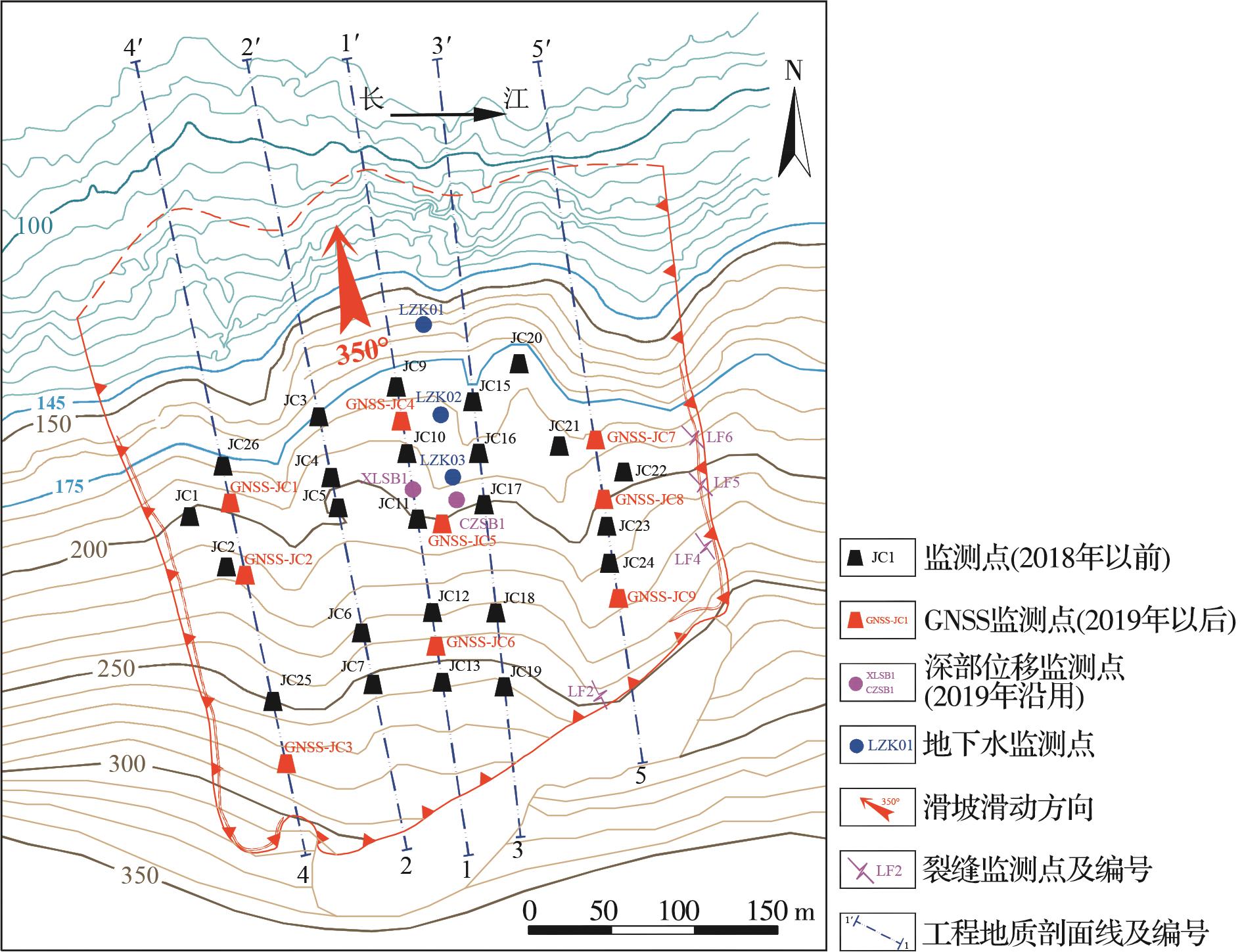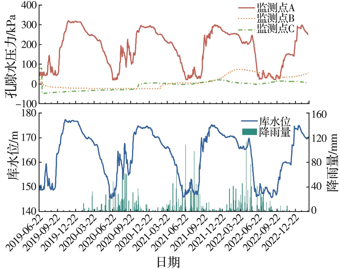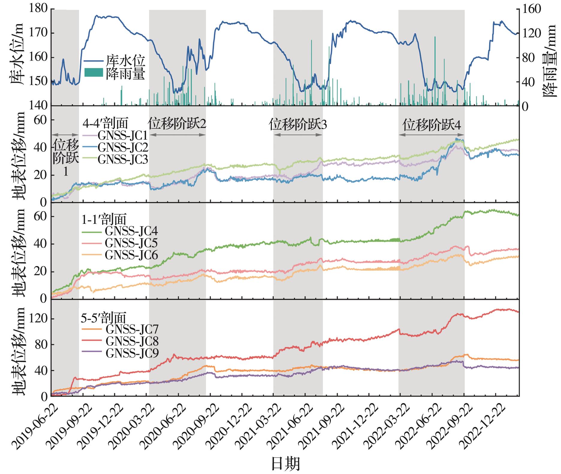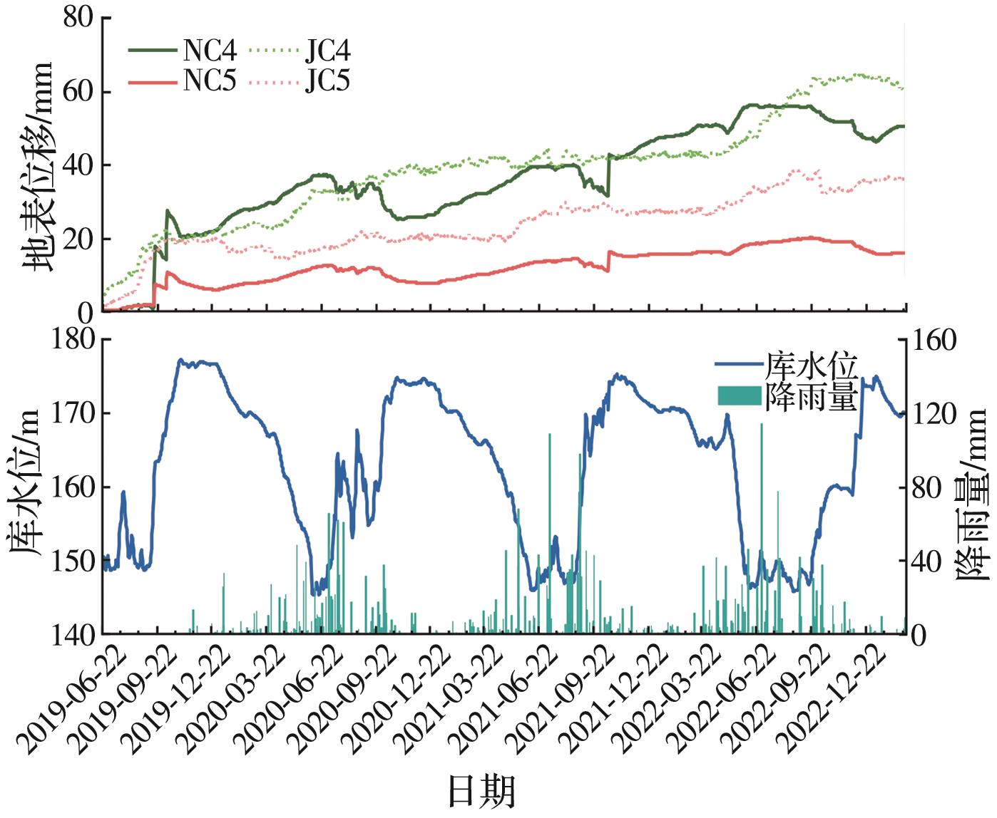 摘要:库水位变化和降雨是影响三峡库区滑坡失稳破坏的主要因素,凉水井滑坡受库区试验性蓄水影响变形后发布预警,目前滑坡活动趋于稳定但变形机制仍不明确。结合凉水井滑坡近年来的监测数据,在考虑滑坡位移阶跃演进变化的基础上,利用多年库水位变化和降雨数据,建立滑坡的水力计算模型,研究库水位变动和降雨共同作用下滑坡的渗流场、稳定性和位移变化规律,探讨凉水井滑坡的内在变形机制。结果表明:滑坡前部和后部的渗流场分别主要受库水位和降雨影响,中部则受到两者的联合作用;滑坡稳定性系数随库水位涨落而呈周期性变化,降雨进一步降低了滑坡的整体稳定性;滑坡地表位移呈阶跃式上升趋势,库水位下降引起位移跃迁增长,库水位上升使位移变化趋于稳定。总体上,在库水位变动和降雨共同作用下,地下渗流场发生变化,引起水力条件改变,导致滑坡产生变形,目前滑坡变形主要集中在坡脚处,变形范围逐渐向后延伸,滑坡中后部变形稳定;库水位变化对滑坡变形影响较明显,在库水位变化速率较大的年份,应当注意加强对滑坡变形的预警监测。