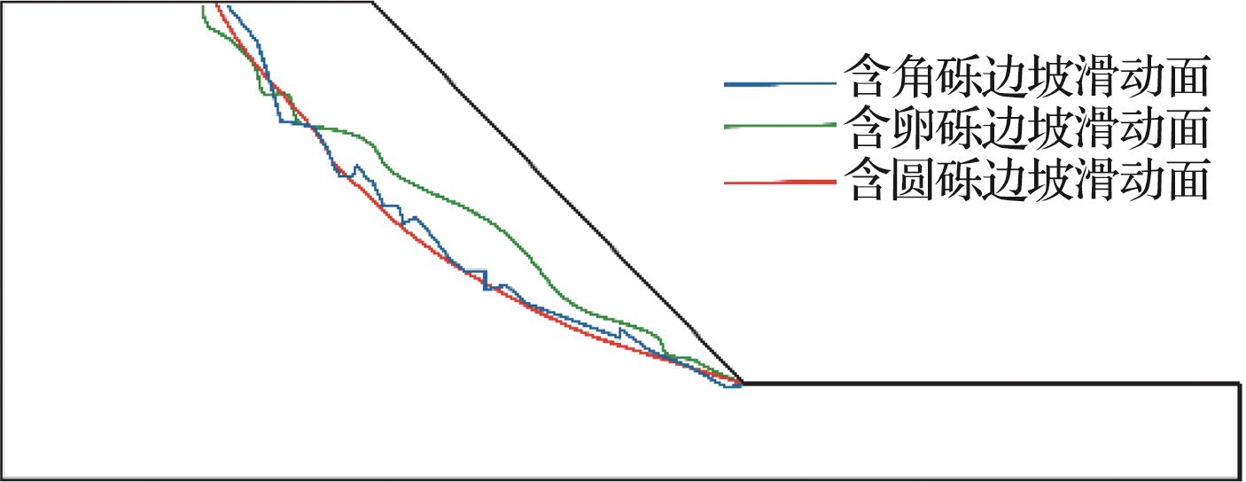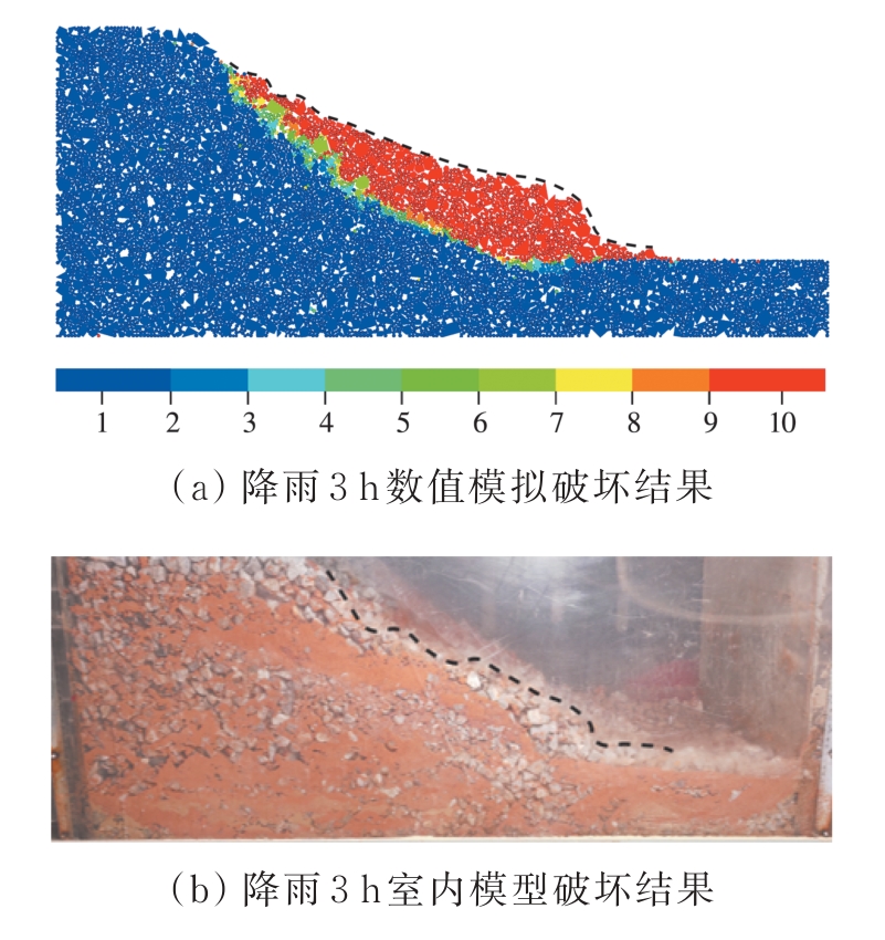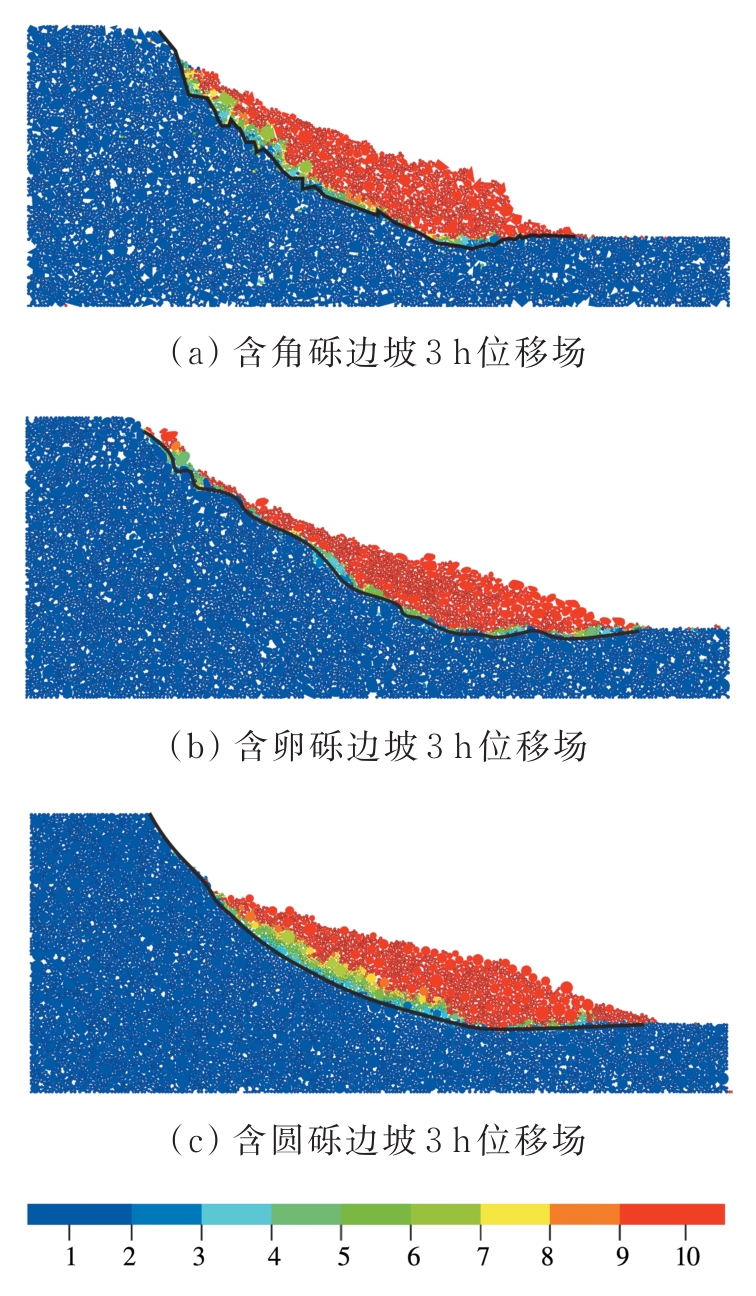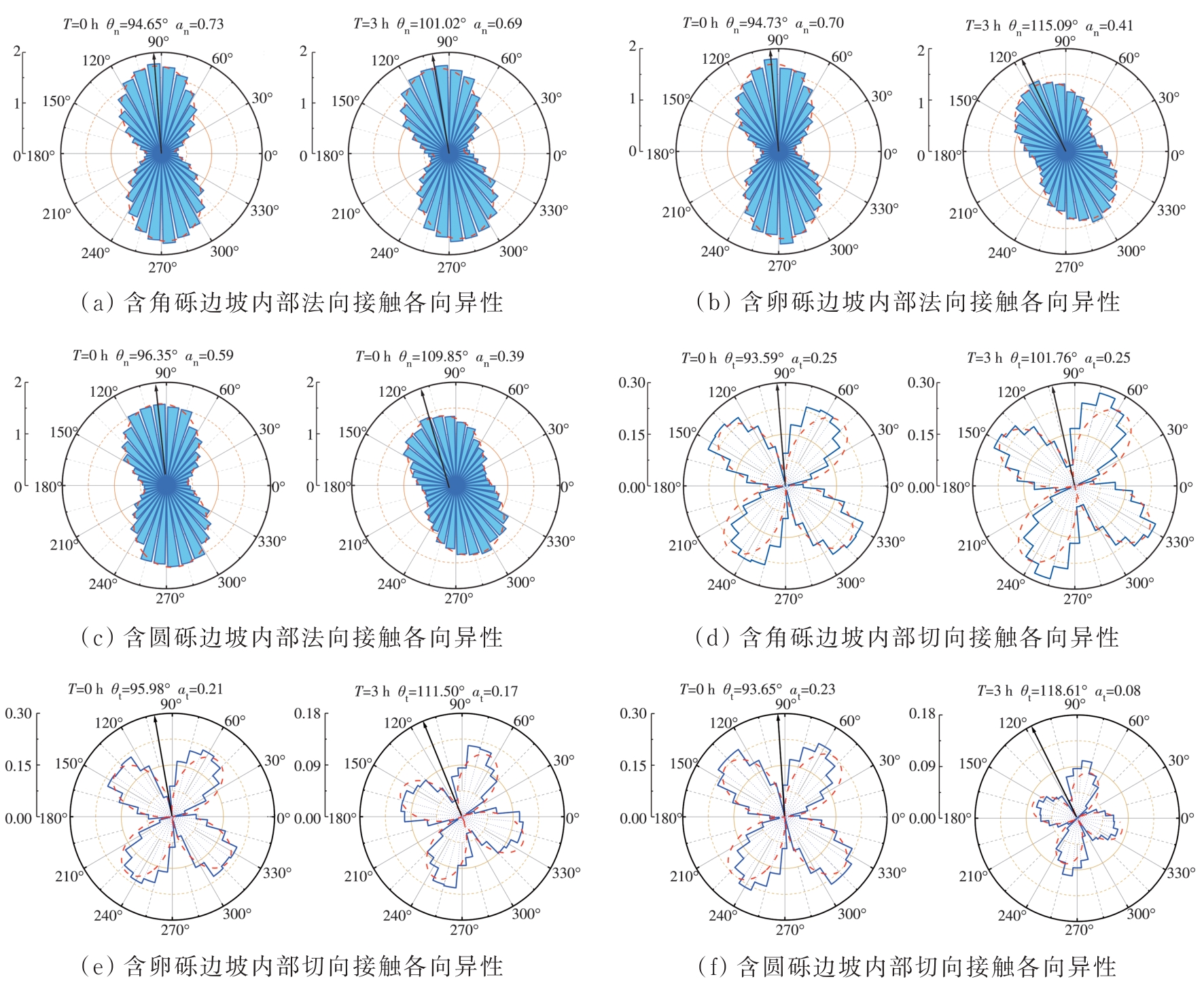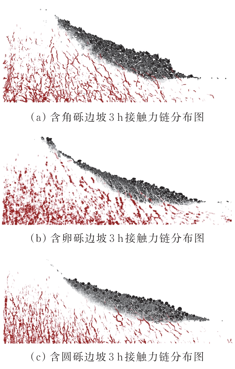 摘要:为了研究降雨条件下砾石形状对含砾花岗岩残积土边坡稳定性及变形破坏特征的影响,通过室内降雨边坡模型试验并结合CFD-DEM数值模拟,对比分析边坡的宏观竖向位移和变形破坏及湿润锋变化,考虑圆砾、卵砾、角砾3种砾石形状,分析位移场与滑动面的发展规律以及细观接触力链、配位数、组构各向异性。结果表明:含圆砾边坡安全系数最小,含角砾边坡安全系数最大;随着降雨时间从0 h增加到3 h,含圆砾、卵砾、角砾3种不同砾石形状的边坡安全系数分别下降40%、33%、32%,受降雨影响的程度从大到小依次为含圆砾、卵砾、角砾边坡;随着砾石长宽比和棱角度的增大,砾石的嵌固咬合作用逐渐增强,对应坡体依次出现圆弧形破坏、齿状弧形破坏、偏移形破坏3种破坏模式;边坡失稳破坏后,含圆砾、卵砾、角砾边坡的强接触力链在分布特征上表现为交织性、弱连续性、不均匀性;随着砾石长宽比和棱角度的增大,含圆砾、卵砾、角砾边坡内部的接触各向异性程度逐渐提高。