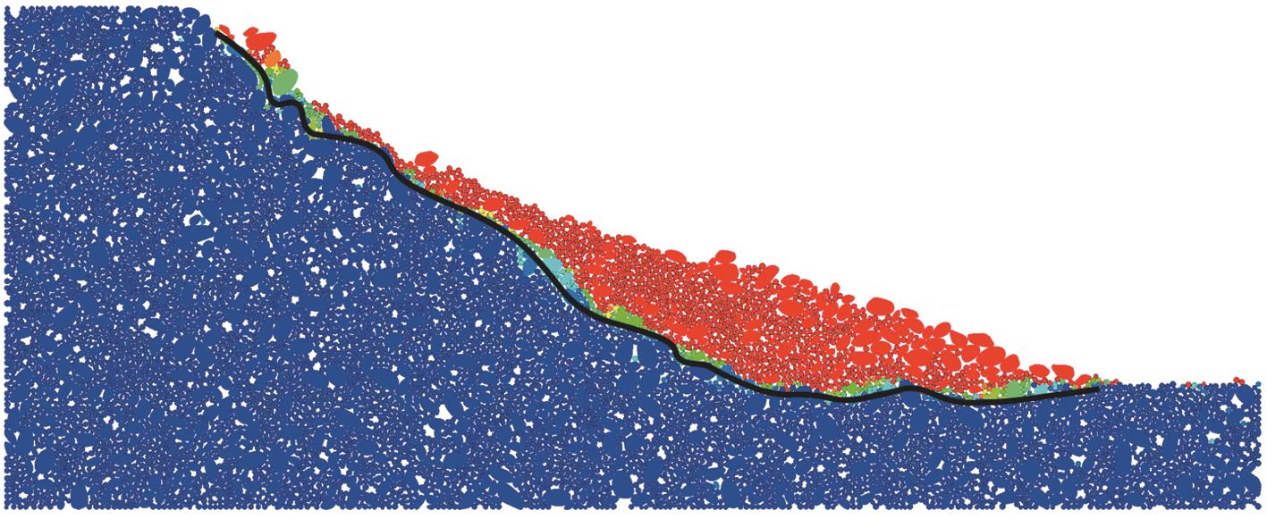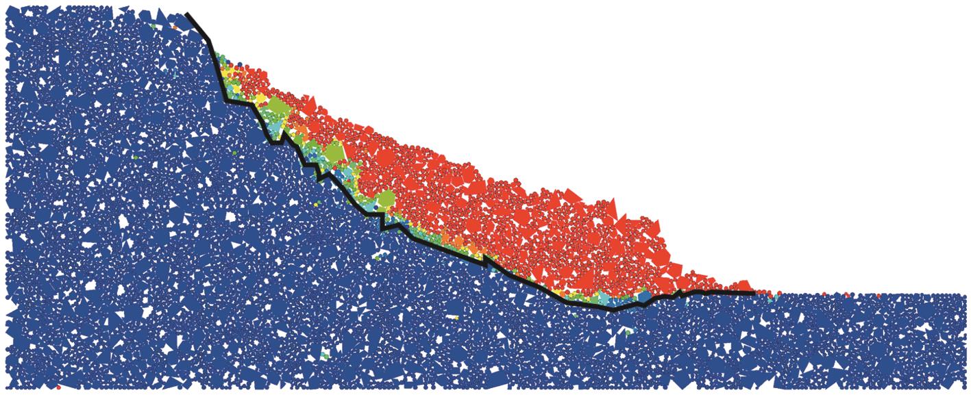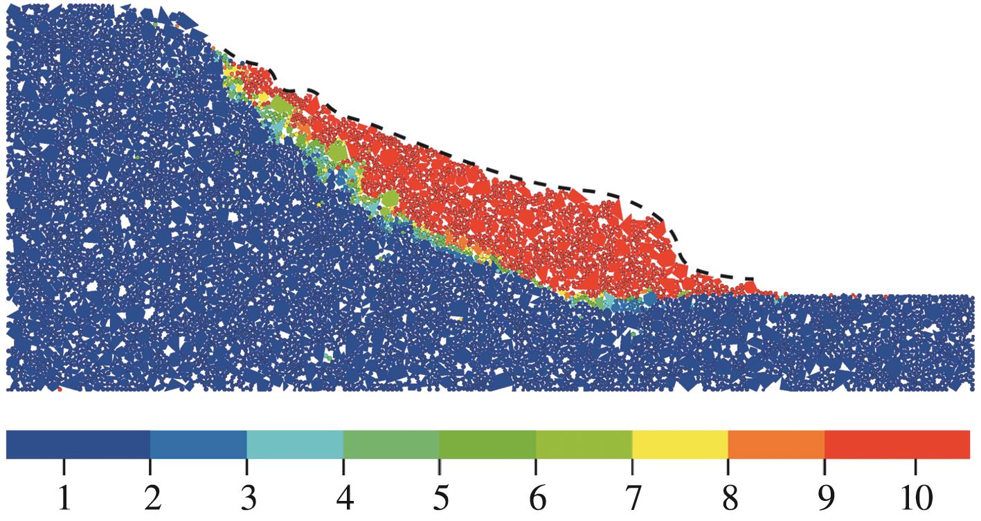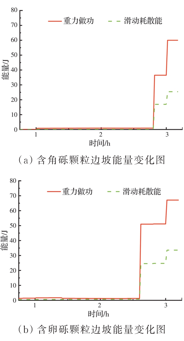 摘要:为了研究降雨条件下砾石形状对含砾花岗岩残积土边坡稳定性及变形破坏特征的影响,通过室内降雨边坡模型试验并结合CFD-DEM数值模拟,对比分析边坡的宏观竖向位移和变形破坏及湿润锋变化,考虑圆砾、卵砾、角砾3种砾石形状,分析位移场与滑动面的发展规律以及细观接触力链、配位数、组构各向异性。结果表明:含圆砾边坡安全系数最小,含角砾边坡安全系数最大;随着降雨时间从0 h增加到3 h,含圆砾、卵砾、角砾3种不同砾石形状的边坡安全系数分别下降40%、33%、32%,受降雨影响的程度从大到小依次为含圆砾、卵砾、角砾边坡;随着砾石长宽比和棱角度的增大,砾石的嵌固咬合作用逐渐增强,对应坡体依次出现圆弧形破坏、齿状弧形破坏、偏移形破坏3种破坏模式;边坡失稳破坏后,含圆砾、卵砾、角砾边坡的强接触力链在分布特征上表现为交织性、弱连续性、不均匀性;随着砾石长宽比和棱角度的增大,含圆砾、卵砾、角砾边坡内部的接触各向异性程度逐渐提高。