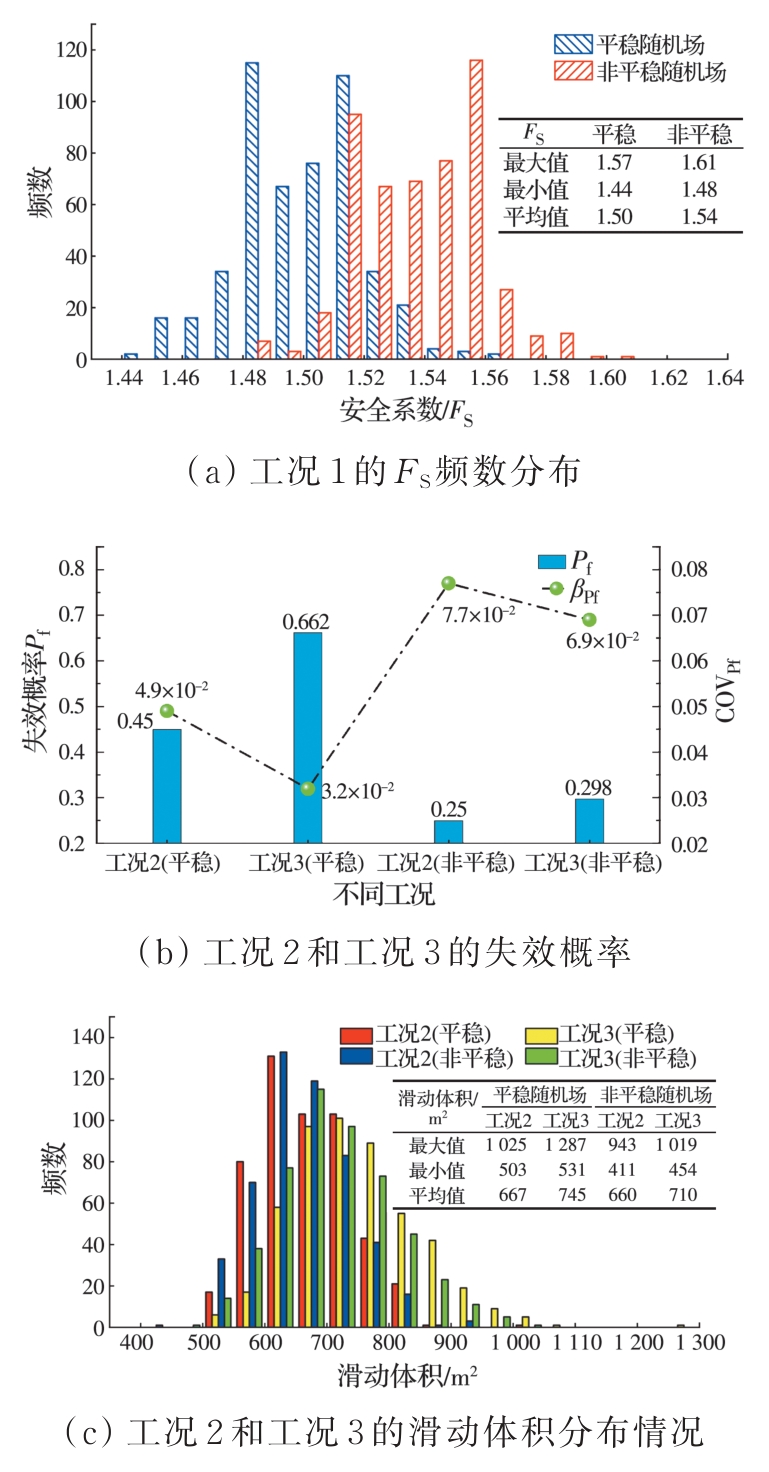 摘要:库水位变化和降雨联合作用下的边坡稳定分析通常采用确定性分析方法,然而岩土体参数具有天然的空间变异性,确定性分析方法无法准确评估边坡的稳定性。以白鹤滩库区黑水河岸坡为例,基于实测降雨和库水位数据,分析了1 a周期内库水位变化和降雨联合作用下的边坡稳定性。通过确定性分析确定3种最不利工况。在此基础上,进一步考虑有效黏聚力c′、有效内摩擦角φ′、饱和渗透系数ks的空间变异性,利用随机有限差分法(RFDM)对比平稳随机场和非平稳随机场对边坡可靠度分析结果的影响规律。结果表明,相较于降雨入渗,库水位涨落对边坡稳定性起关键性作用,最小安全系数出现在库水位快速下降期,且降雨和库水位的联合作用显著增大了边坡的失效概率和滑动体积。此外,在对边坡稳定性开展随机分析时,应当考虑岩土体参数随深度变化的特性,否则将低估边坡的稳定性。