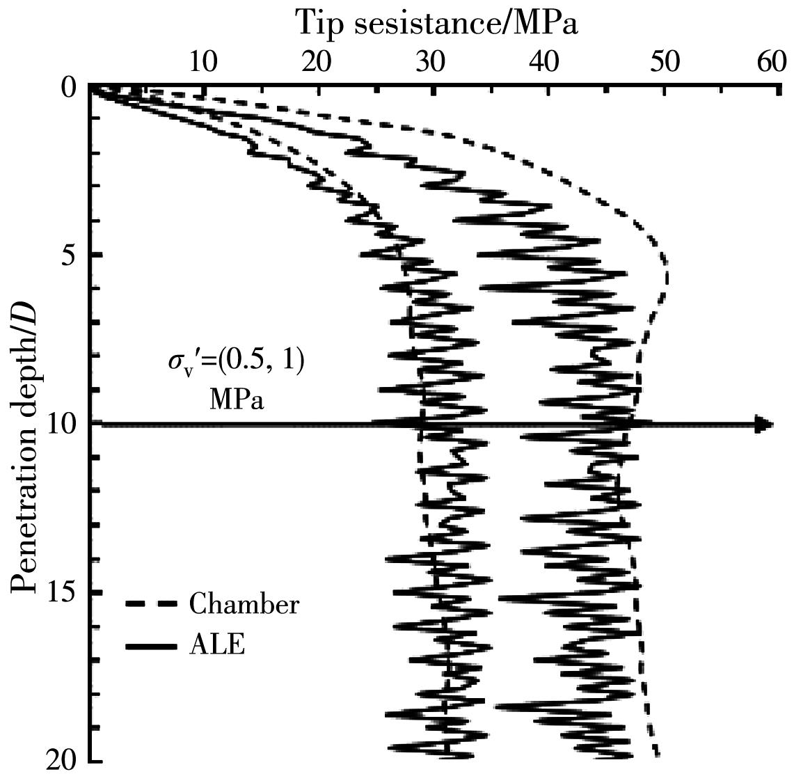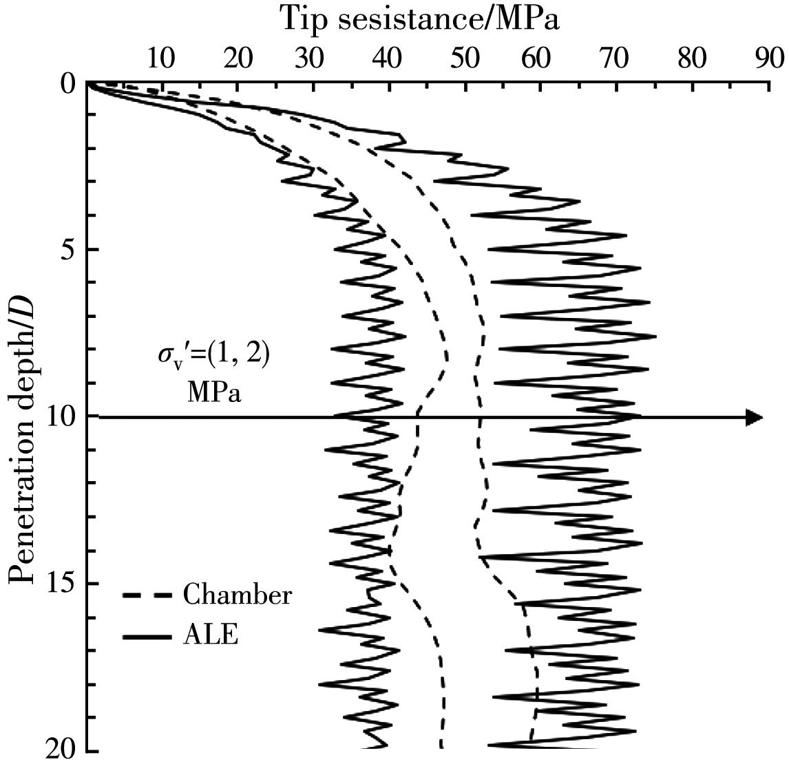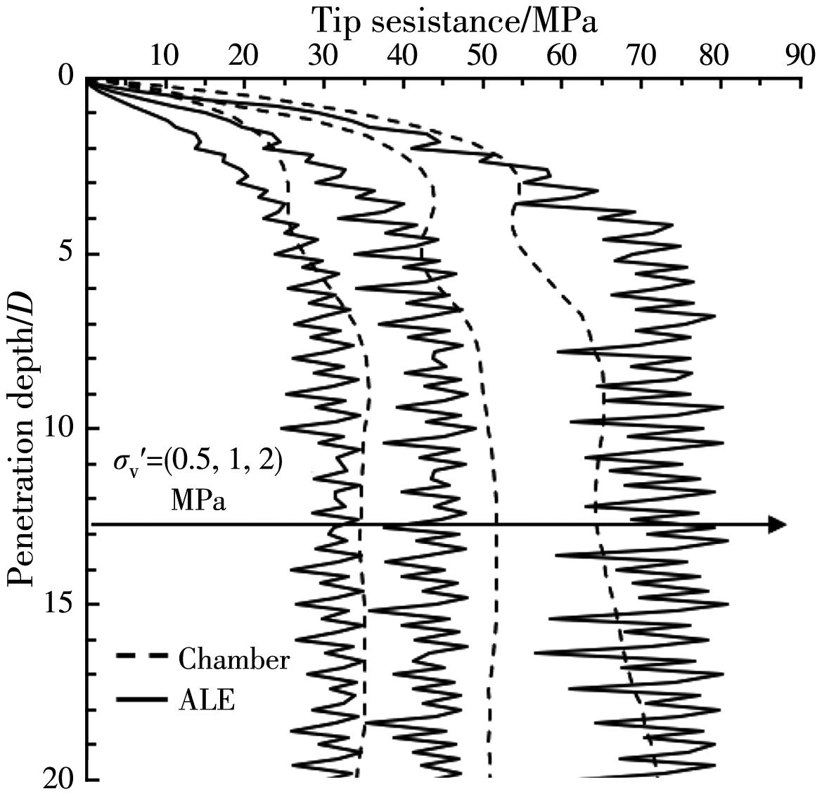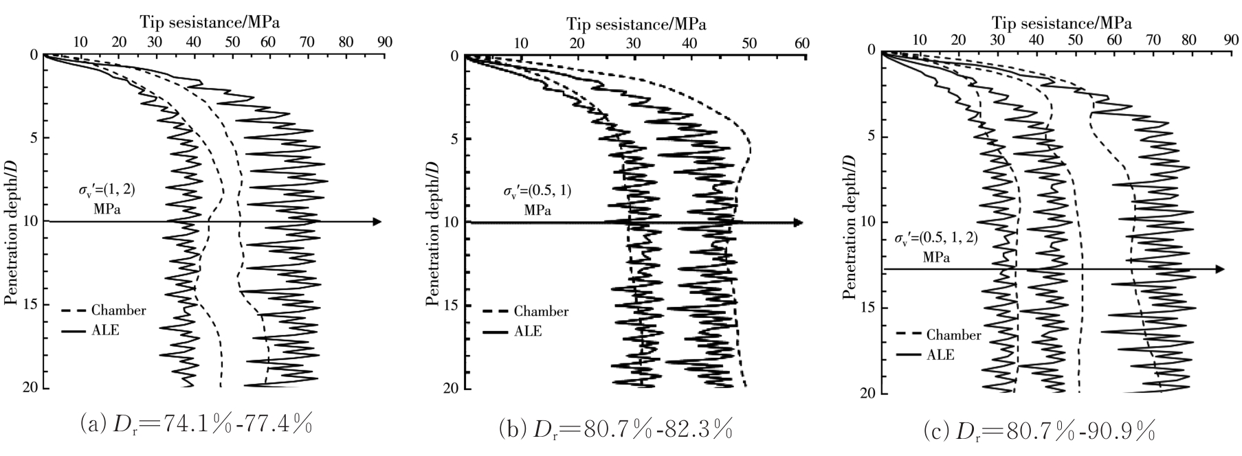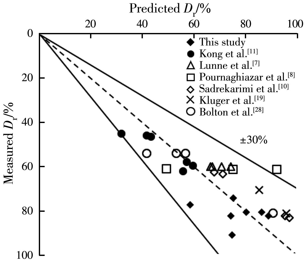 摘要:高应力水平下深部密实石英砂层中的静力触探原位试验或模型试验数据极少,难以建立静力触探试验结果与深部密实砂层工程性质间的相关性。进行高压标定罐试验,以砂雨法制备相对密实度为74%~91%的密实砂样,在0.5~2.0 MPa的高应力水平下开展标定罐中的静力触探试验。采用修正摩尔库伦本构模型描述高应力水平下密实石英砂的应力-应变响应,并纳入任意拉格朗日-欧拉大变形有限元方法,对静力触探试验进行数值模拟。这种大变形方法能有效避免锥尖周围土体网格的严重扭曲,保证计算收敛。数值模拟与标定罐试验结果基本吻合,证明了大变形分析的可靠性。总结试验和数值数据发现,锥尖贯入阻力是砂土相对密实度和所处应力水平的函数,且仍可采用低应力水平下函数表达的基本形式。进行充分数量的变动参数分析,拟合得到高应力水平下密实石英砂相对密实度预测公式中的参数,将公式预测结果与标定罐试验结果对比,发现预测效果较好,相对误差小于30%。