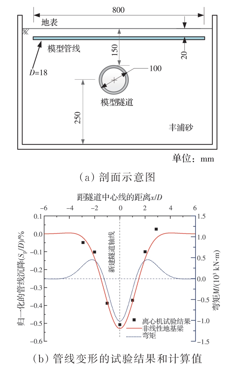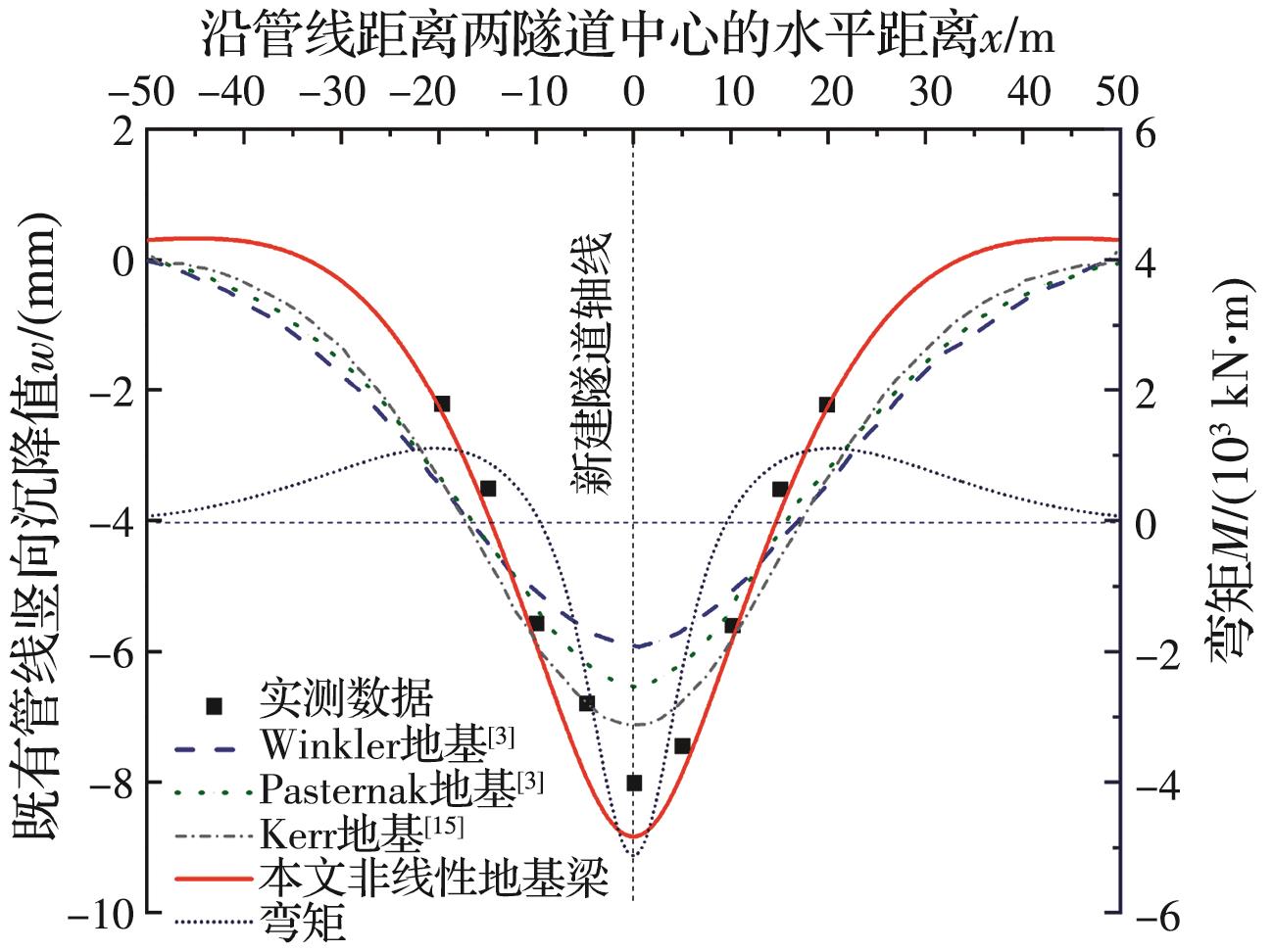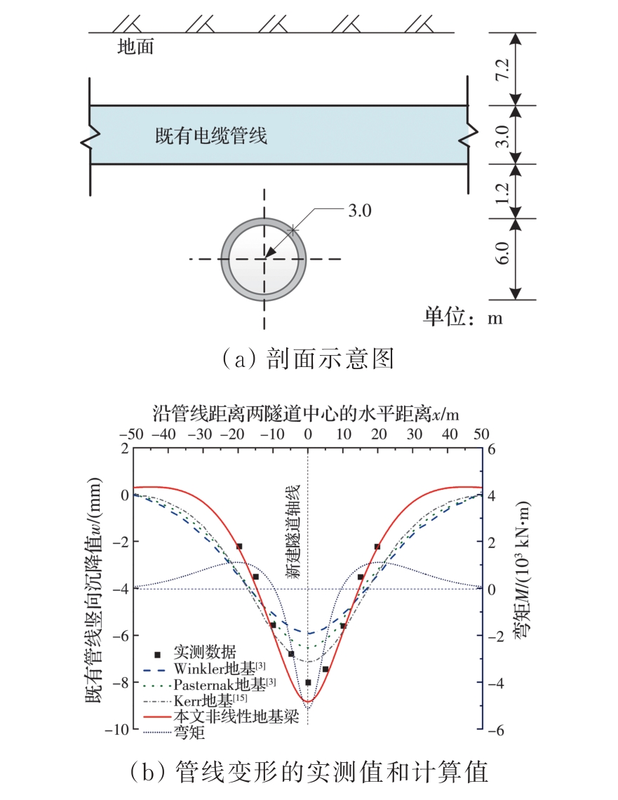 摘要:城市地铁修建过程中不可避免下穿既有市政管线,威胁管线安全。现有管线变形的预测理论多采用Winkler和Pasternak等弹性地基模型,无法考虑土体非线性变形特性。提出将既有刚性接头的市政管线视为非线性地基上的连续梁模型,进而建立管线非线性变形预测方法。首先,通过Peck经验公式和考虑先建隧道影响的修正Peck公式,分别计算单线和双线隧道下穿引起管线轴线处的地层位移;然后,建立管线变形的微分控制方程,通过有限差分法和牛顿迭代法得到管线的数值解;最后,通过与已有离心机试验和两个工程案例的监测结果对比,验证所提方法的合理性和适用性。结果表明:与常用弹性地基模型相比,所提方法计算结果与实测结果趋势更为接近;考虑平行双线隧道先后施工的影响后,该方法可以较好地预测双线隧道下穿引起的管线变形。