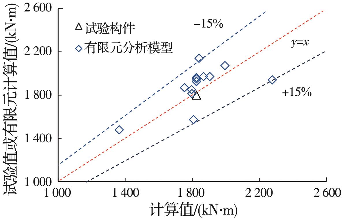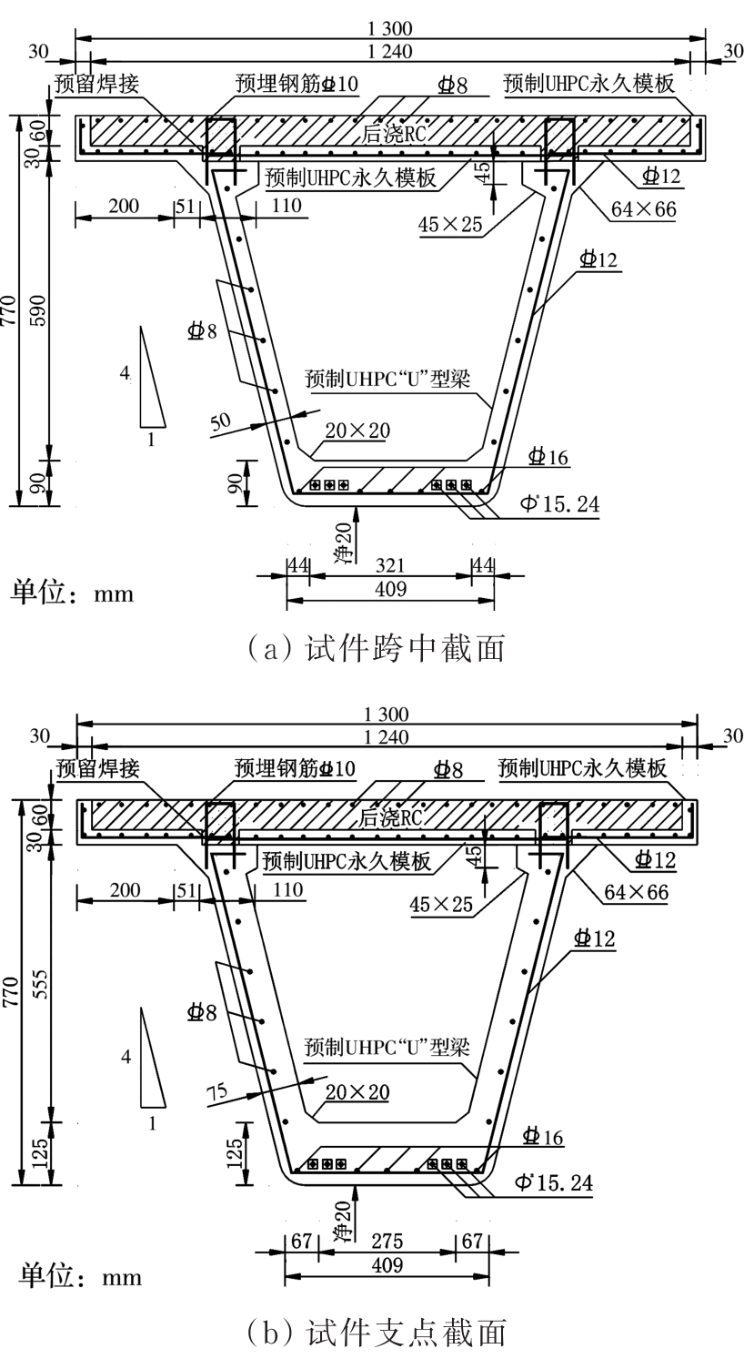 摘要:为探索吊装重量轻、施工便捷、耐久性强的新型组合箱梁,设计制作了以超高性能混凝土(UHPC)为腹板和底板、以普通混凝土(RC)为顶板的新型预应力RC-UHPC组合箱梁。开展受弯试验,探究试件的损伤机理和破坏模式;采用有限元软件对试验进行模拟,通过将有限元计算结果与试验数据进行对比,验证有限元方法的计算精度;在此基础上建立16个有限元分析模型,分析不同参数对抗弯承载力的影响。结果表明:试件破坏模式为适筋破坏,表现为受拉纵筋屈服及部分预应力筋断裂后纯弯段RC顶板被压碎;UHPC抗拉强度、预应力筋配筋率对抗弯承载力影响较大;试件腹板纵向应变在高度方向上基本符合平截面假定。结合理论分析,提出抗弯承载力计算公式,利用提出的公式对试验构件及有限元分析模型的抗弯承载力进行计算,公式计算值与试验值、有限元计算值之比分别为1.014、0.960,具有较高的计算精度。