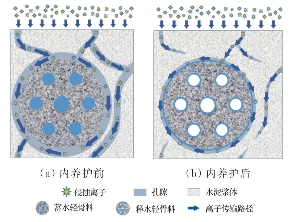 摘要:混凝土具有优良的力学性能和耐久性能,但常规养护方法难以解决其早龄期自收缩和开裂问题。内养护技术能有效改善混凝土内部湿度场,缓解其收缩开裂现象,提高耐久性。分析混凝土内养护机理、内养护作用对混凝土耐久性的影响发现:将预湿轻骨料或超强吸水聚合物掺入混凝土中能在骨料周围湿度降低时释放水分,填充混凝土内部的非饱和孔隙,增加孔隙溶液的弯月面半径,从而达到内养护的目的;内养护作用不仅能促进骨料周围水泥水化,提高骨料-浆体界面过渡区的密实度,还能缓解混凝土因自干燥产生的裂缝,提高其抗裂性能;同时,该作用能阻断侵蚀介质的传输路径,改善混凝土的渗透性,提升其抵御离子、气体等介质侵蚀的能力;内养护材料释水后,会在混凝土内部形成大量孔隙,这些孔隙能释放孔隙溶液结冰产生的膨胀压力,从而提高混凝土的抗冻性;此外,轻骨料的孔隙为膨胀凝胶的沉积提供空间,进而减少碱-骨料反应的发生。