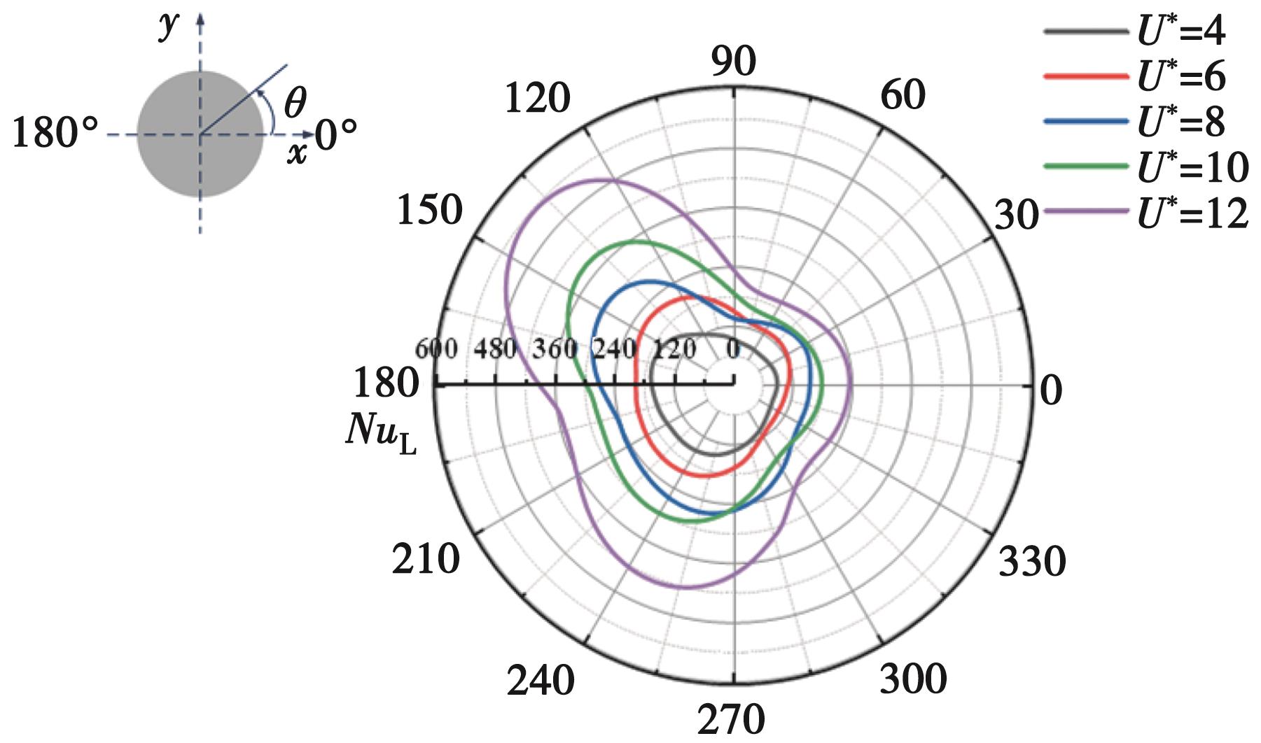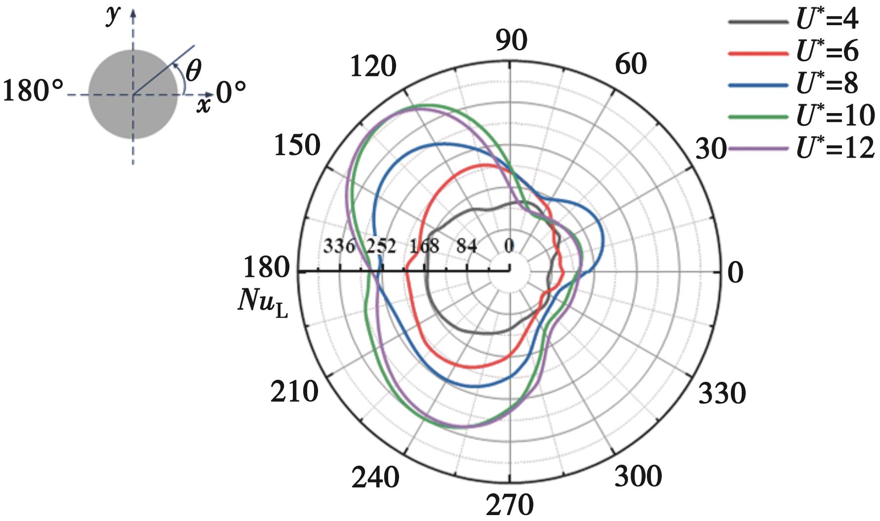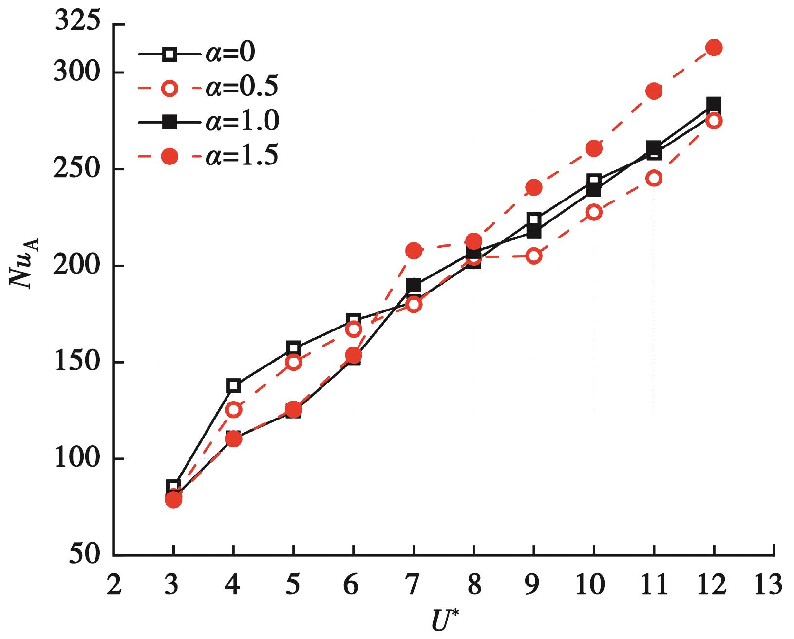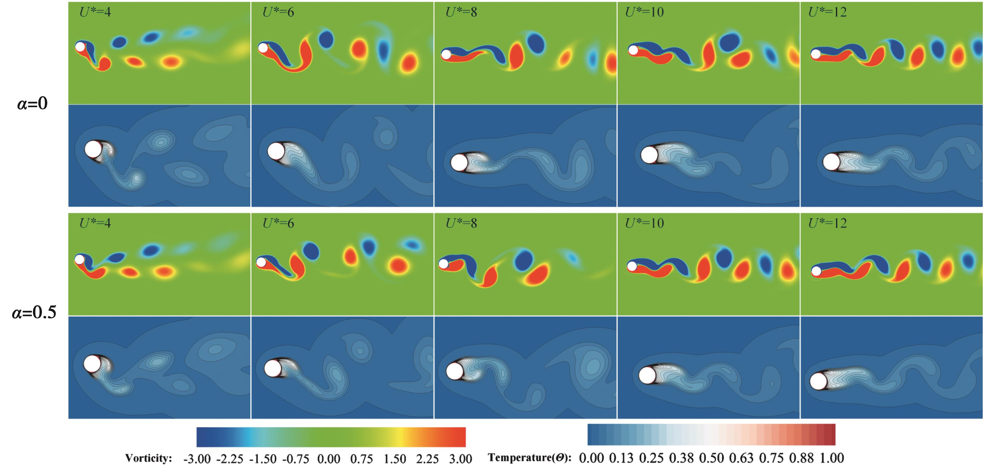 摘要:基于海洋深层流的特点,数值模拟了振荡来流条件下不同折减速度U*和旋转速率α对圆柱振动响应与传热特性的影响。结果表明,圆柱的x(A*peaks,x)和y方向(A*peaks,y)的振幅比存在多个极值点,且随着α增加,A*peaks,x的最大值增大,其对应的U*减小。位移和升阻力系数随着α和U*变化表现出显著差异,x方向的时间平均位移随U*的增加而增大,y方向平均位移和升阻力系数均随α的增大而增大。圆柱的运动轨迹在0≤α≤1.0时,无明显规律;在α=1.5 时,为圆环状。随着U*增加,圆柱平均努塞尔数增大,局部努塞尔数分布逐渐成圆形。随着α增大,涡旋脱落模式由2S转变为单排排列,尾迹逐渐拉伸并趋于U型模式。温度场结果表明,前驻点热交换较弱,后驻点热交换和局部传热效率显著提升。
