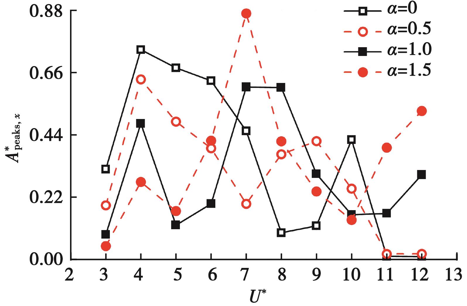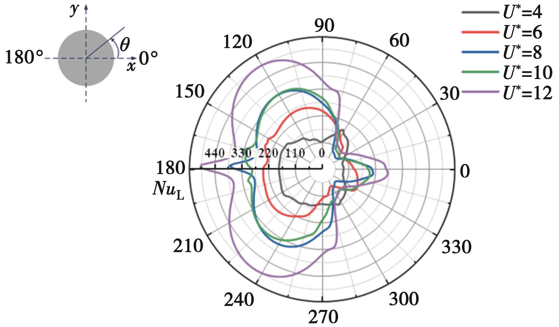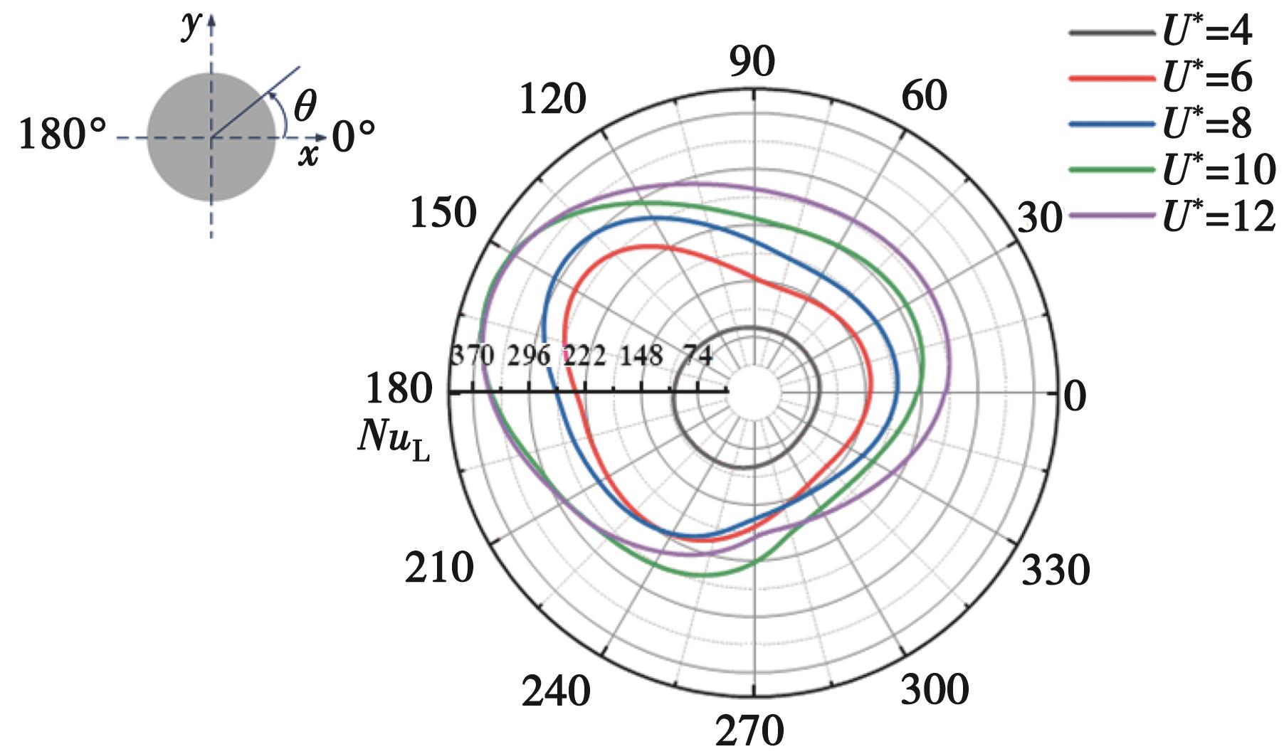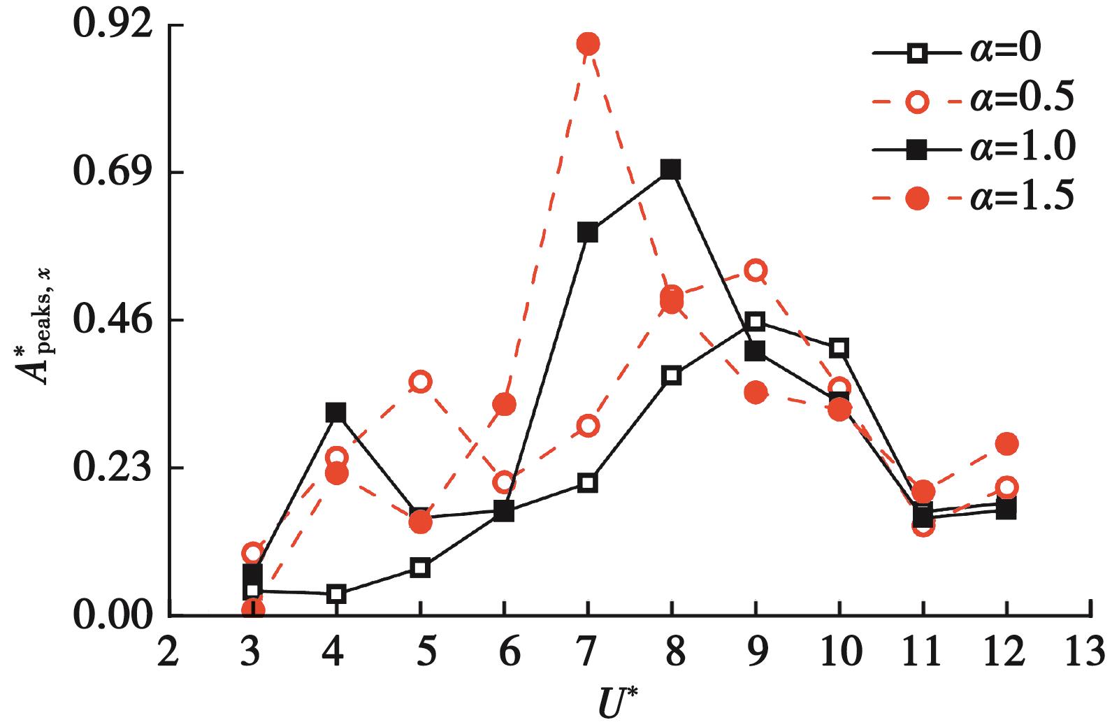 摘要:基于海洋深层流的特点,数值模拟了振荡来流条件下不同折减速度U*和旋转速率α对圆柱振动响应与传热特性的影响。结果表明,圆柱的x(A*peaks,x)和y方向(A*peaks,y)的振幅比存在多个极值点,且随着α增加,A*peaks,x的最大值增大,其对应的U*减小。位移和升阻力系数随着α和U*变化表现出显著差异,x方向的时间平均位移随U*的增加而增大,y方向平均位移和升阻力系数均随α的增大而增大。圆柱的运动轨迹在0≤α≤1.0时,无明显规律;在α=1.5 时,为圆环状。随着U*增加,圆柱平均努塞尔数增大,局部努塞尔数分布逐渐成圆形。随着α增大,涡旋脱落模式由2S转变为单排排列,尾迹逐渐拉伸并趋于U型模式。温度场结果表明,前驻点热交换较弱,后驻点热交换和局部传热效率显著提升。