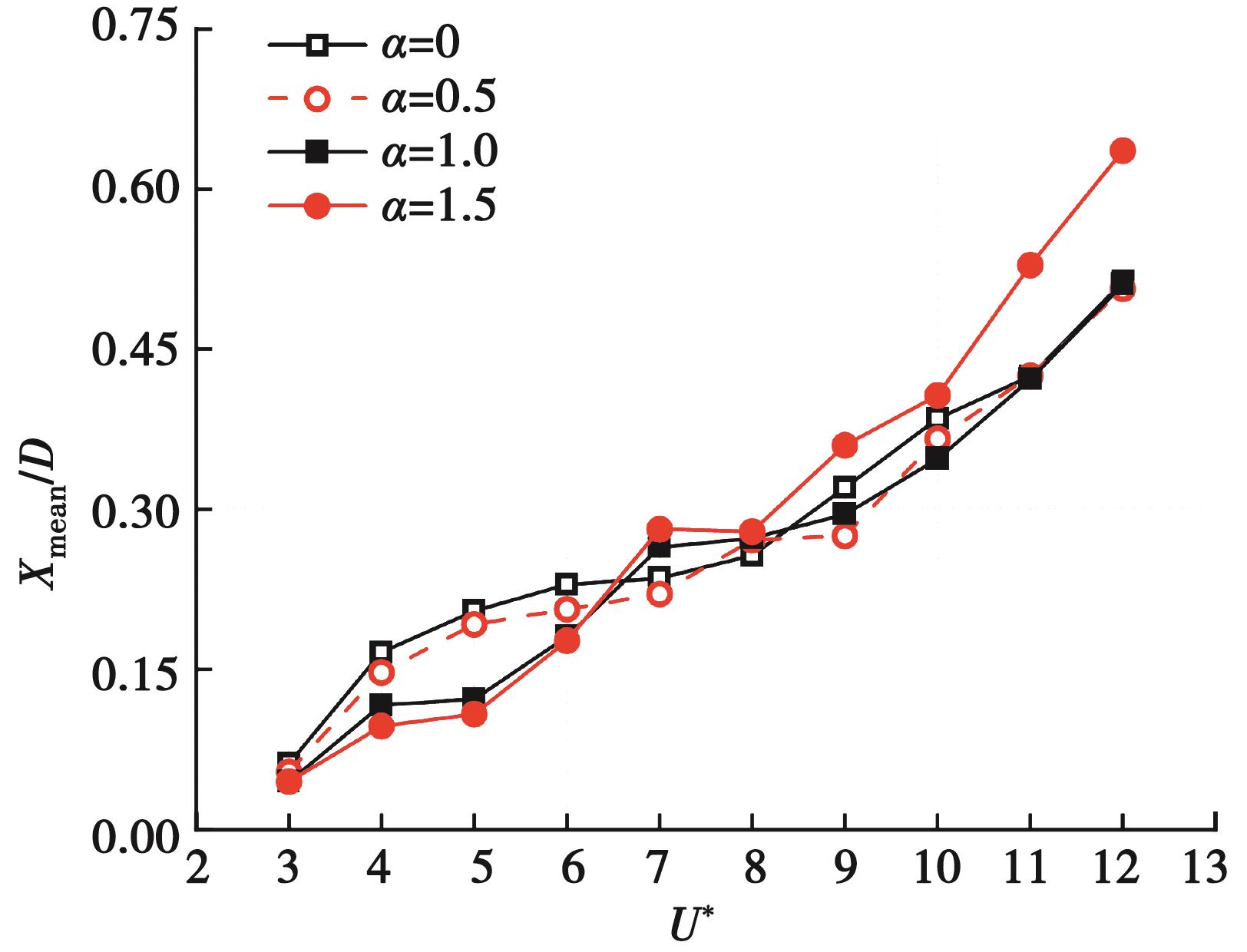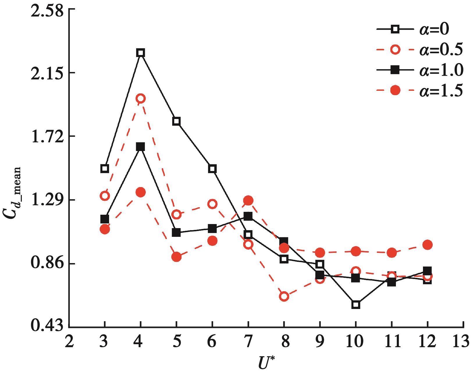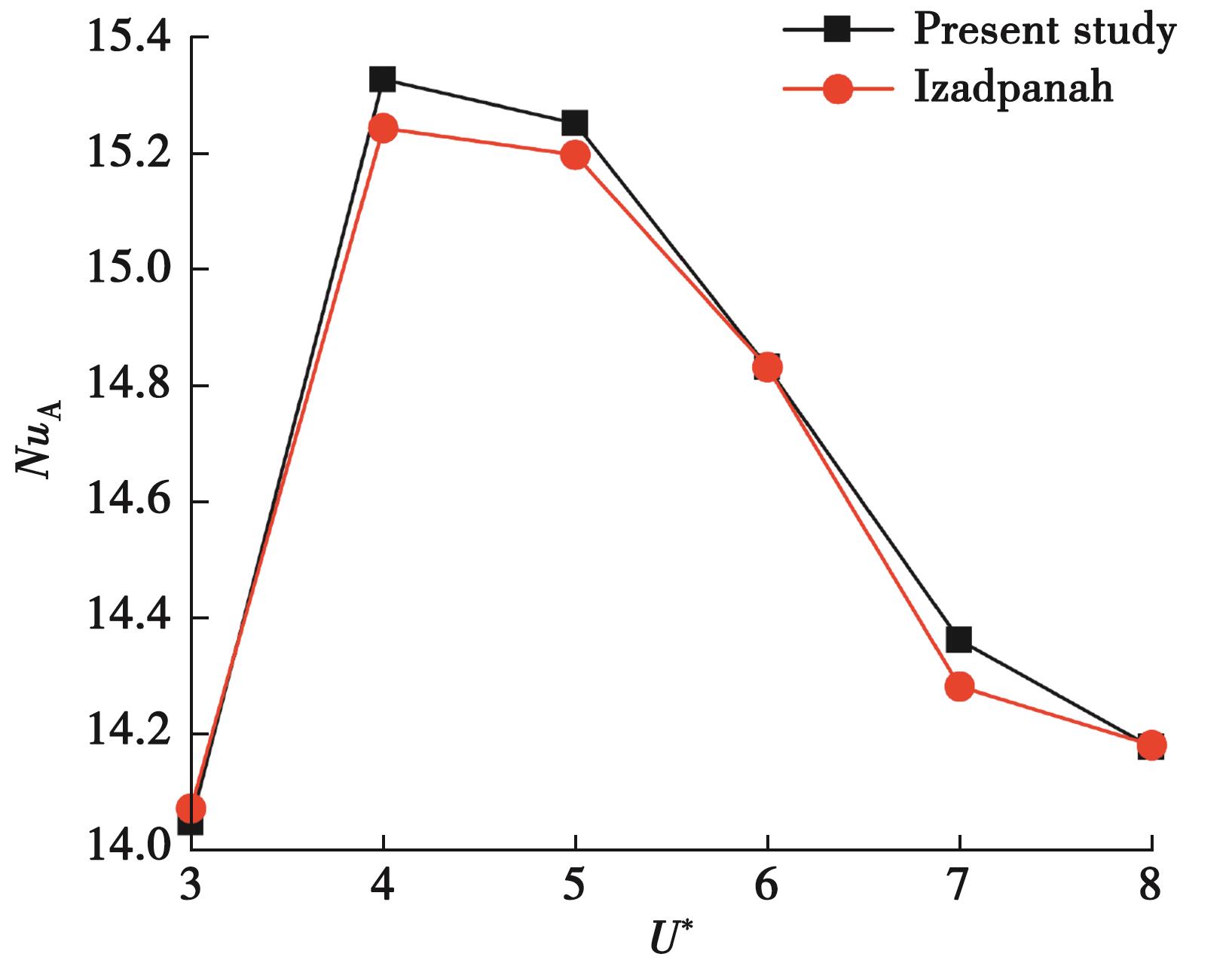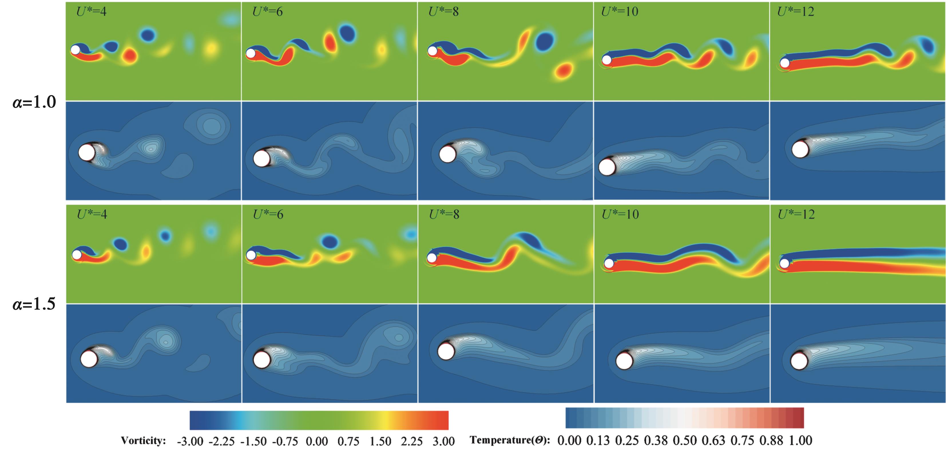 摘要:基于海洋深层流的特点,数值模拟了振荡来流条件下不同折减速度U*和旋转速率α对圆柱振动响应与传热特性的影响。结果表明,圆柱的x(A*peaks,x)和y方向(A*peaks,y)的振幅比存在多个极值点,且随着α增加,A*peaks,x的最大值增大,其对应的U*减小。位移和升阻力系数随着α和U*变化表现出显著差异,x方向的时间平均位移随U*的增加而增大,y方向平均位移和升阻力系数均随α的增大而增大。圆柱的运动轨迹在0≤α≤1.0时,无明显规律;在α=1.5 时,为圆环状。随着U*增加,圆柱平均努塞尔数增大,局部努塞尔数分布逐渐成圆形。随着α增大,涡旋脱落模式由2S转变为单排排列,尾迹逐渐拉伸并趋于U型模式。温度场结果表明,前驻点热交换较弱,后驻点热交换和局部传热效率显著提升。