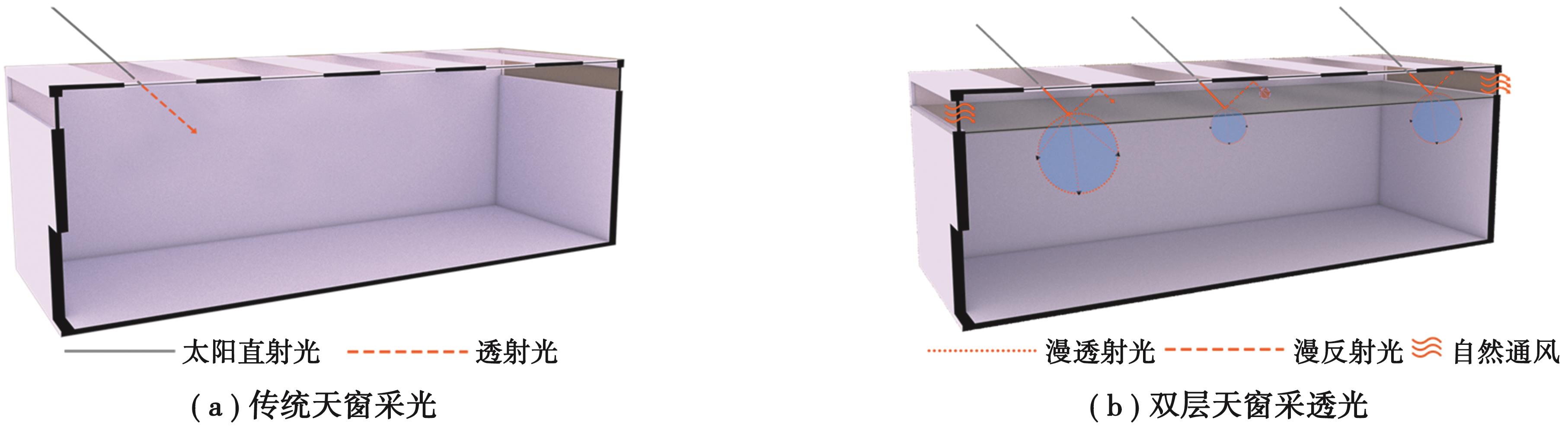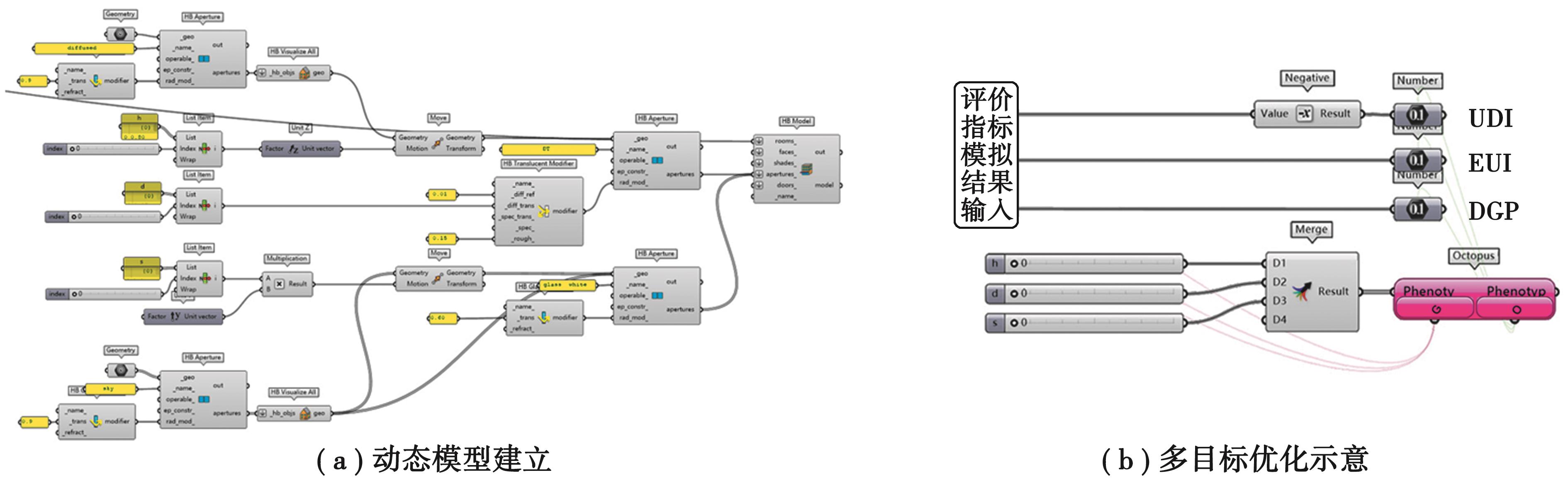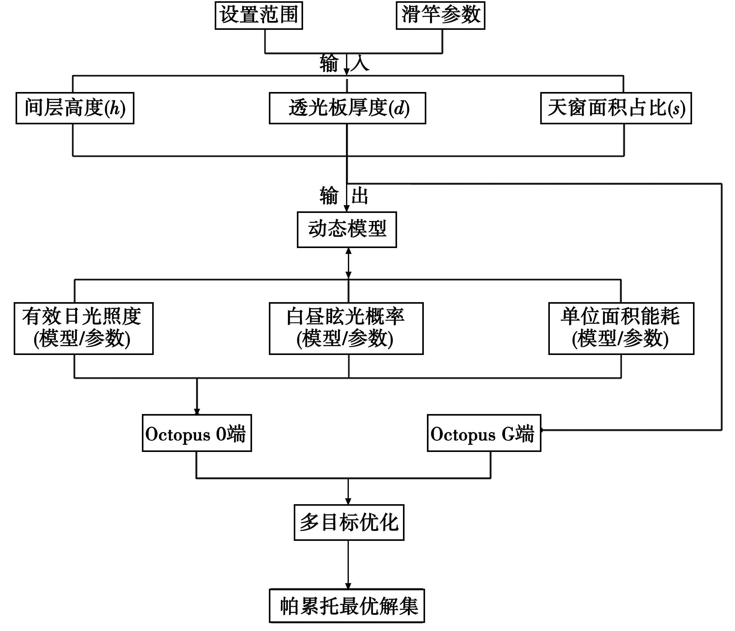 摘要:天窗的开设能显著提升室内自然采光均匀度及照度值,空气间层能减弱室内外热量的传递且优化室内的光环境质量;以邯郸市既有综合市场建筑空间为例,使用Grasshopper仿真平台将天窗与空气间层相结合设计出具有27种组合形态的双层天窗采透光系统,借助Octopus实现以能耗和光舒适为目标的采透光系统寻优,并将自变量和评价指标数据集导入Hiplot平台进行相关性分析,判断变量参数与光环境评价指标之间的相关关系。结果表明,当空气间层厚度为0.8 m、半透光材料厚度为0.005 m、天窗面积占比为0.3时,优化效果最佳;室内有效日光照度占比提升了10.97%,白昼眩光概率降低了39.40%,南北向出入口及其背景面亮度比分别降低了61.45%和45.10%,单位面积能耗降低了18.42%。同时,在参数变化范围内,空气间层高度与采光系数、有效日光照度及白昼眩光概率之间负相关,但相关性较弱;天窗面积占比与有效日光照度负相关、半透光材料厚度与白昼眩光概率正相关,且相关性较强;最后,分析了该系统应用的经济性、普适性和可行性,为城市大空间公共建筑室内光环境设计和改造提供了新的思路和构件形态。