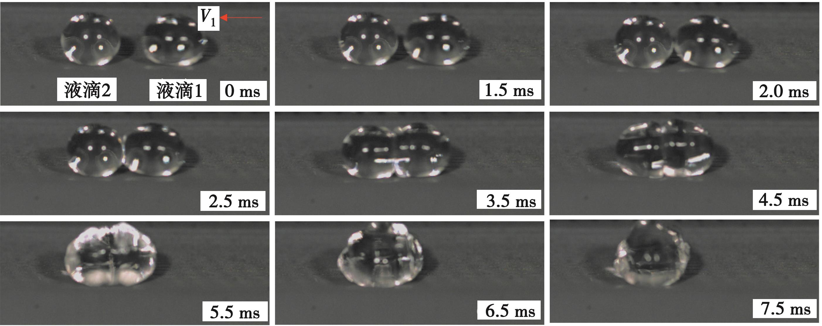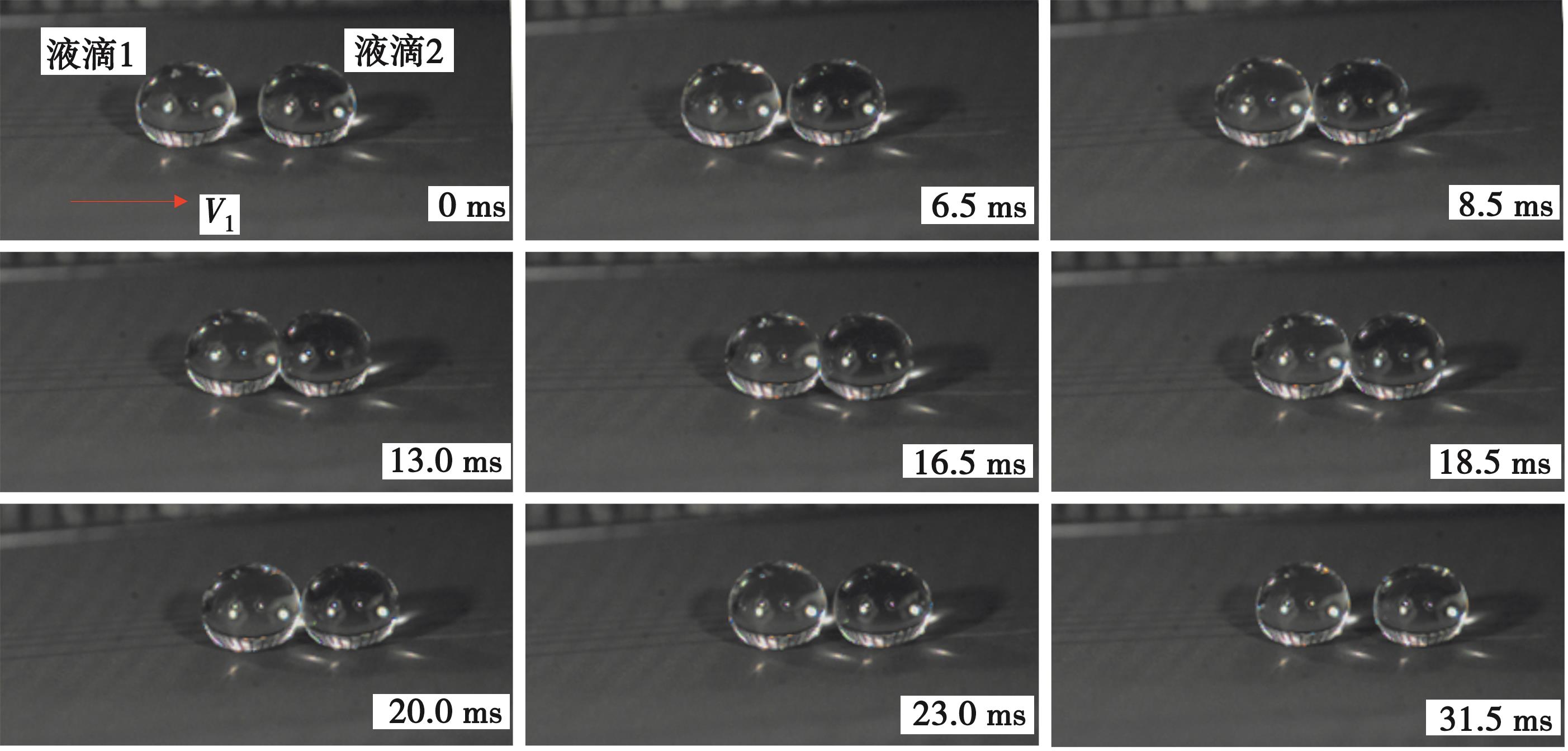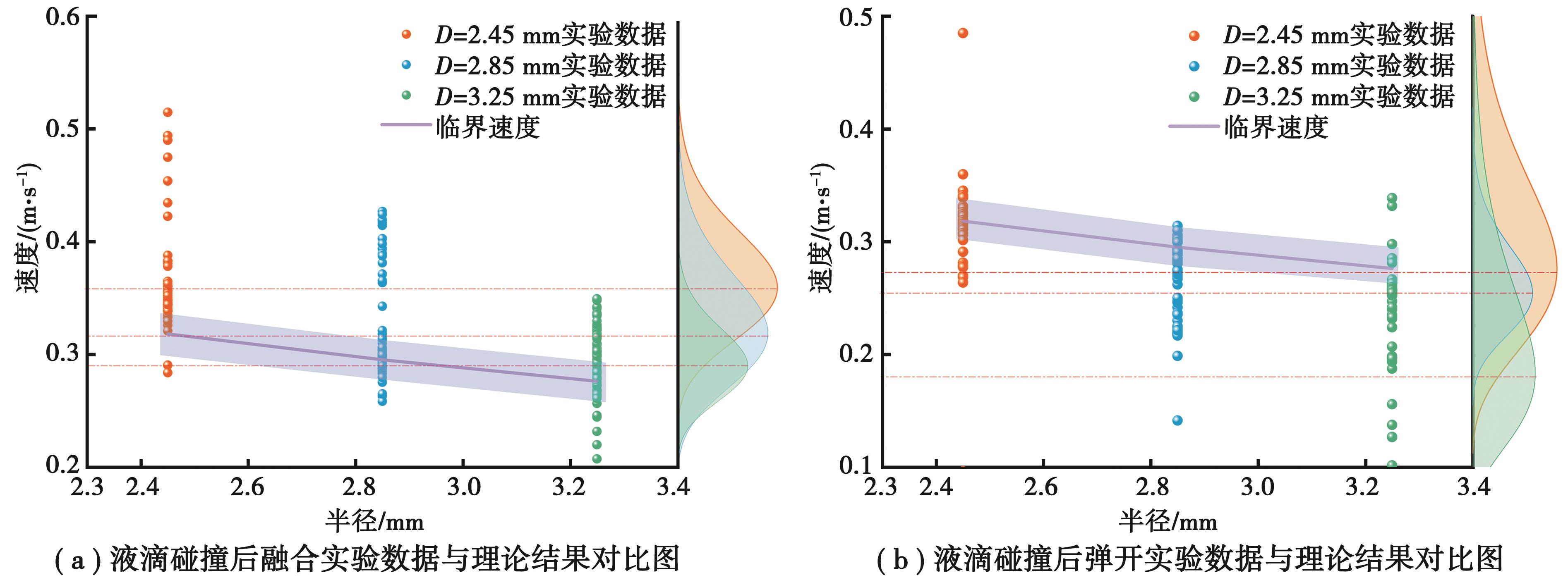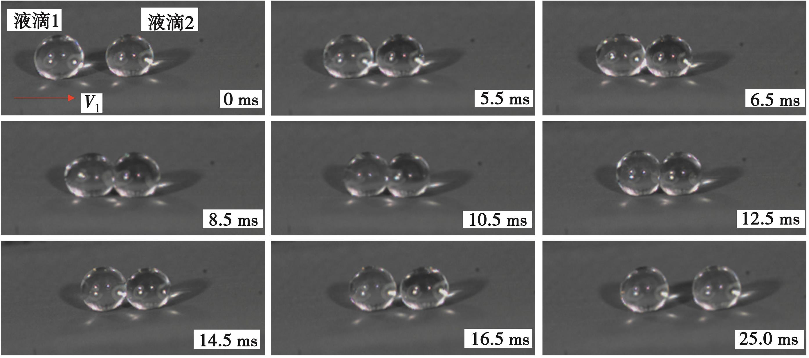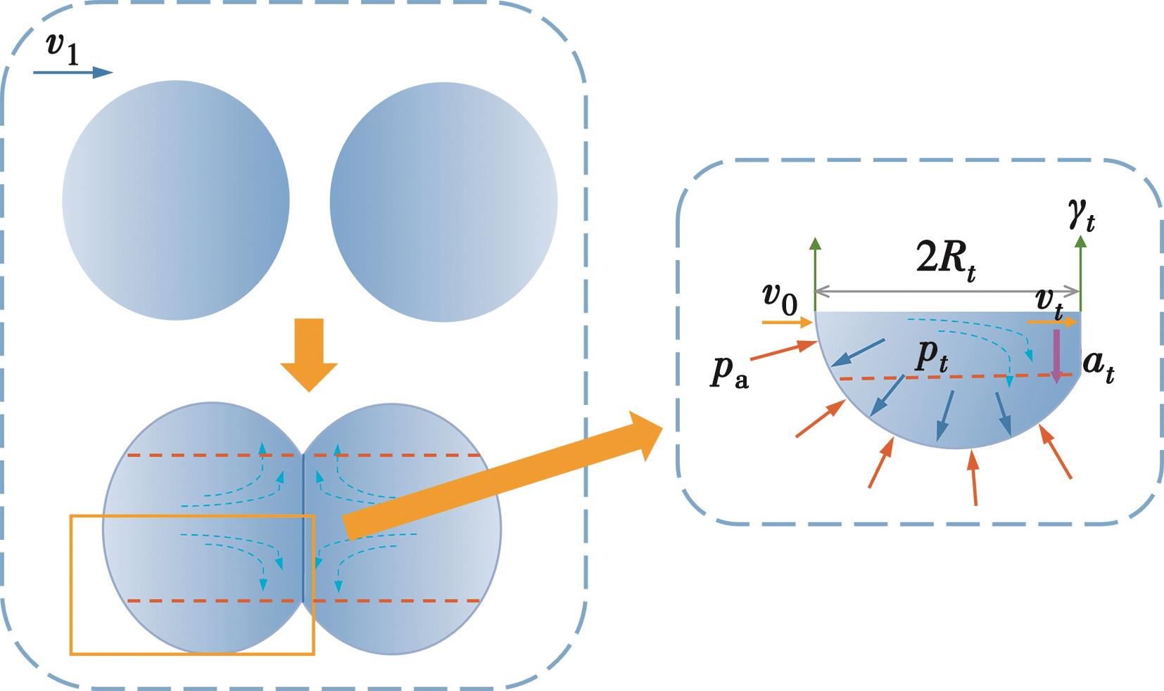 Abstract:This study investigates the influence of droplet velocity on the collision behavior of equal-sized binary water droplets impacting head-on on a superhydrophobic surface. Using a high-speed camera, the dynamic process of droplet collision process was recorded, and a theoretical model was developed to describe the critical conditions governing post-collision coalescence or bouncing. The model accurately predicts the critical velocity that determines whether droplets coalesce or rebound after collision. Experimental results show that as droplet velocity increases, the probability of coalescence also increases, while larger droplet diameters correspond to lower critical velocities for the coalescence-bouncing transition. During the deformation stage of collision, internal pressure within the droplets may exceed the surface tension threshold, resulting in coalescence. The proposed theoretical model demonstrates strong agreement with experimental observations and can effectively predict droplet behavior at various velocities. This provides a theoretical basis for controlling droplet collision dynamics, with potential applications in droplet manipulation, sensing, and microreactor technologies.