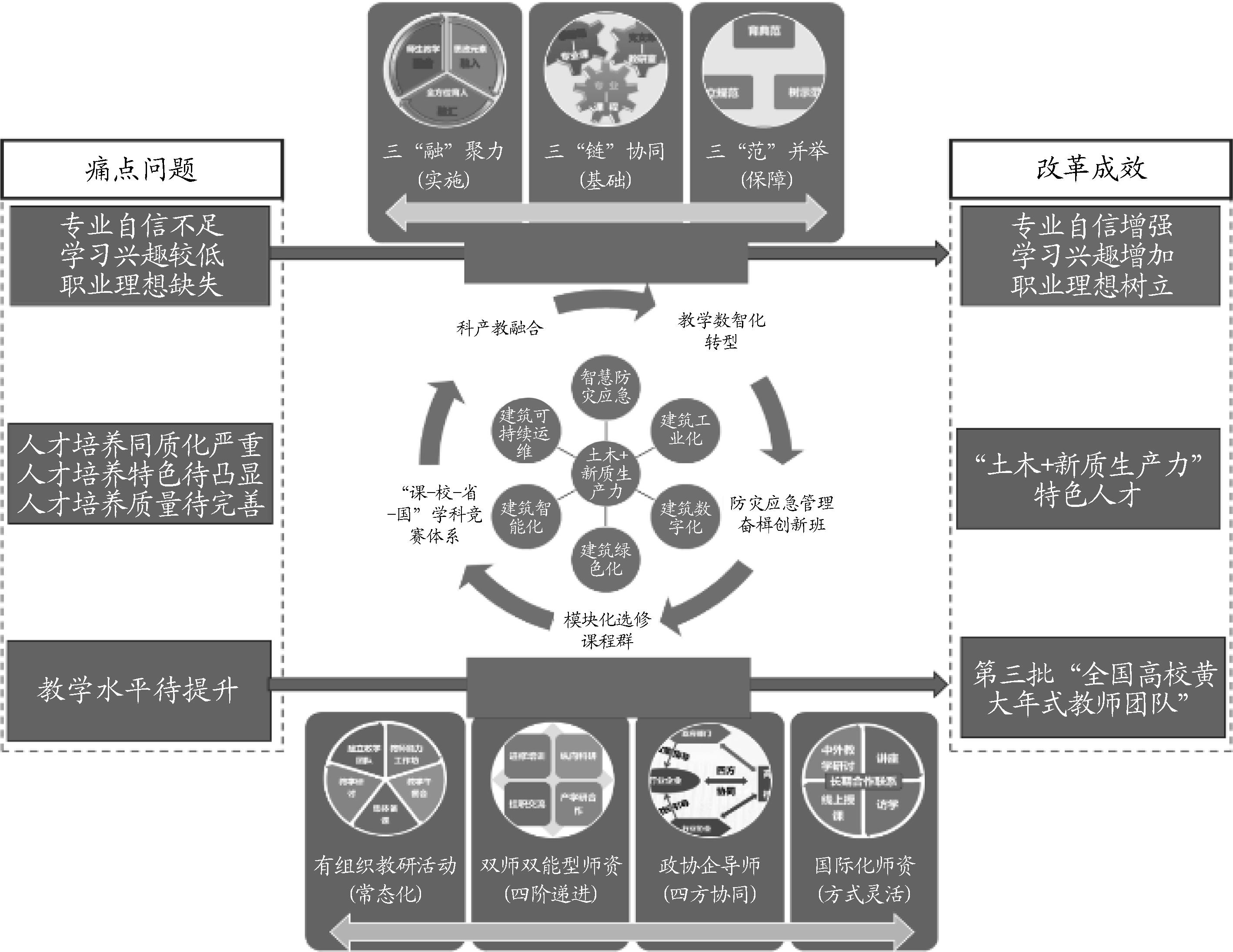 摘要:针对土木类专业人才培养面临的学生学习兴趣低、专业自信不足、职业理想缺失、人才培养同质化严重、缺乏建筑业“四化”人才培养师资等问题,东莞理工学院从专业课程思政、特色能力培养、教师团队赋能三个方面改革创新,构建了地方应用型高校“土木+新质生产力”特色人才培养模式。通过三“链”协同、三“融”聚力、三“范”并举,构建立体化专业课程思政育人体系,增强学生的专业自信和学习兴趣,激发了其职业理想;通过创设应急管理奋楫创新班、开设模块化选修课程群、构建“课—校—省—国”学科竞赛体系、推行科产教融合等举措,促进学生掌握智慧防灾应急、建筑工业化/数字化/绿色化/可持续运维等方面的专业知识技能;通过“内培外引、专兼结合”双轮驱动,打造高水平“土木+新质生产力”师资队伍。