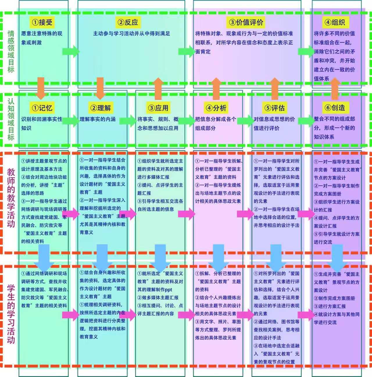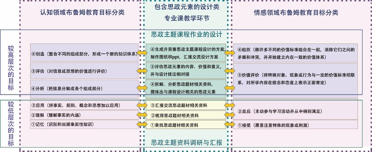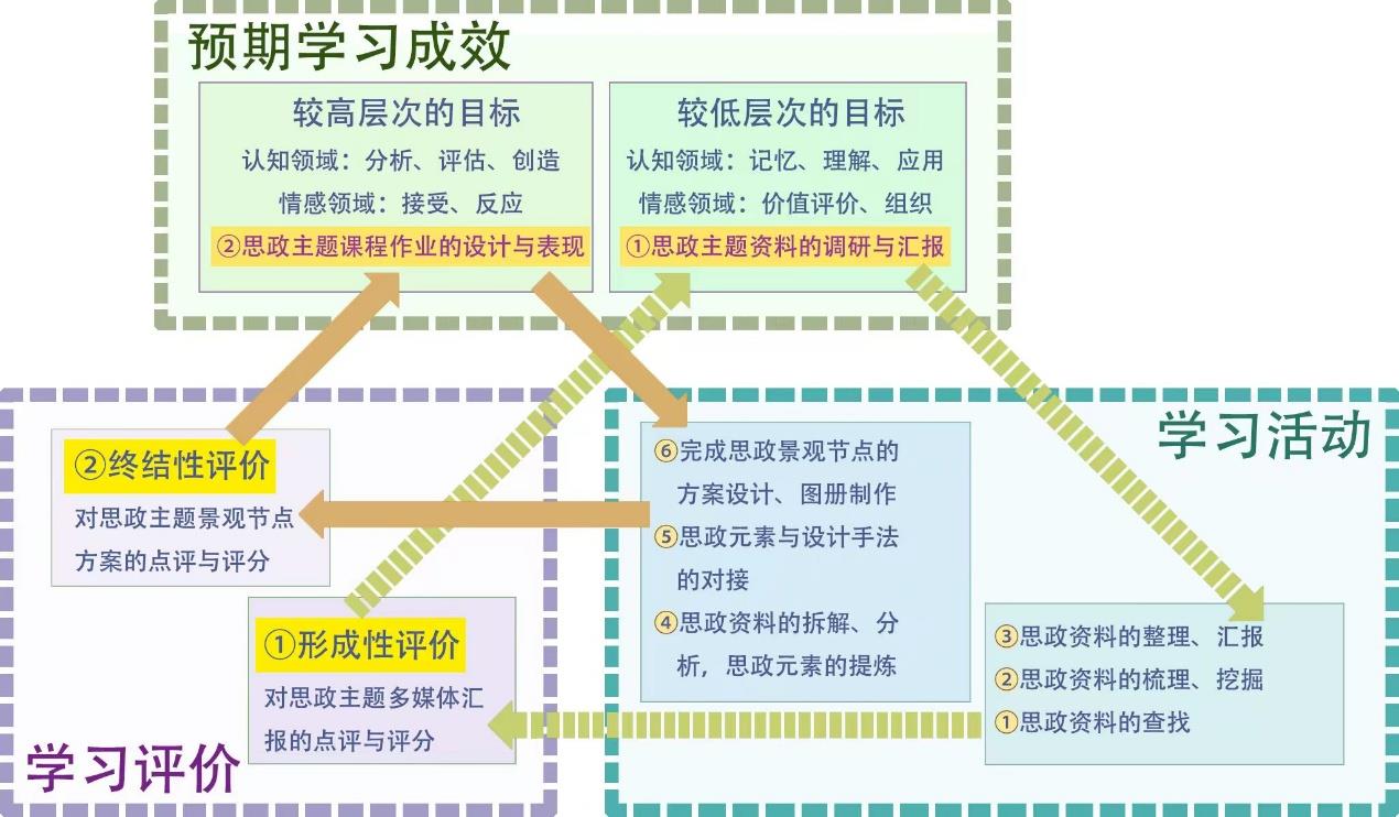 摘要:当前高校专业课课程思政建设的难点在于思政元素融入要求高、学生积极性调动难、思政教学效果考核不便等。以城市景观设计为案例,基于布鲁姆教育目标分类理论,在设计类专业课的教学中嵌入思政主题设计模块,把学生收集梳理的背景资料、汇报调研成果、拆解并重组设计元素、完成设计方案、制作图纸等专业学习环节,与“记忆、理解、应用、分析、评估、创造”6个认知目标层次,以及“接受、反应、价值评价、组织”4个情感目标层次相对应,逐层展开课程思政教学设计,并分级进行思政学习的考核,能够实现分层攀升、以学为中心的课程思政教学目标,促使学生对“思政”进行自主学习,达到专业教育与思政教育双向共促的目的。