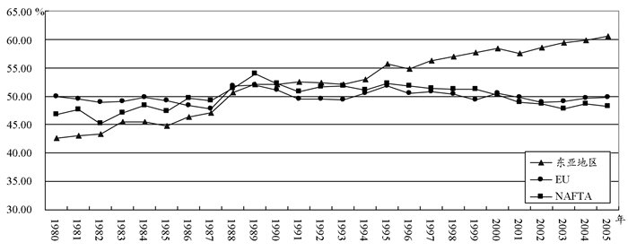 图 1 东亚地区、EU、NAFTA三大自由贸易地区的中间零部件产品的贸易比率变化 资料来源:根据IMF“Direction of Trade Statistics”贸易数据库整理。 |