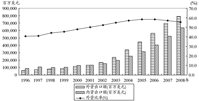 图 2 外资企业在华出口额及其比重的变化 资料来源:根据中国海关统计年鉴(1997-2009年)整理。 |