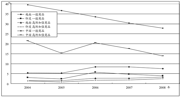 中国作为重要的消费市场和生产基地,吸引越来越多的跨国公司进入中国进行制造业产业布局与生产合作。但是随着中国本土企业市场竞争力的不断增强和世界各国跨国公司的不断进入,其市场发展潜力和竞争性也日益严峻。许多跨国公司正逐渐把生产基地和销售市场扩展到其他具有发展潜力和生产可能性的地域。根据日本经济产业省近年来对500家日本企业的海外扩大投资统计调查[10](图 3),虽然目前日本企业在华的投资额仍在不断增长,但是无论是一般日用商品还是高附加值产品,近年来越来越多的日本企业正逐步减少在华的扩大投资。与之相对应的,越来越多的日本企业逐步拓展和扩大在越南和印度等新兴市场的生产投资比例[10]。