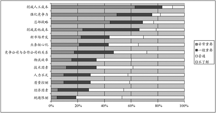促使企业开展外包活动的影响因素也是多种多样。根据研究调查,跨国公司开展外包活动的目的各不相同(图 4),主要驱动力包括降低生产成本、提高组织效率、加强市场竞争力等方面[15]。跨国公司通过世界范围内的外包活动,能够专注于企业的核心竞争力,提高产业组织效率,降低产品生产成本。