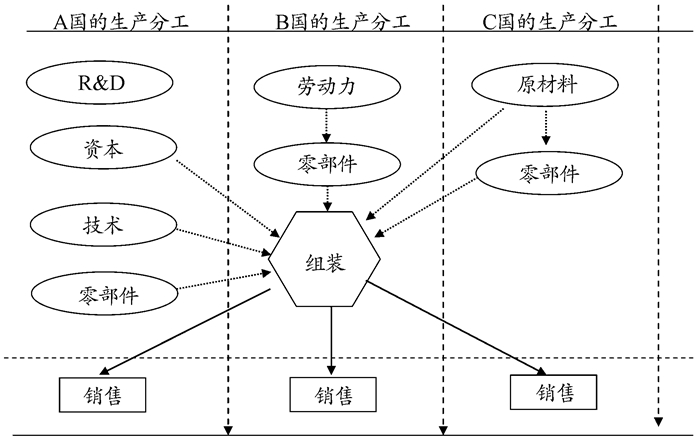 传统的国际贸易比较优势理论与劳动分工理论主要集中于分析工农业之间、各个产业间的贸易行为。可是在现代产业发展中,由于零部件的模块化独立生产成为可能,产业分工与专业化合作日益精细,产品的零部件以及生产流程可以逐渐建立标准化的生产规范,使得在同一产业内部,不同生产要求和生产过程的零部件可以在不同地区进行分段化生产[16],其生产网络体系结构如图 5所示。特别是近年来低成本的通讯技术和大规模运输技术发展,以及WTO成员国数量的增长,跨国公司根据生产过程的劳动集约度、资本集约度、原材料集约度以及劳动力工资水平等生产要素,将许多中间零部件产品以及最终组装生产等各个生产业务流程分散到世界各地。通过在全球范围内寻找最佳的零部件生产基地,进行分段化生产的产业布局,建立了世界范围的最优化生产网络体系。