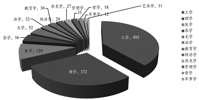 1 279篇优博论文分布在13个学科门类(图 2),分布在工学、理学和医学三个学科门类的论文数排在前三名,分别占获奖论文总数的38.70%、29.09%和9.38%。理工类共占总数的67.79%,超过2/3,明显高于其他学科门类,反映了中国经济社会发展在向工业化、信息化转型时期的知识需求和产业需要。但是,这种过于集中的获奖分布,也显示出中国学科发展不均衡、结构不合理等问题,不利于国家整体科研环境的良性发展,同时,也在一定程度上阻碍了人文社科类学科的发展。