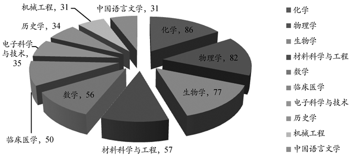 获奖数排在前十名的一级学科及其优博论文总篇数如图 3所示。化学、物理学和生物学分别以86篇、82篇和77篇高居前三位,并且都属于理学,充分显示出理学基础学科是中国的优势学科,凸显出学科发展的不平衡。