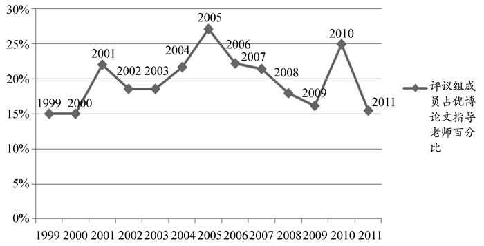 在比重最高的2005年,27.08%获得优博论文的指导教师是当年的评议组成员,即使是最低的1999年和2000年,优博论文指导老师中担任评议组成员的比重也达到15%。